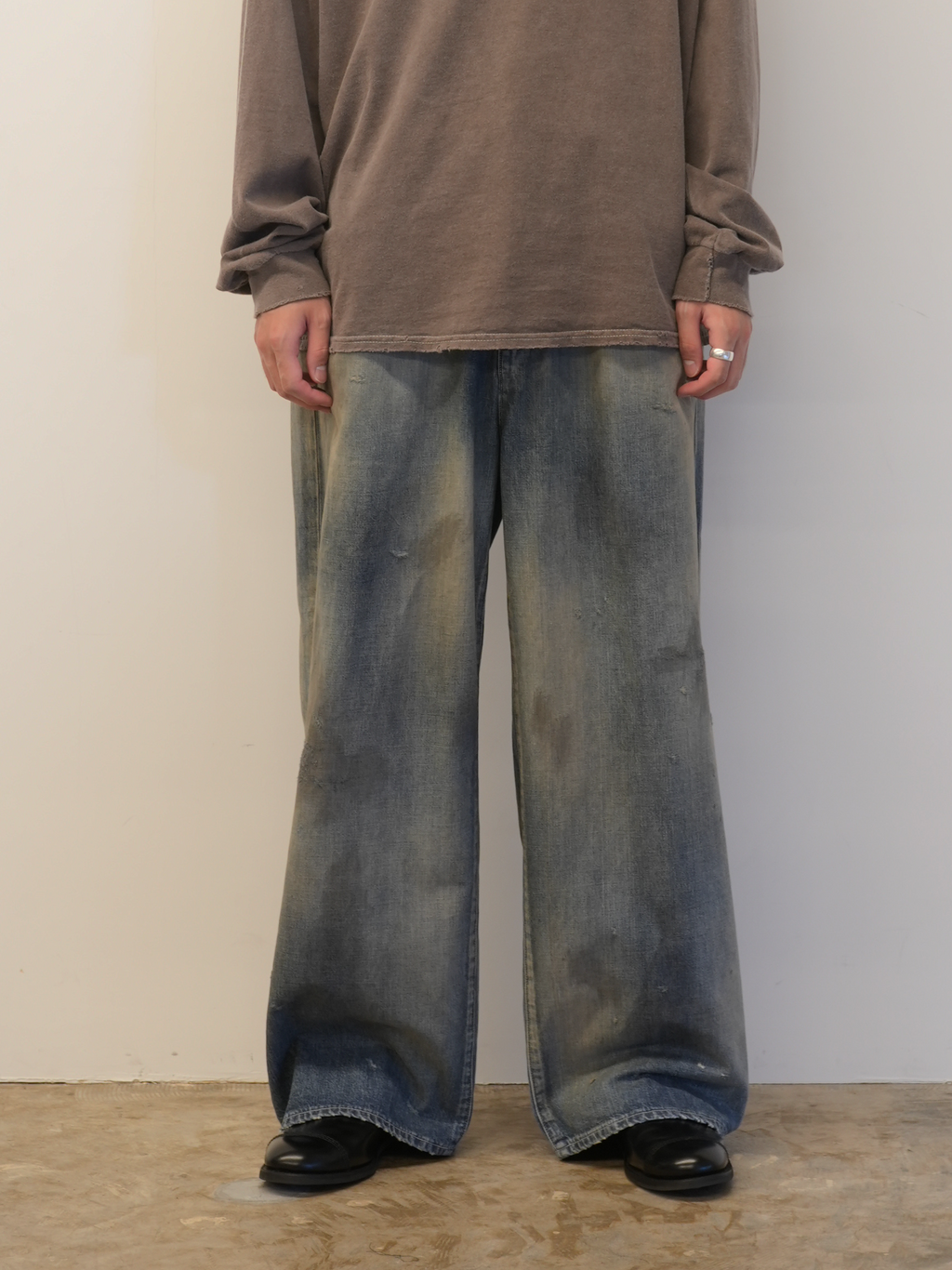 In contrast to the beautiful silhouette of the standing figure, the processing emphasizes the expression as ANCELLM. In INDIGO/BLACK, a gradation is created by fading the denim with hand rubbing against the strong-colored denim, and in SAND, a subtle pink color is layered to create a color that cannot be found anywhere else.