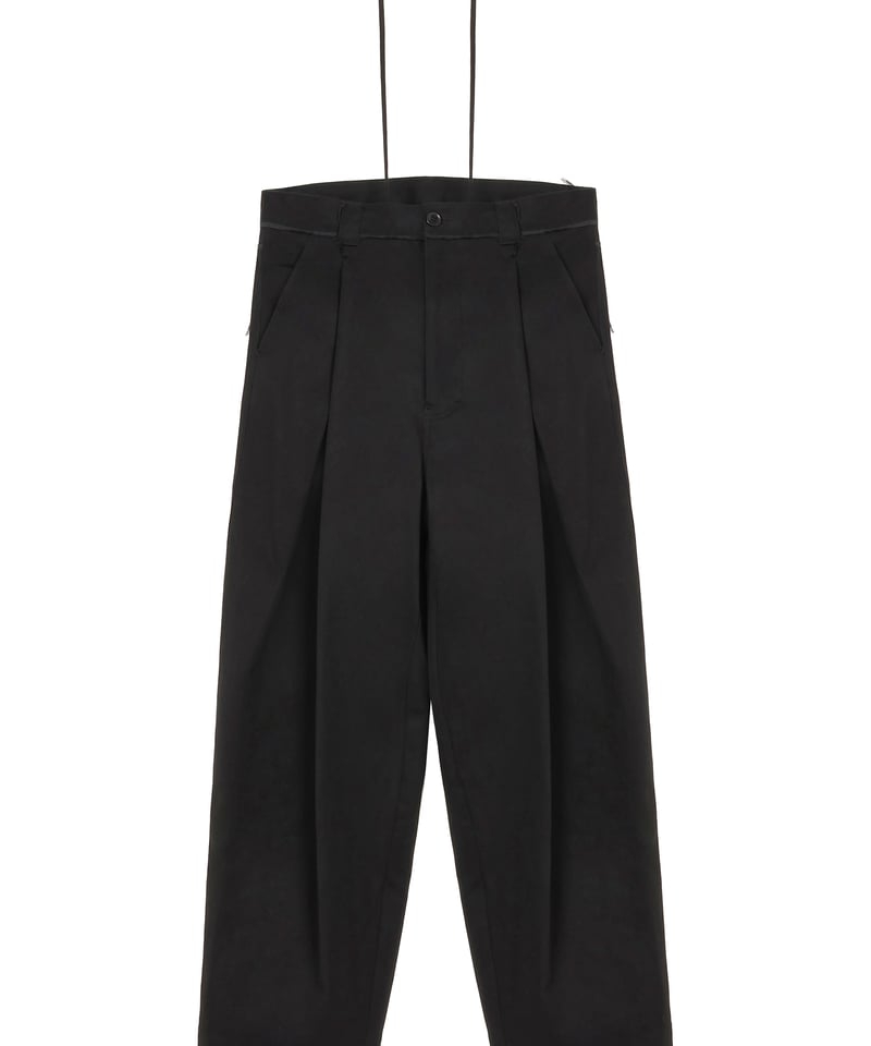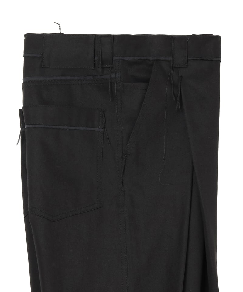 -Layered tuck pants made of cotton twill, a hybrid material that reproduces dead stock fabric using modern technology.