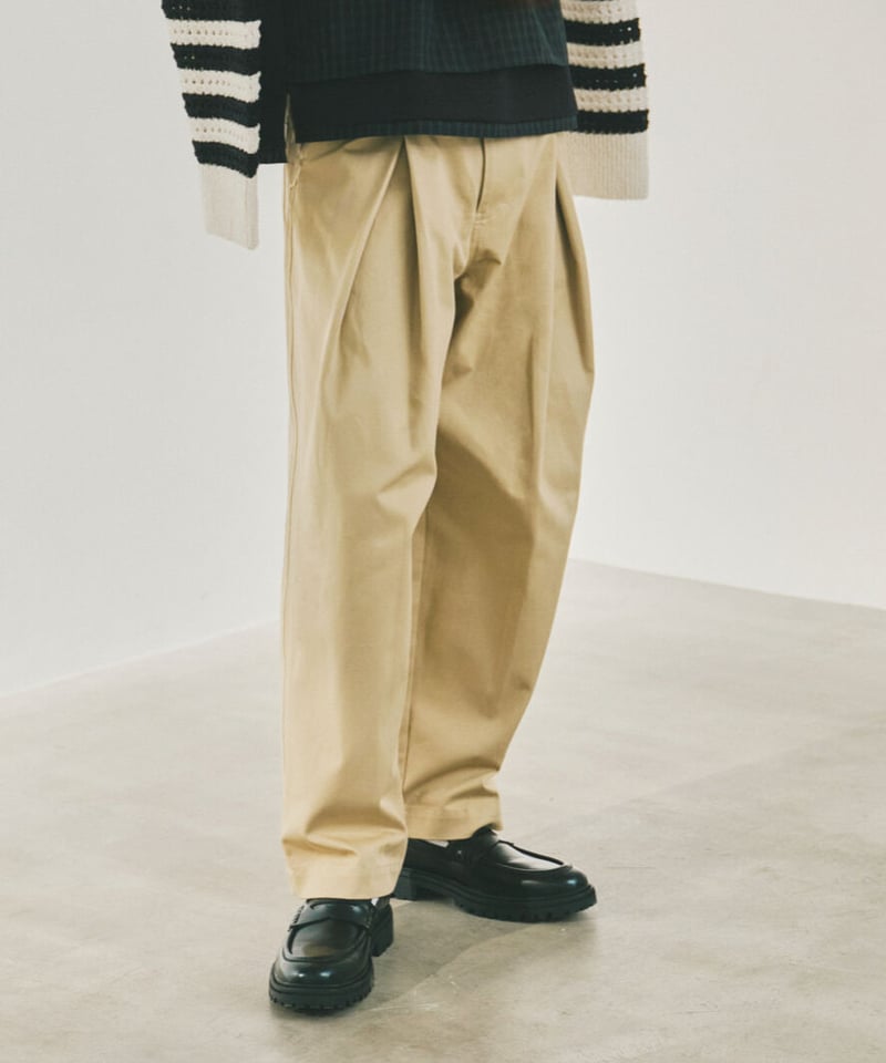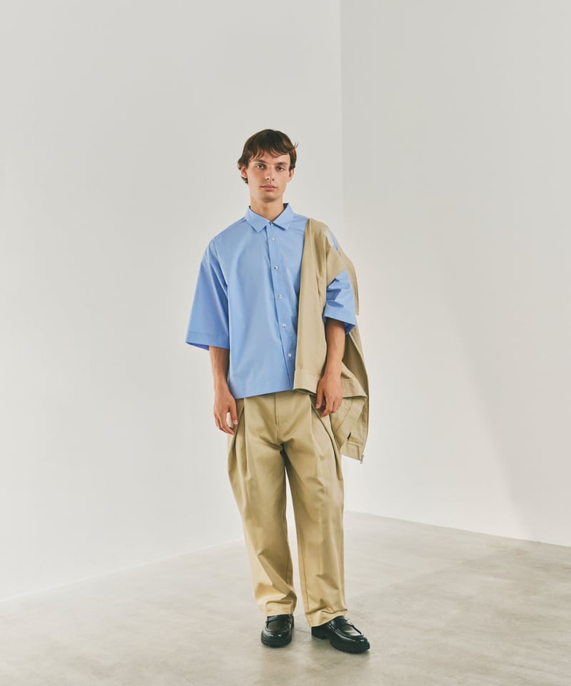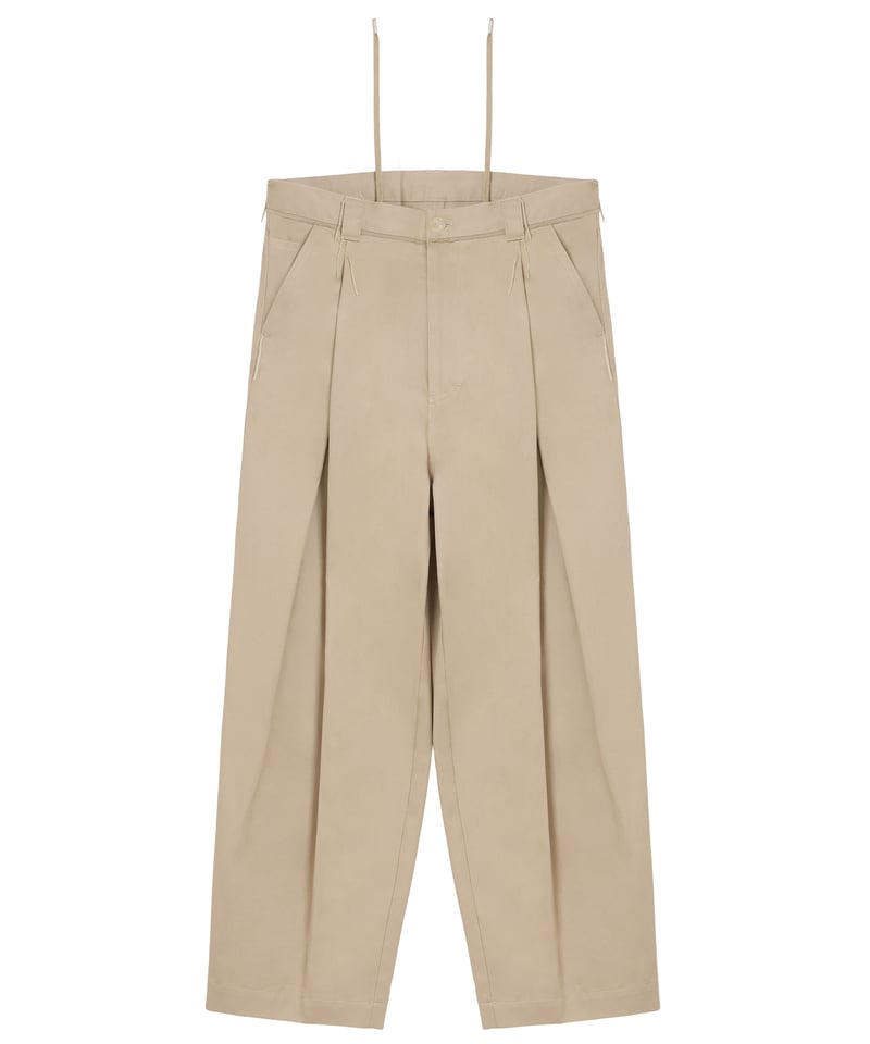 -Layered tuck pants made of cotton twill, a hybrid material that reproduces dead stock fabric using modern technology.