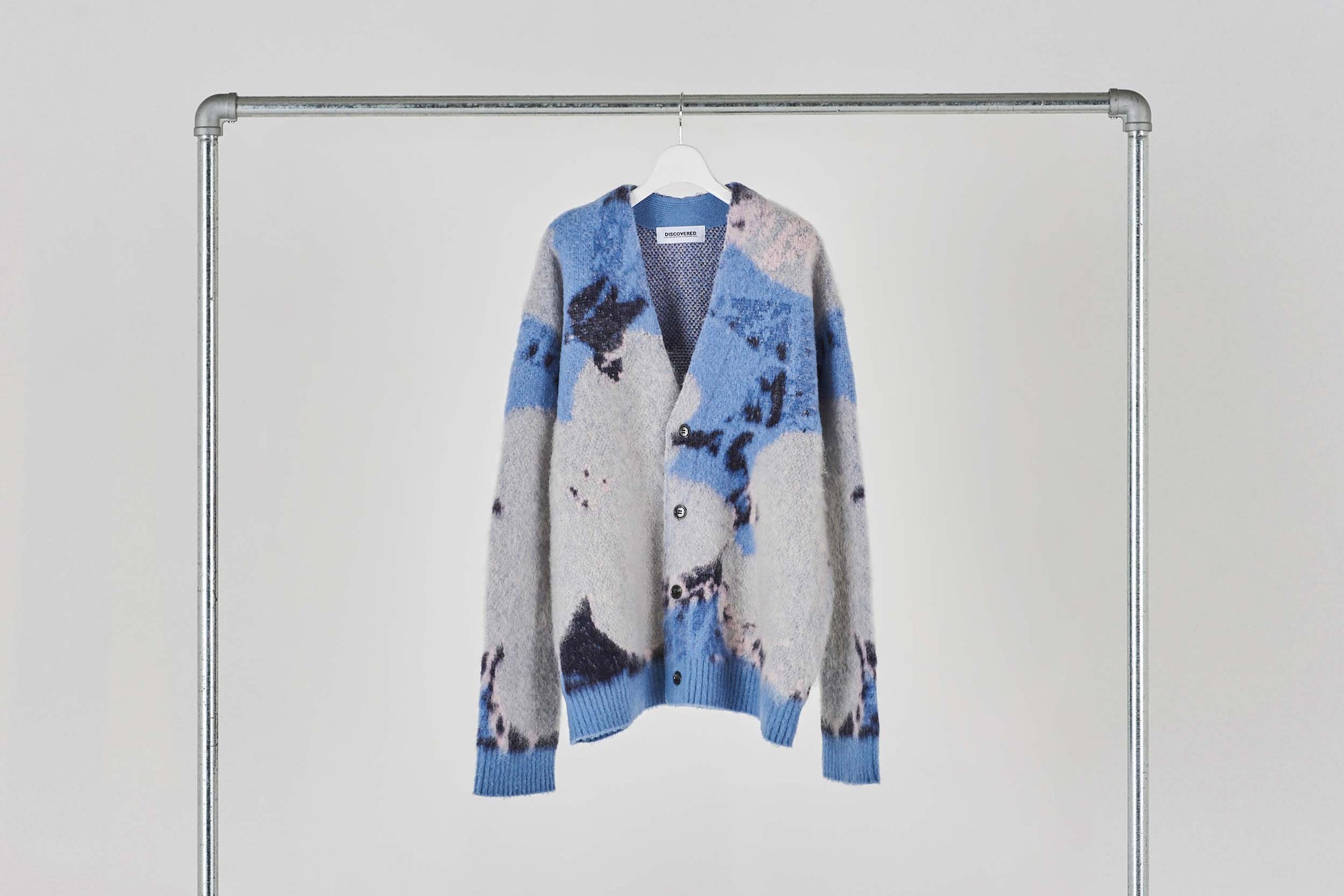 Jacquard knit cardigan combining kid mohair yarn, nylon blend yarn, and wool yarn. Each piece is brushed and damaged one by one, and the "smooth to the touch and elegant luster" of the mohair yarn is used.