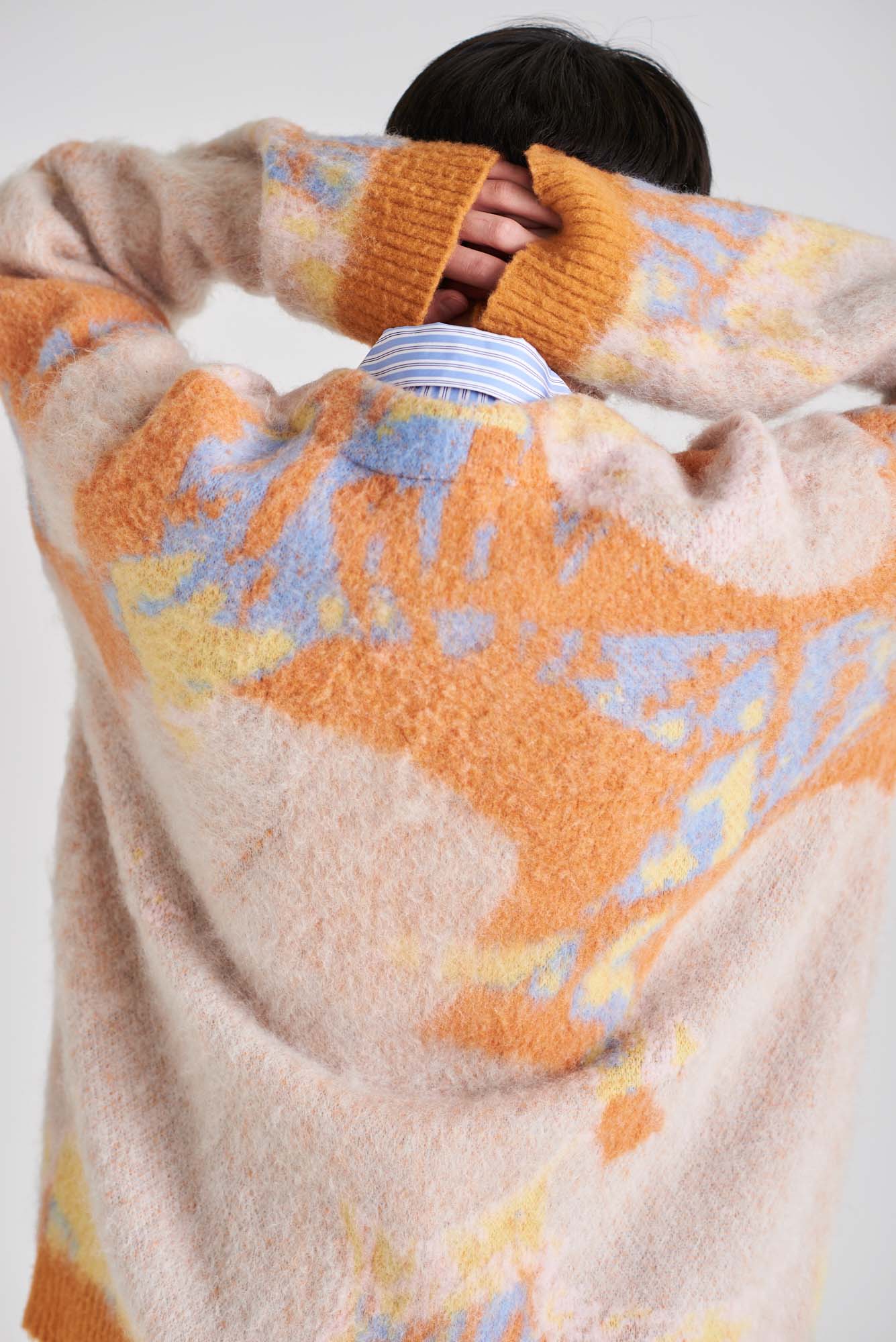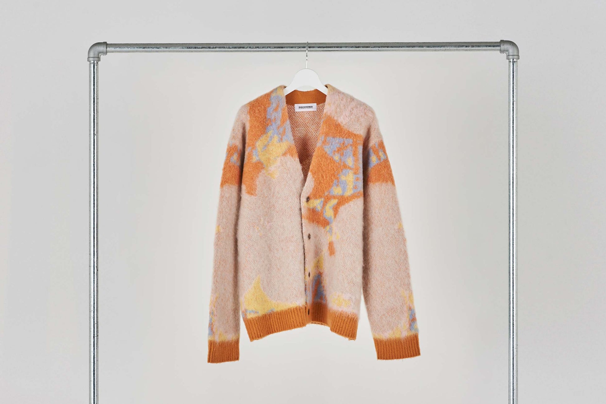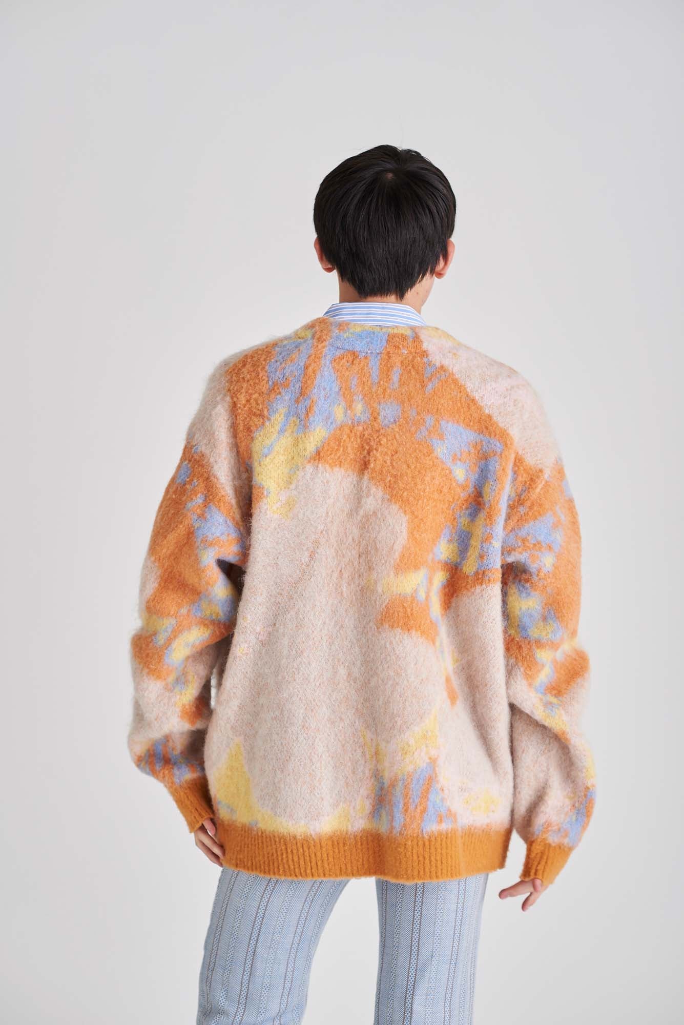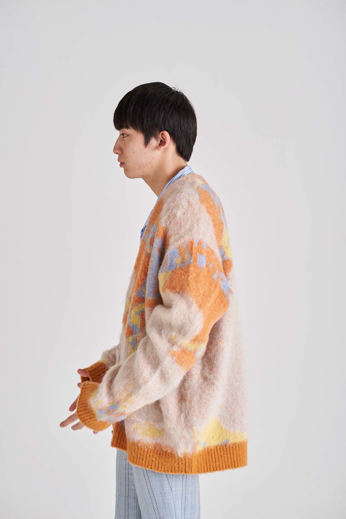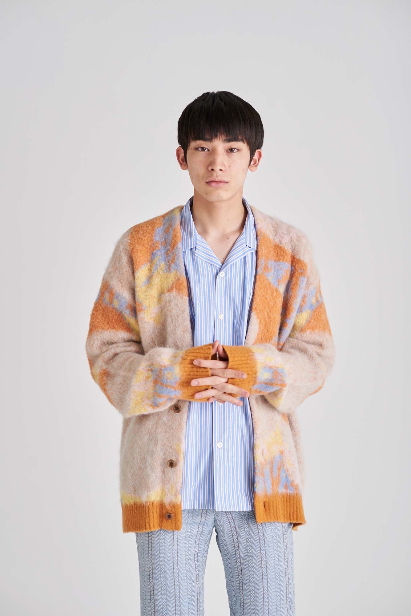 Jacquard knit cardigan combining kid mohair yarn, nylon blend yarn, and wool yarn. Each piece is brushed and damaged one by one, and the "smooth to the touch and elegant luster" of the mohair yarn is used.