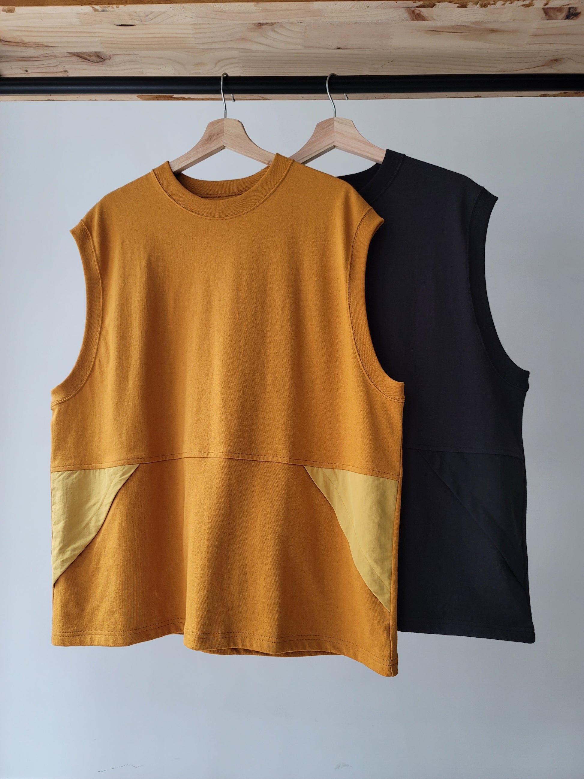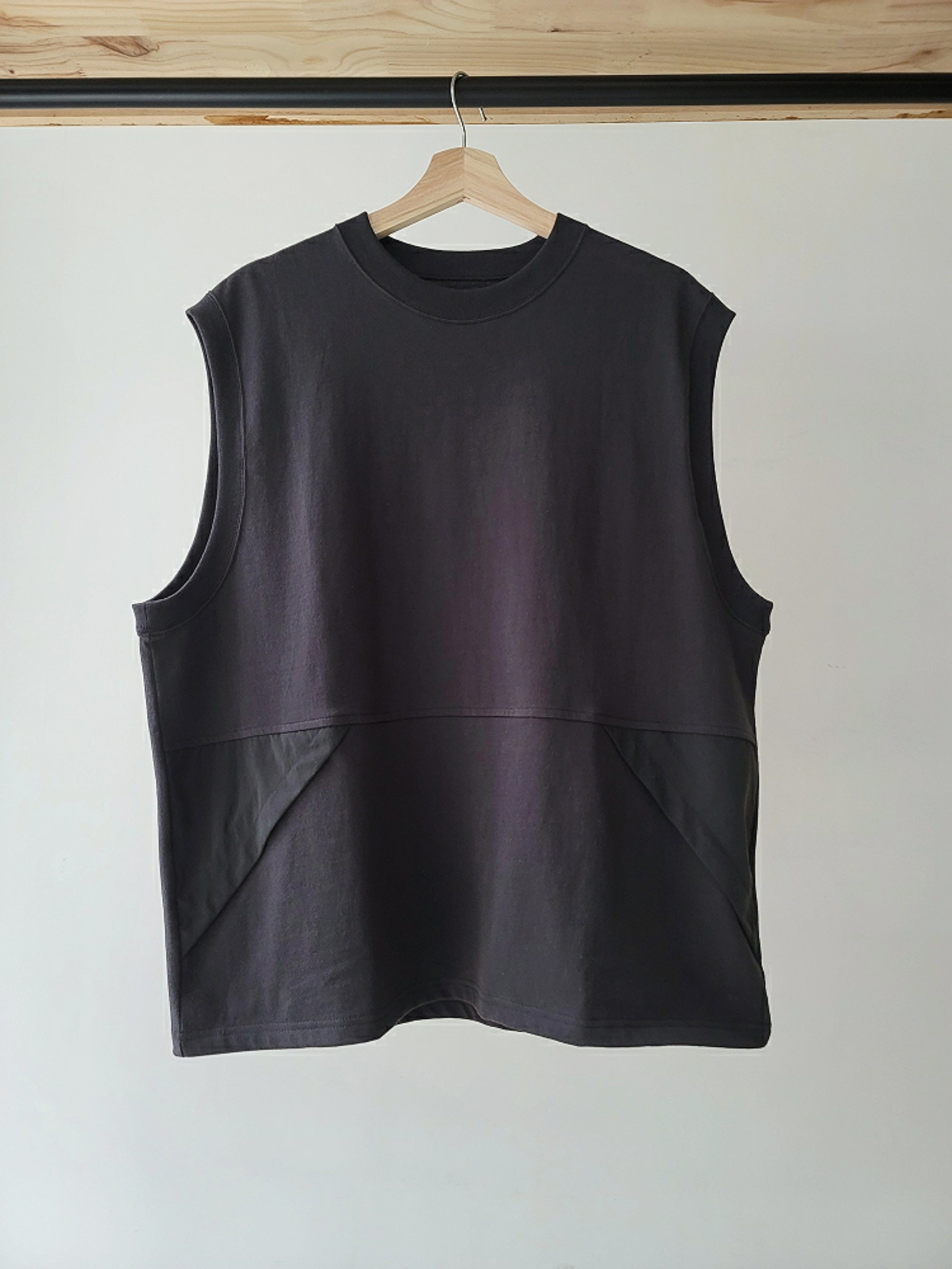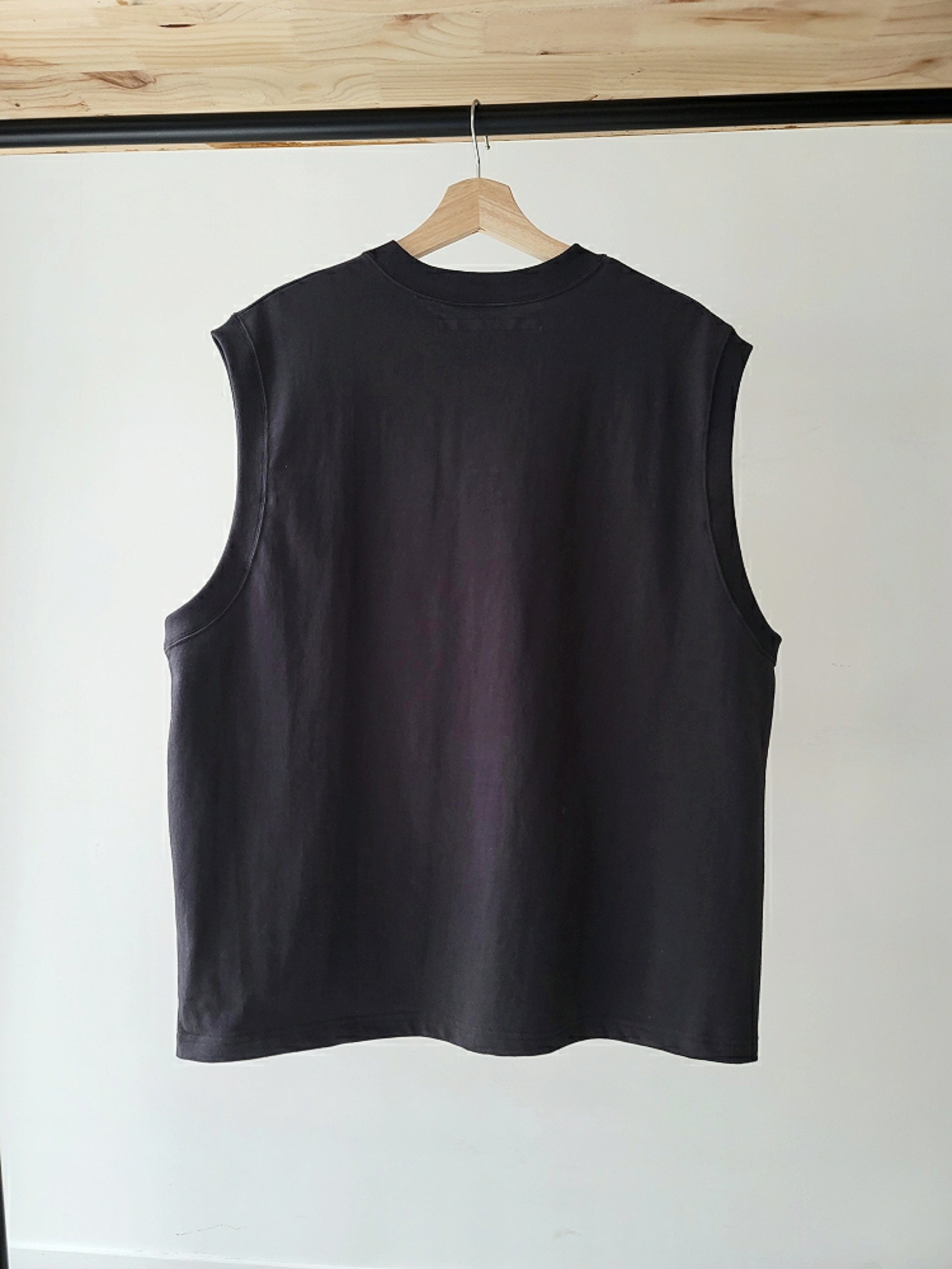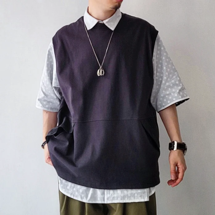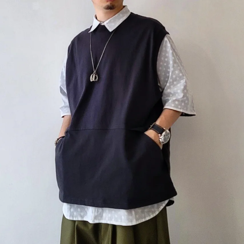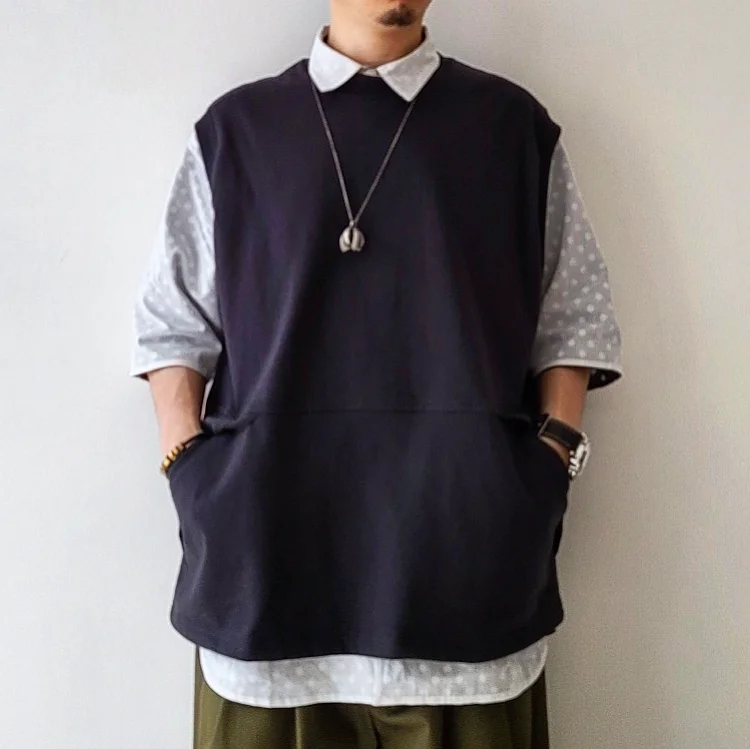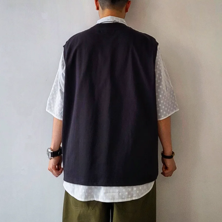 - A cut-and-sew vest that uses a solid and moderately thick rice cotton fabric.