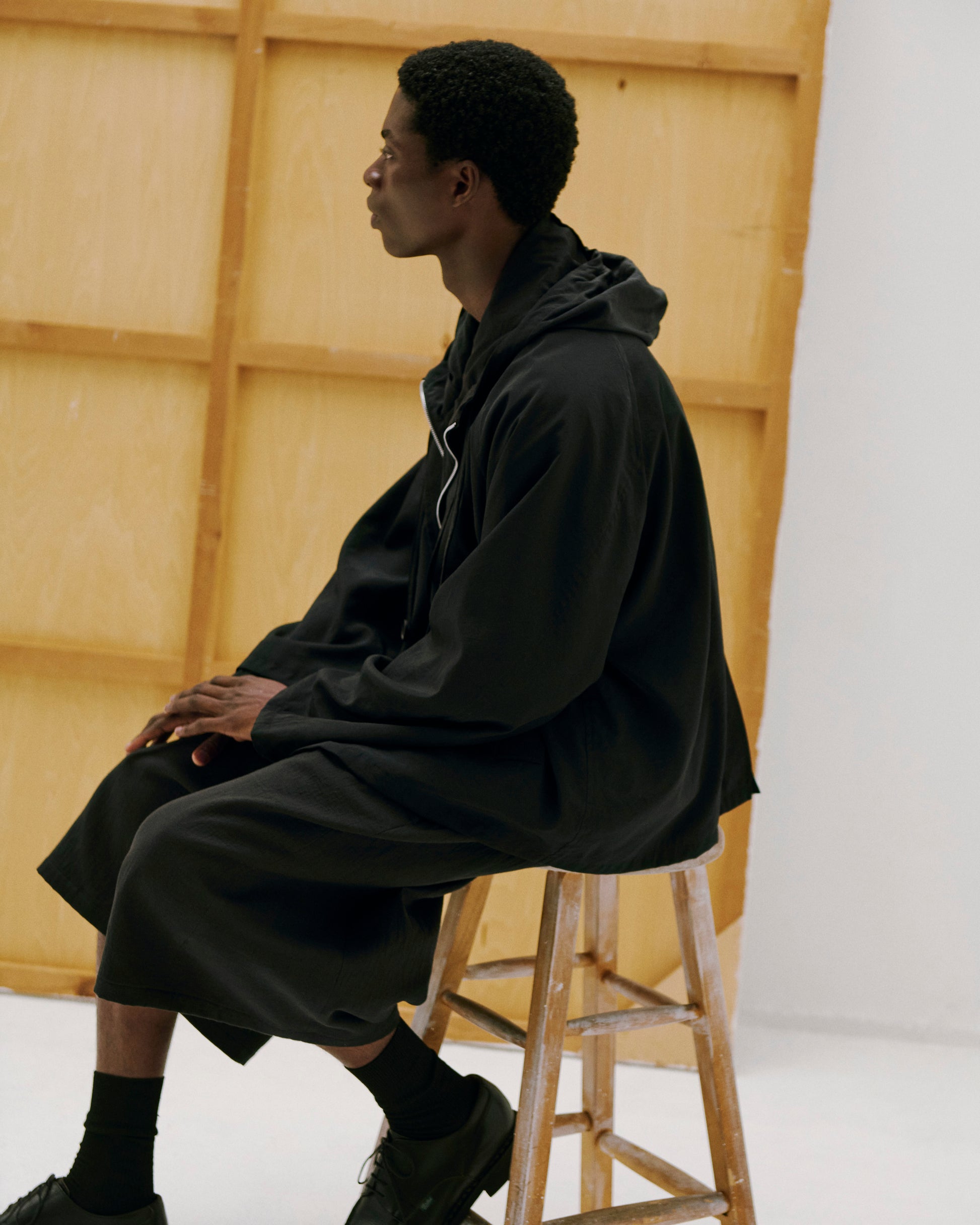 The volume of the hood can be adjusted using the spindle at the neck. The length is slightly longer, but the silhouette can also be adjusted using the spindle. The generous length brings out the charm of the material.