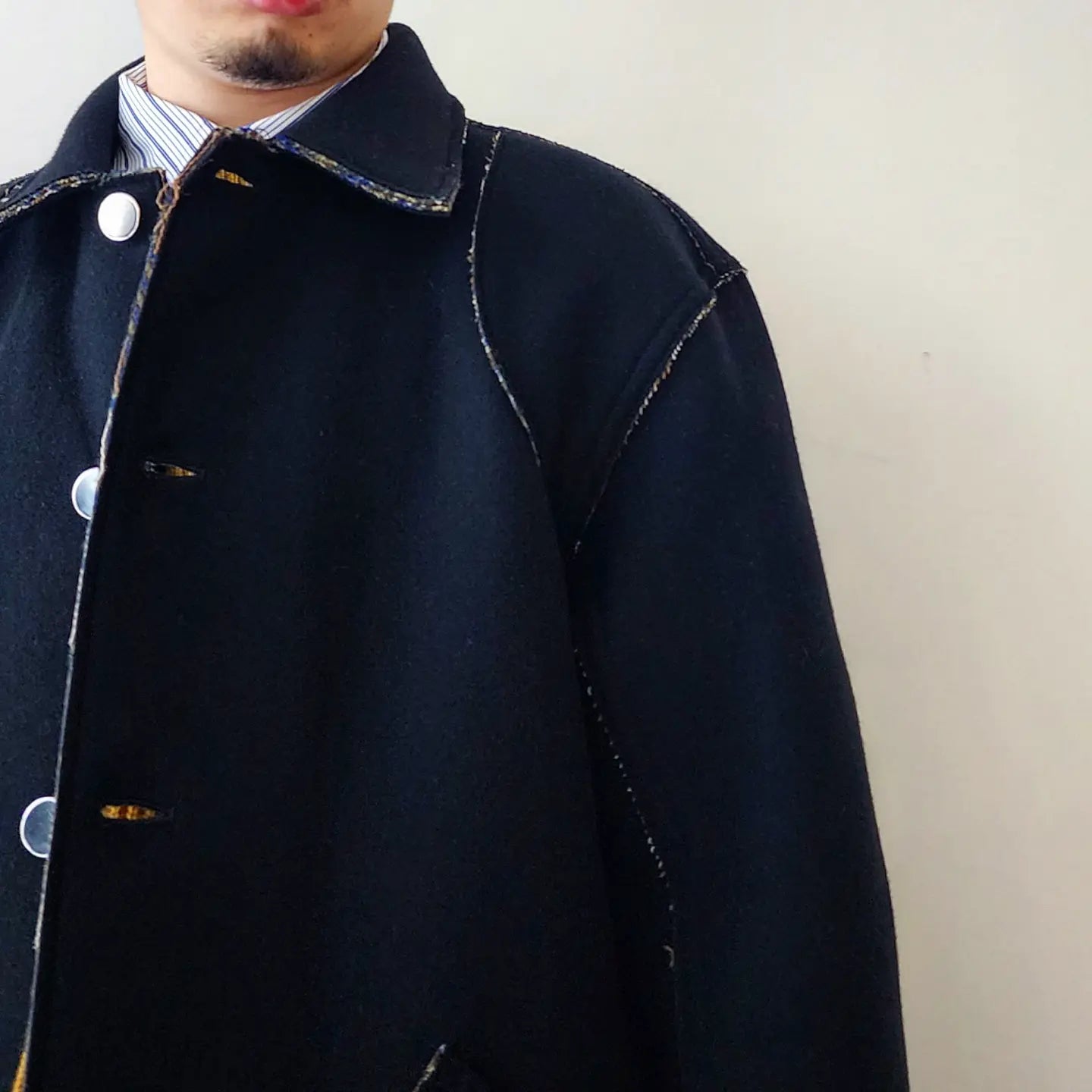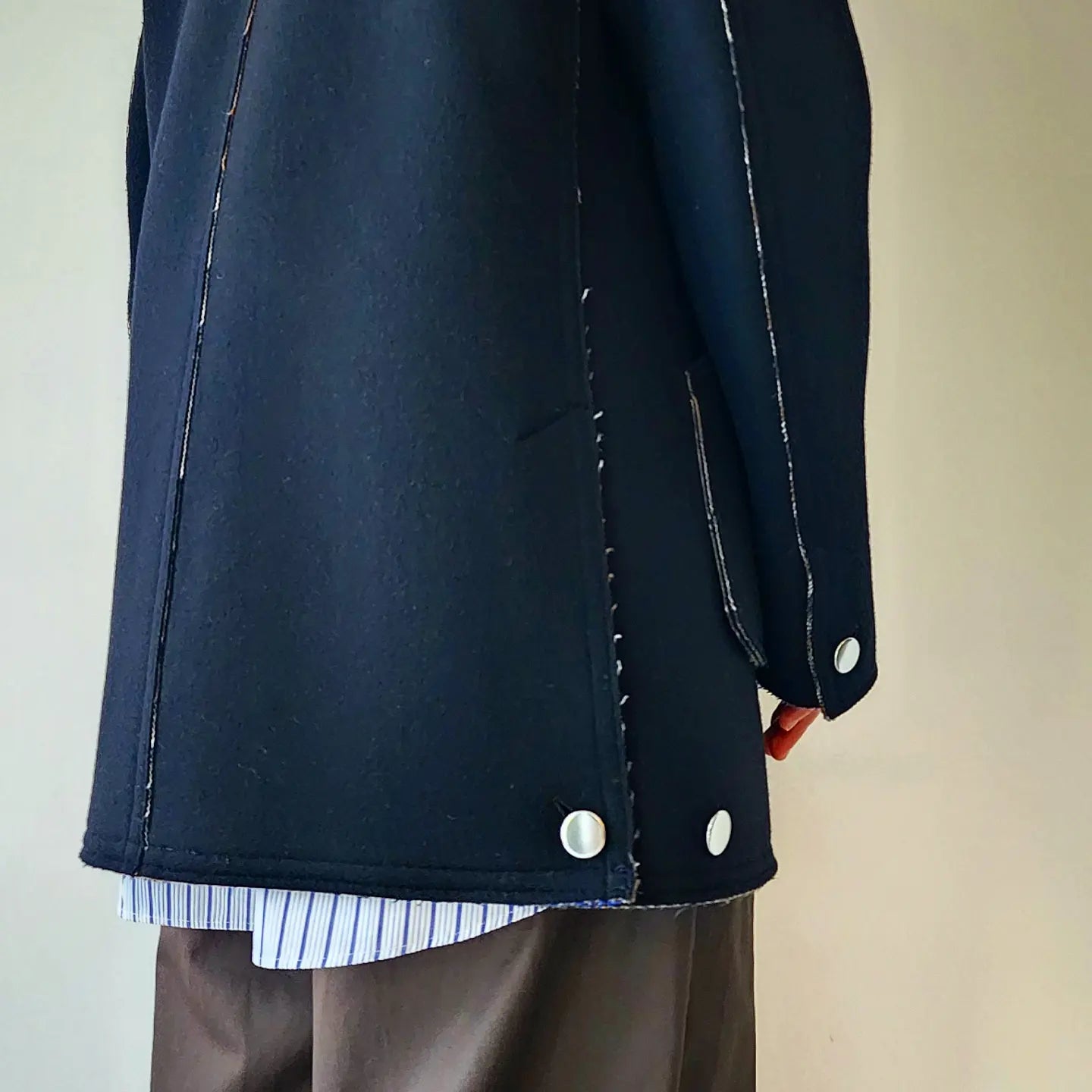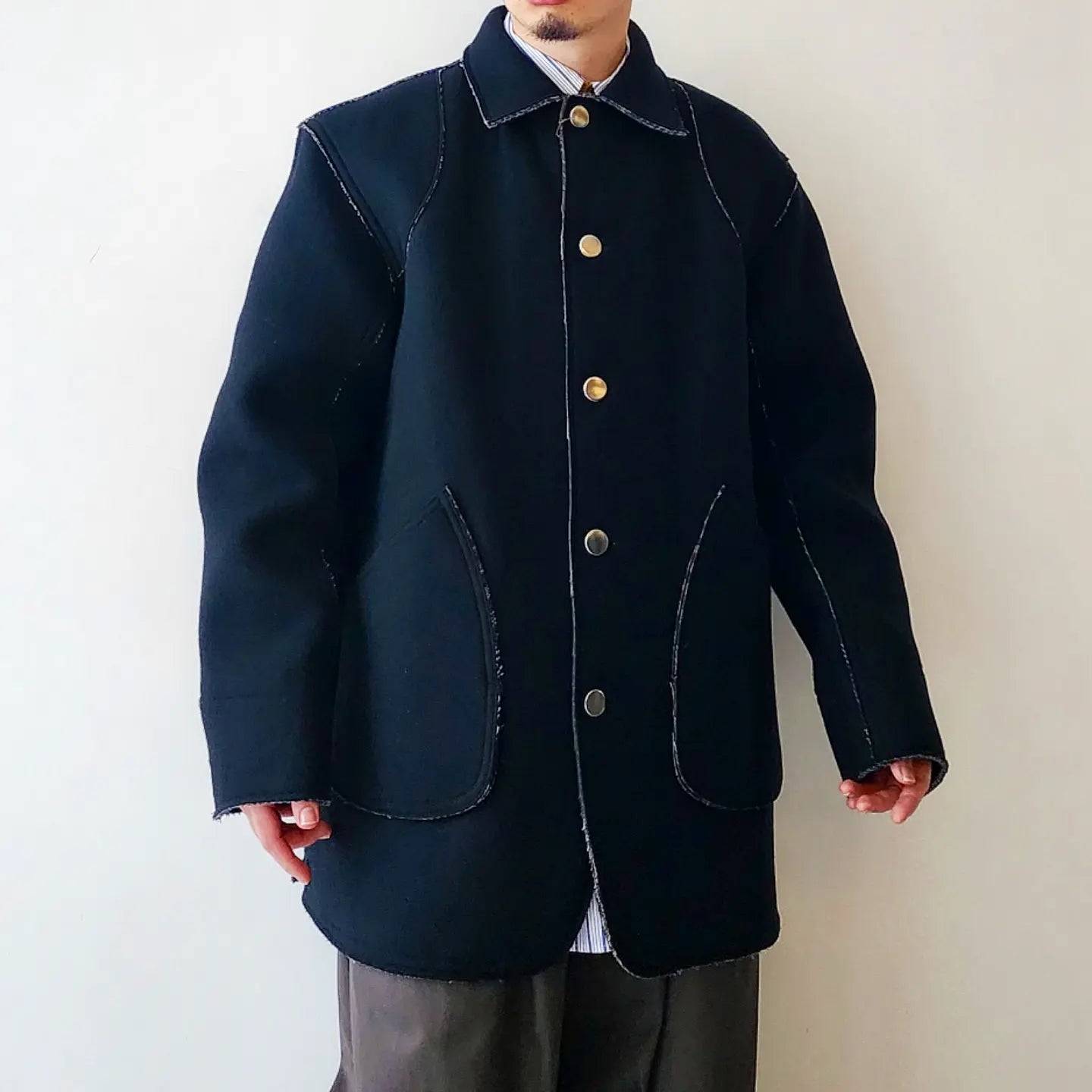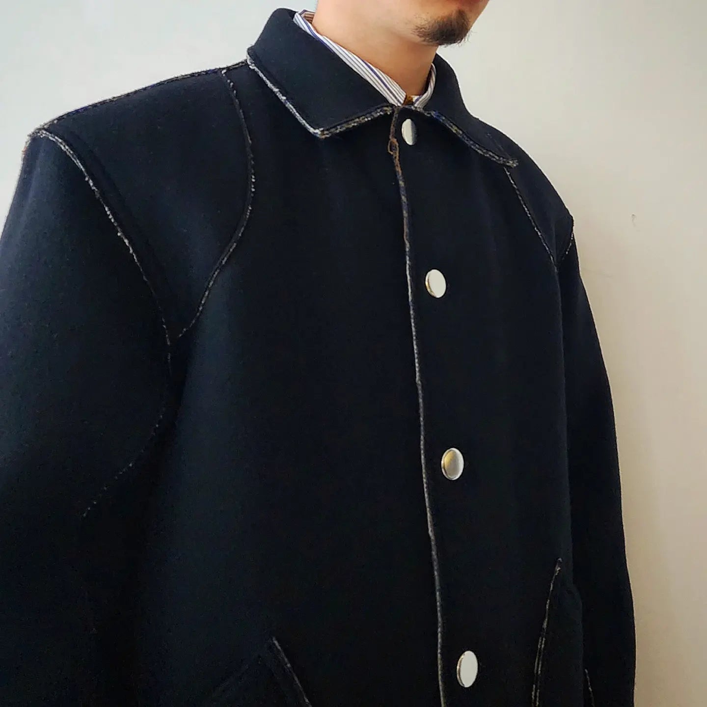 Super 100 is used as the raw material, and it has a glossy, firm and firm feel, and a moderate weight. Bonding fabric with characteristic melton fabric and check pattern is used. Bleeding specifications and voluminous size are the main points.