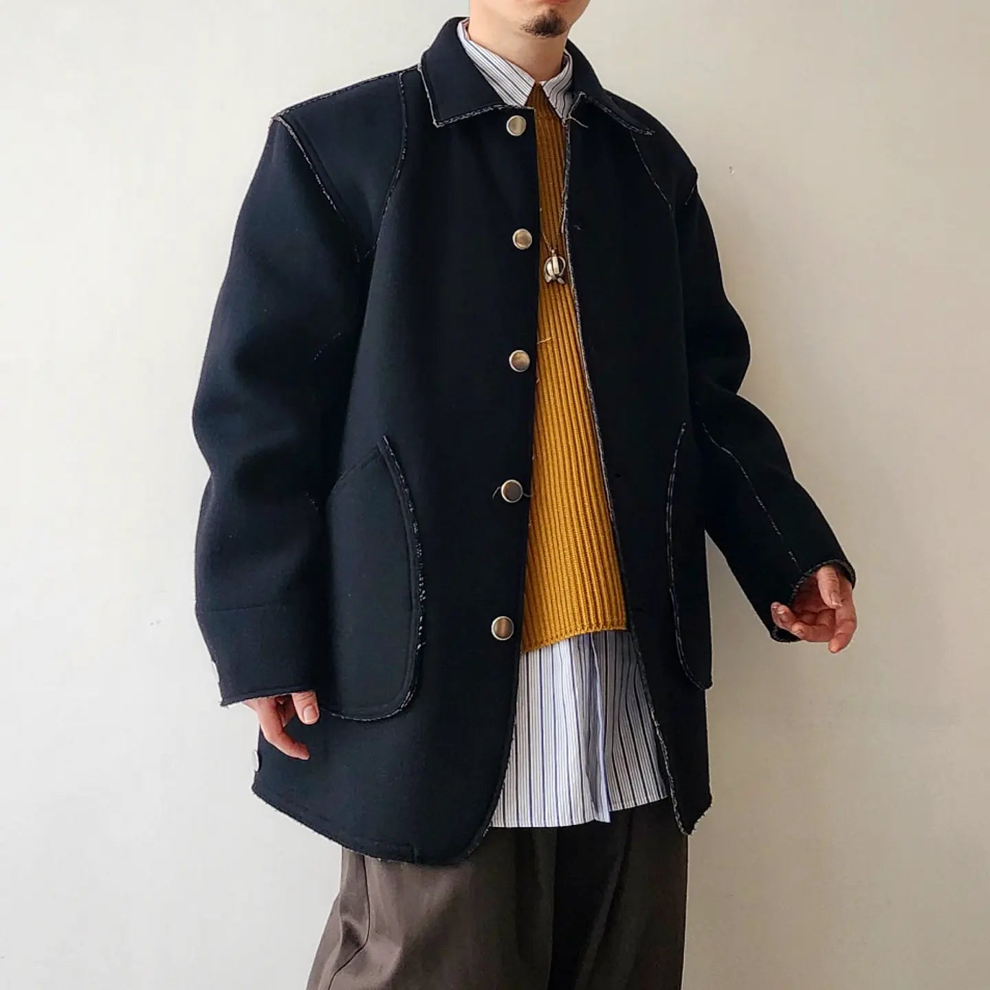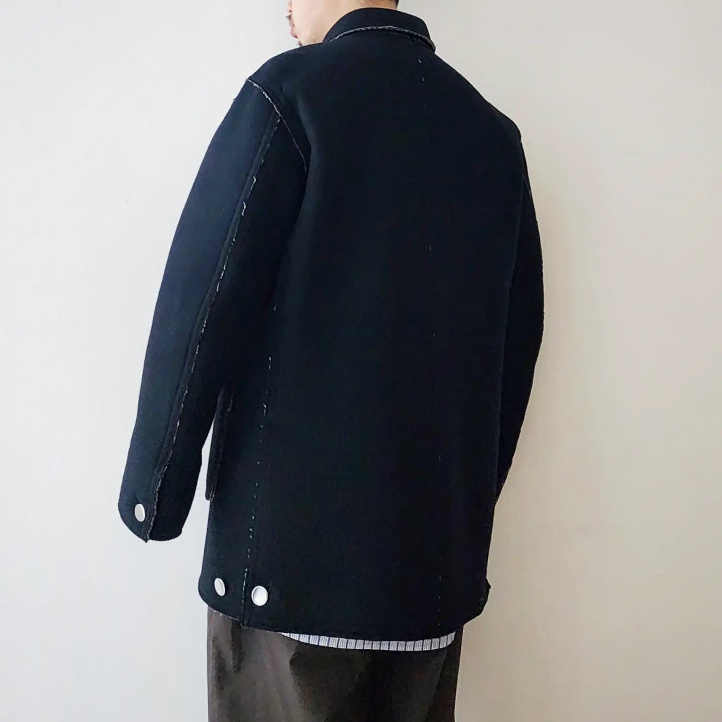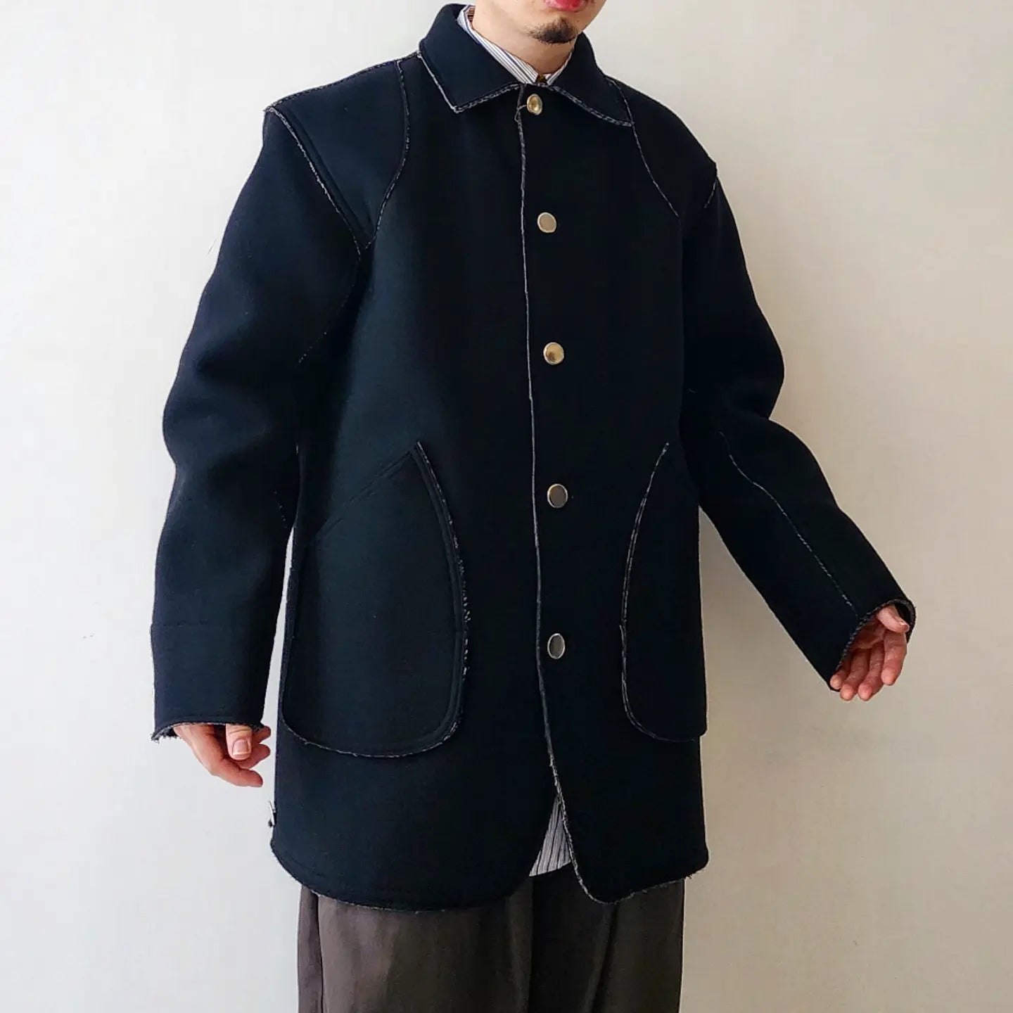 Super 100 is used as the raw material, and it has a glossy, firm and firm feel, and a moderate weight. Bonding fabric with characteristic melton fabric and check pattern is used. Bleeding specifications and voluminous size are the main points.