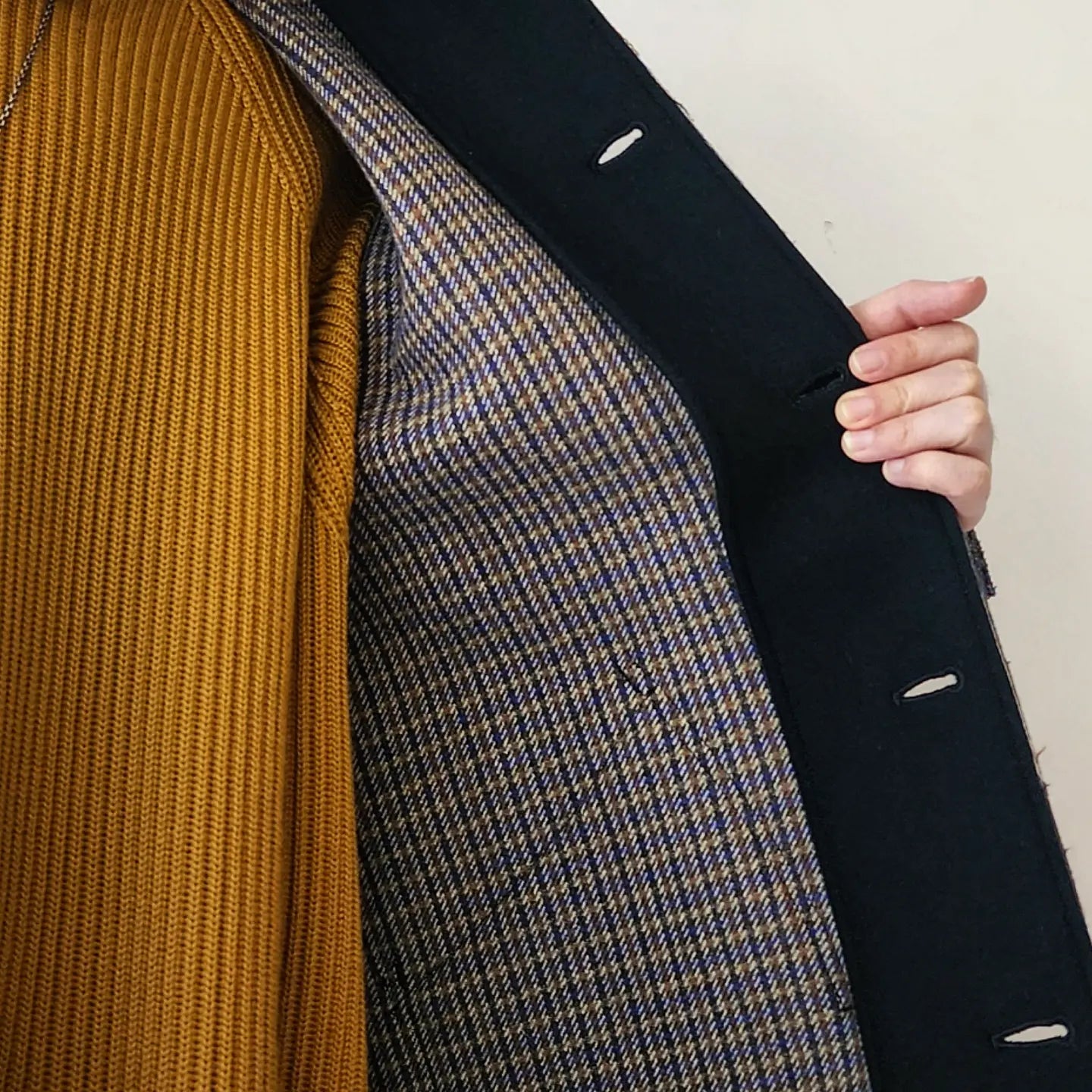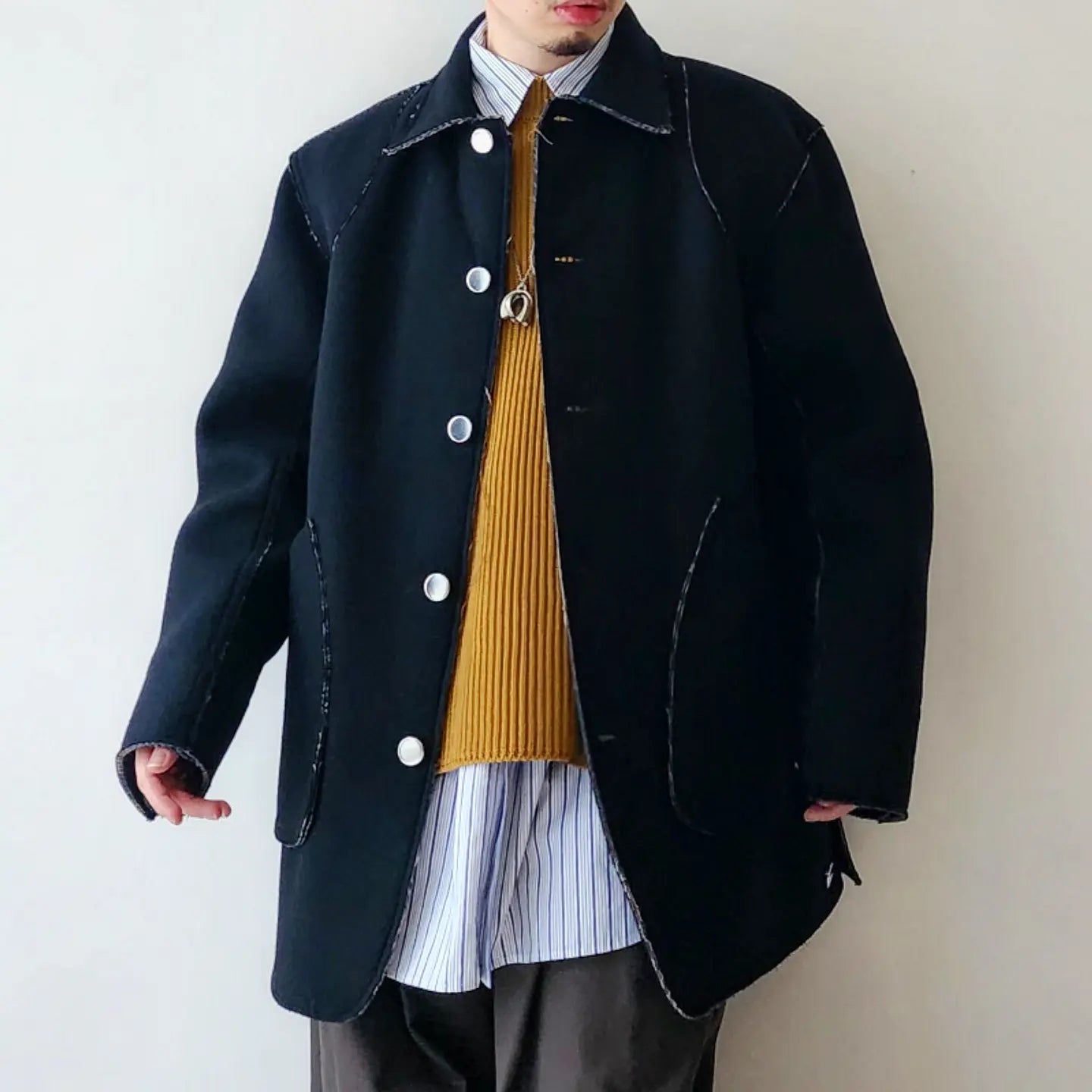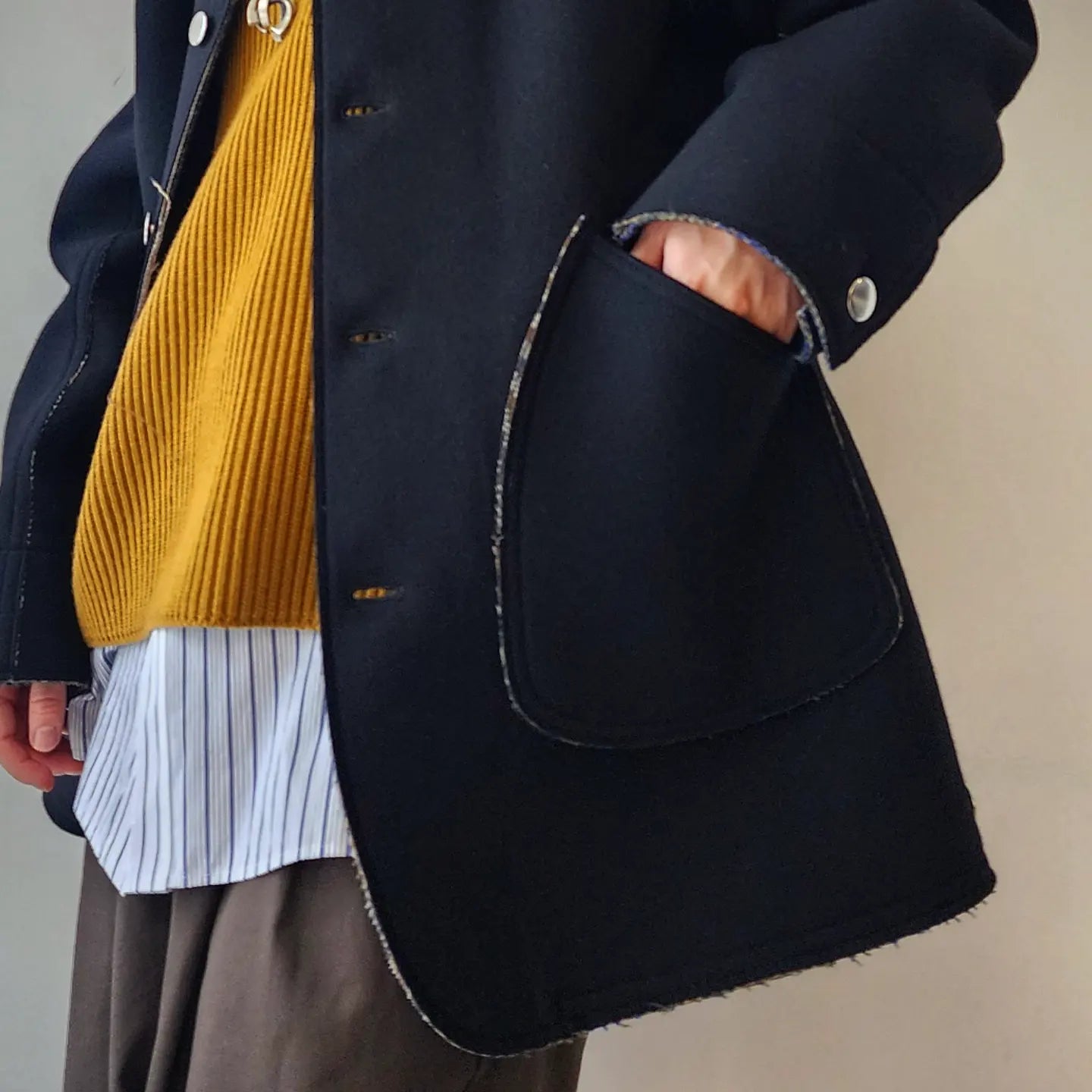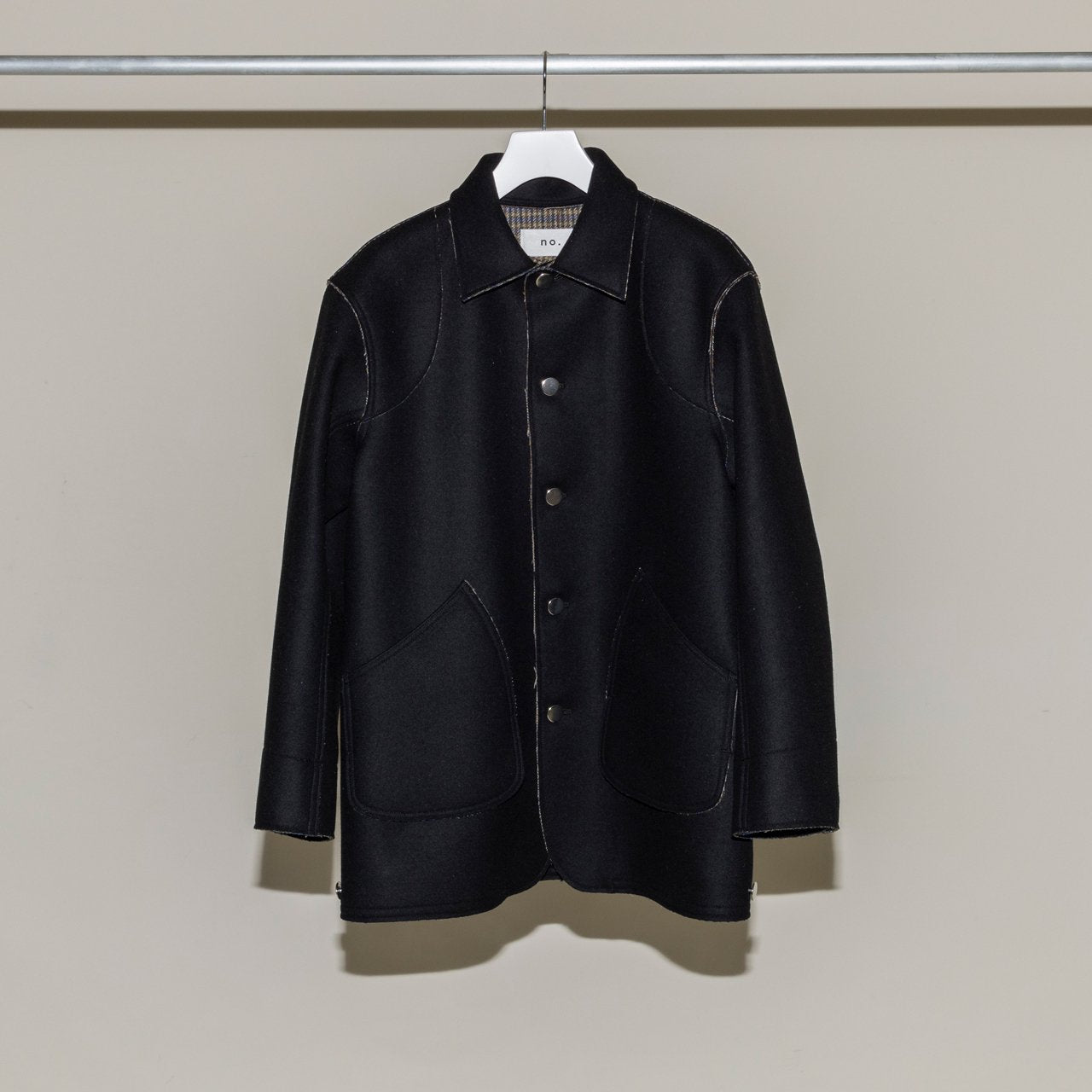 Super 100 is used as the raw material, and it has a glossy, firm and firm feel, and a moderate weight. Bonding fabric with characteristic melton fabric and check pattern is used. Bleeding specifications and voluminous size are the main points.