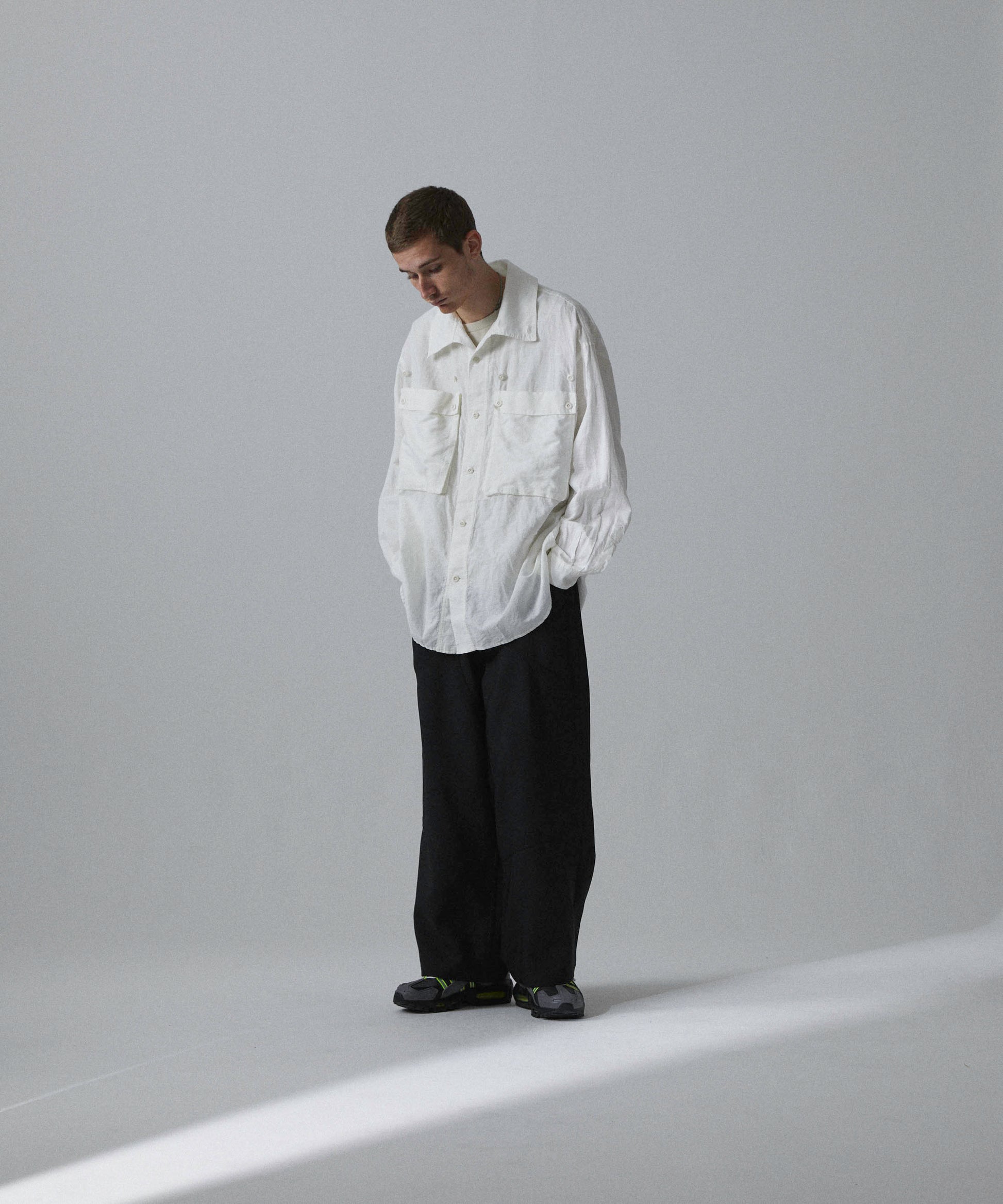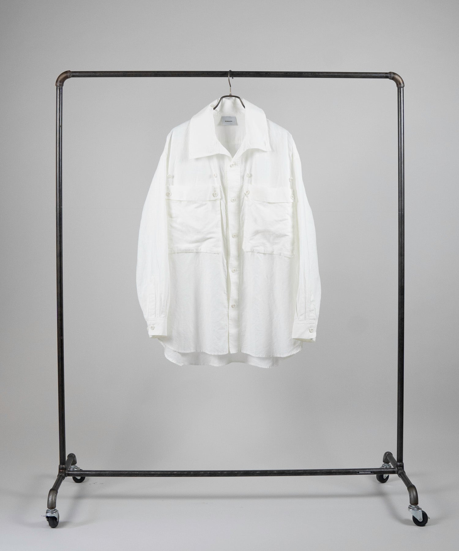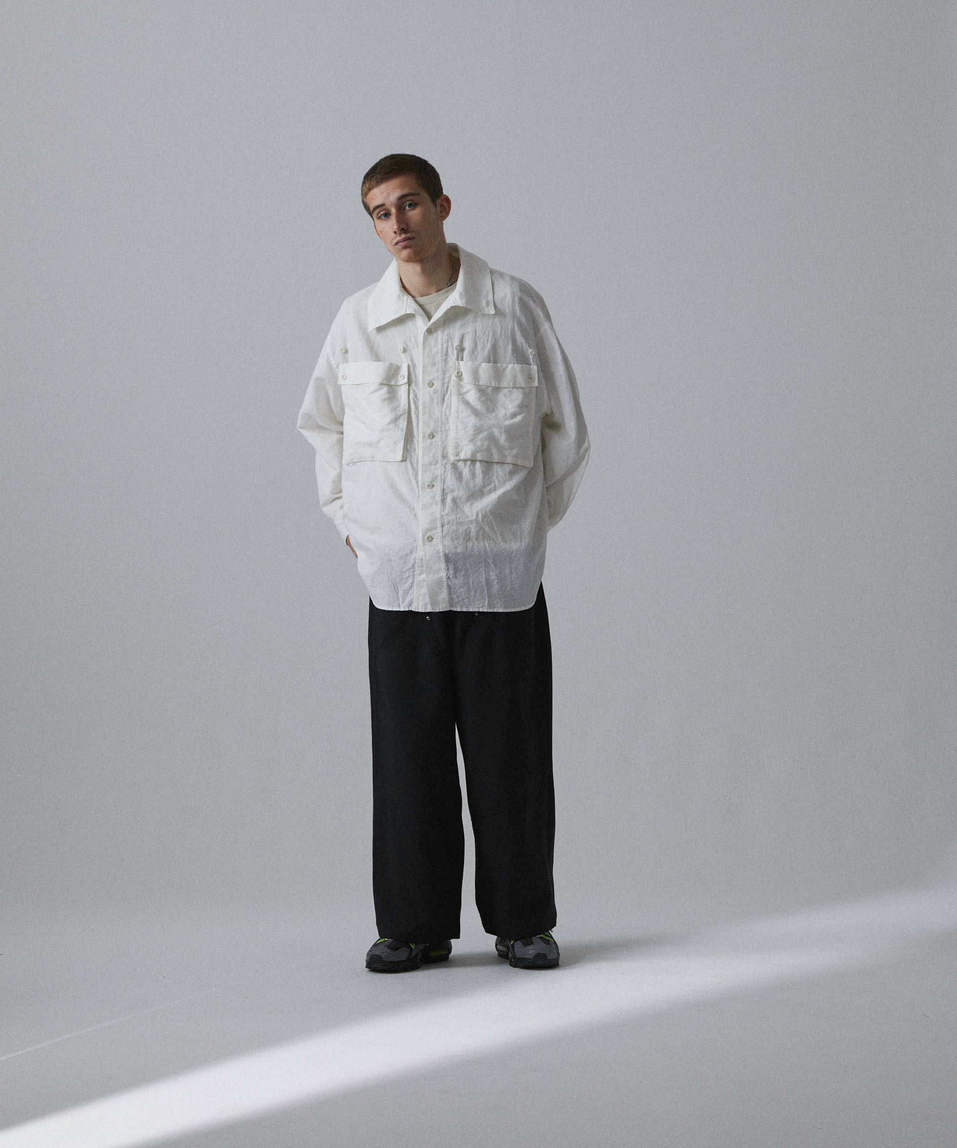 A big silhouette shirt featuring large pockets with gimmicks and a collar that can be arranged.