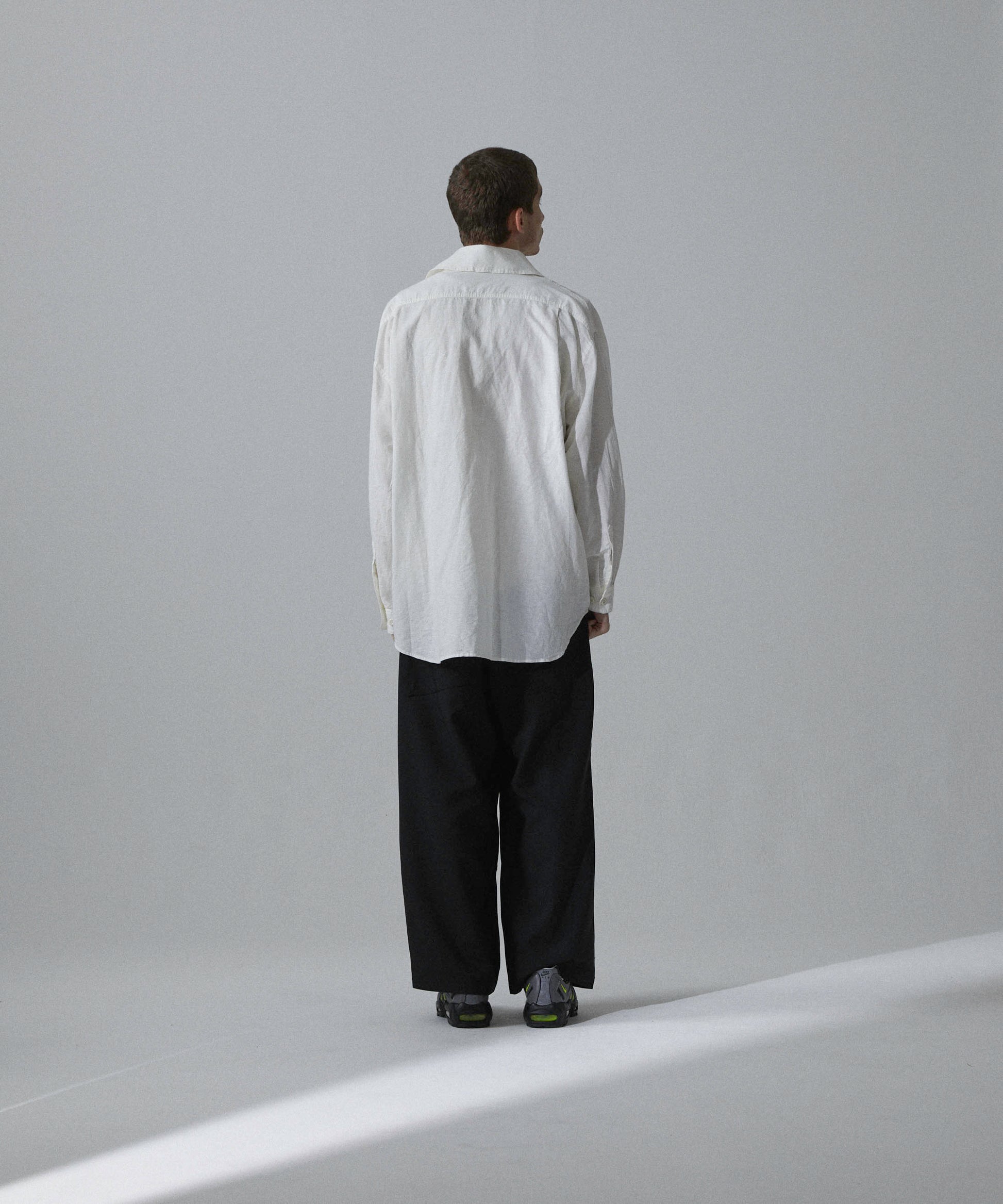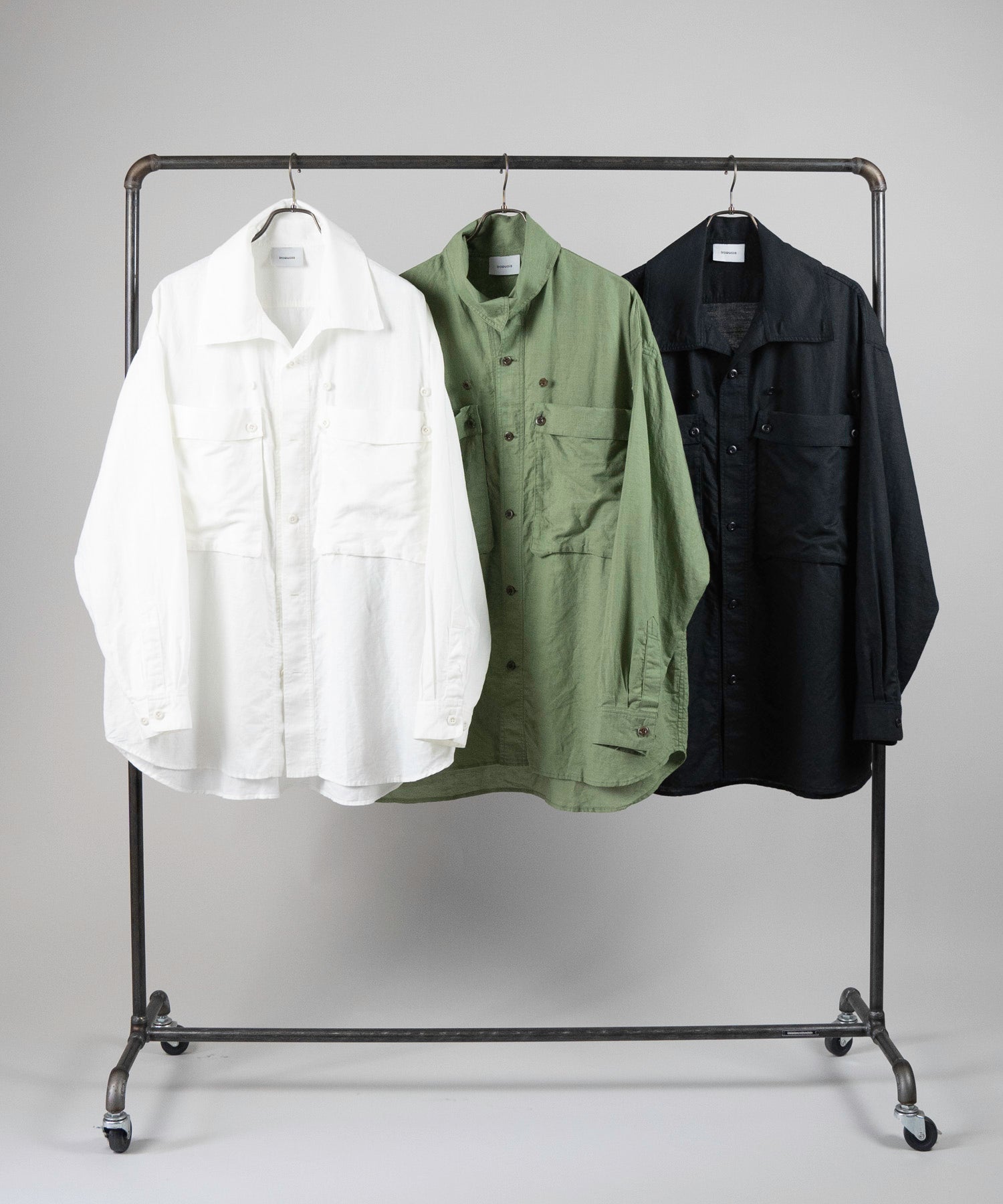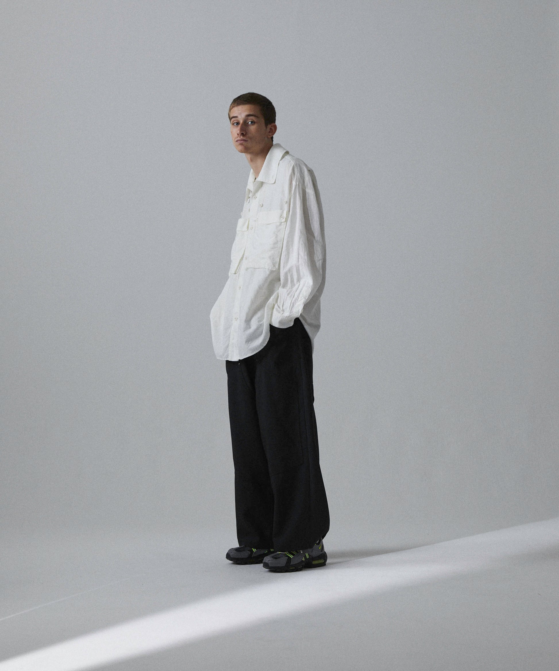 A big silhouette shirt featuring large pockets with gimmicks and a collar that can be arranged.