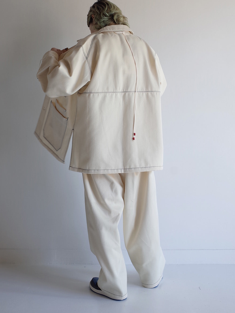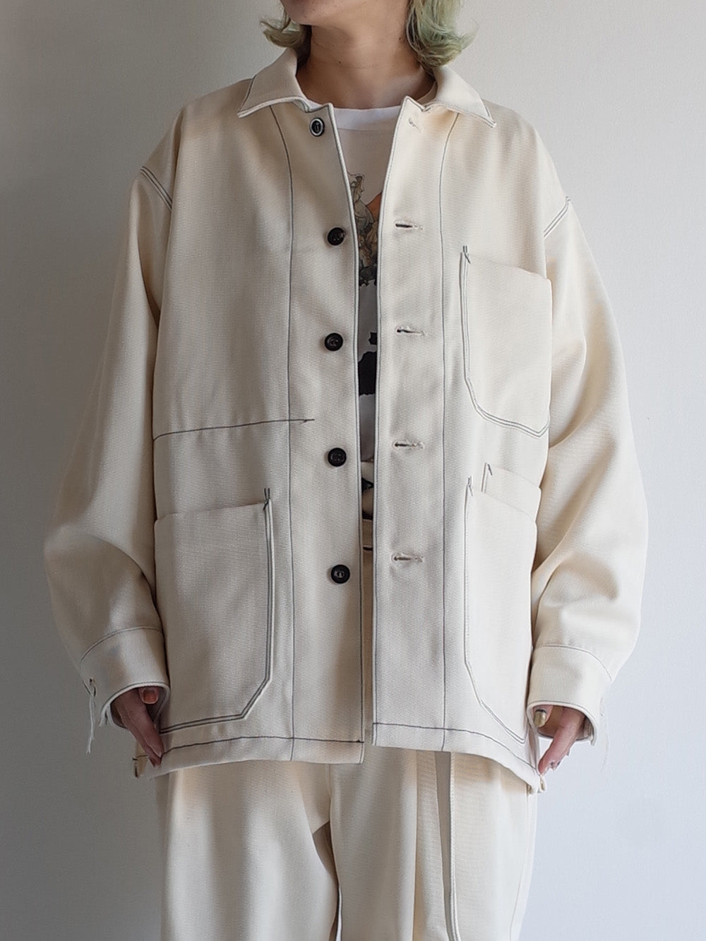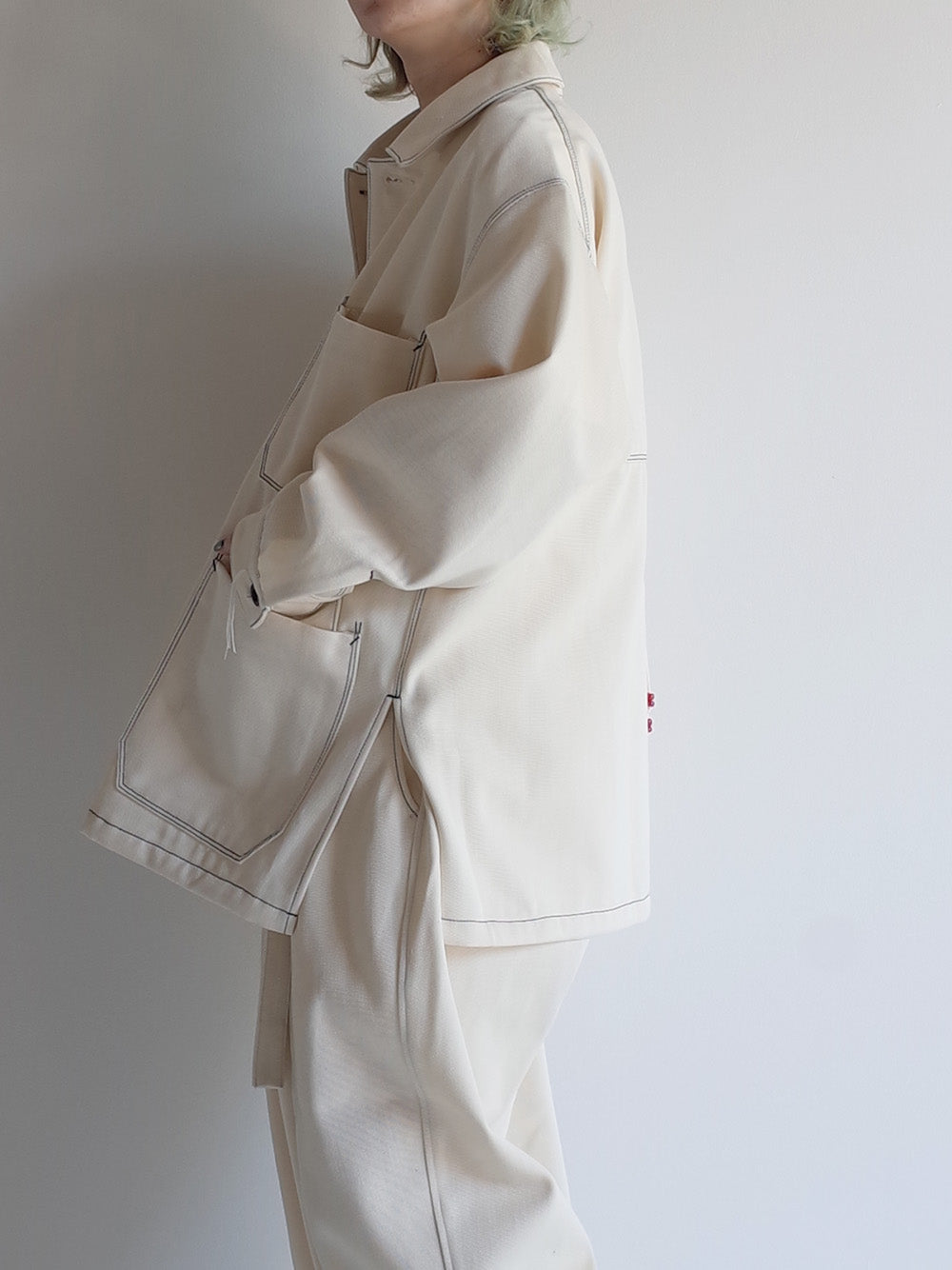 - The shoulder line is created using a technique that is also used in tailoring, and the silhouette incorporates various techniques in the pattern, such as adopting a single sleeve that makes the sleeves look neat.