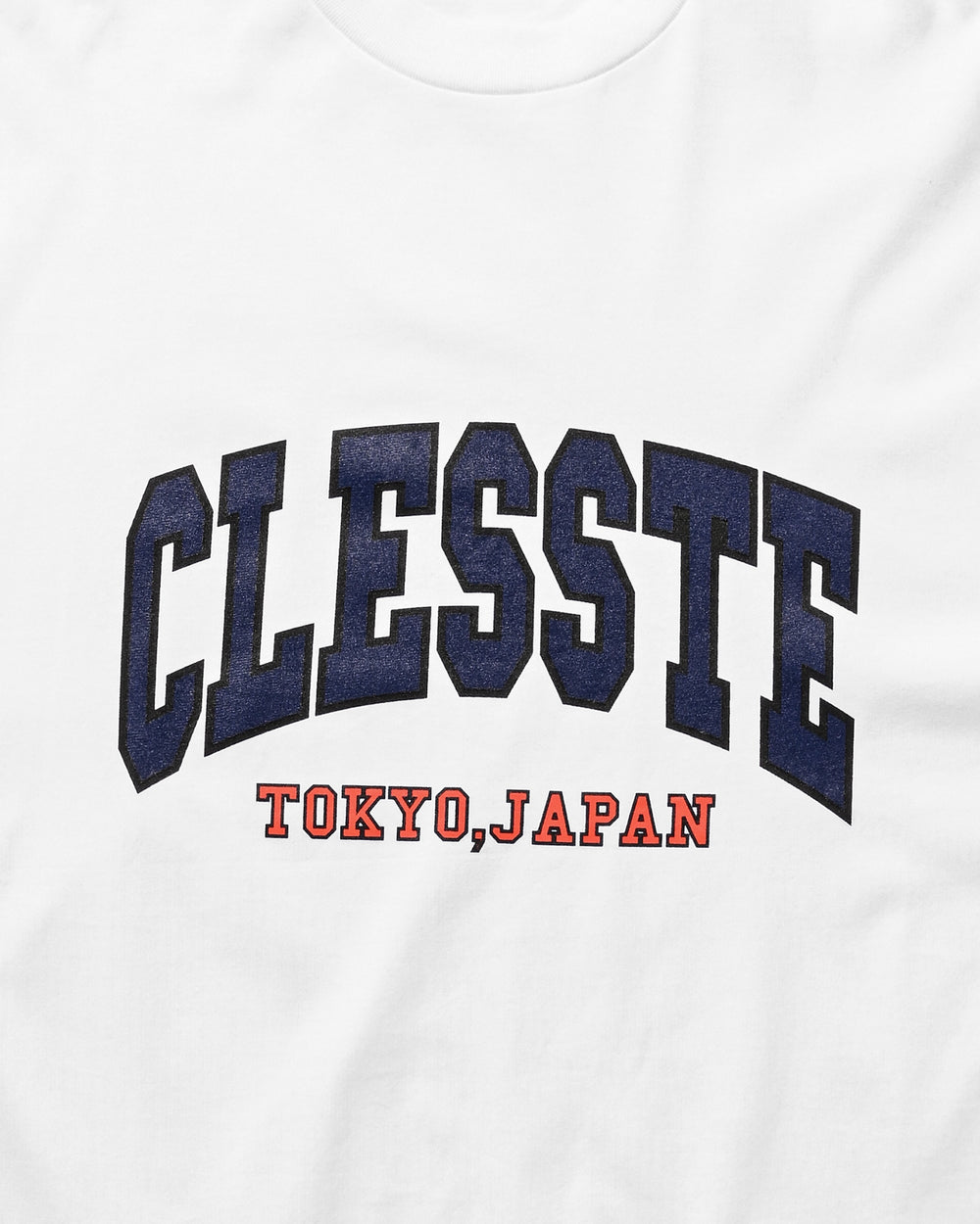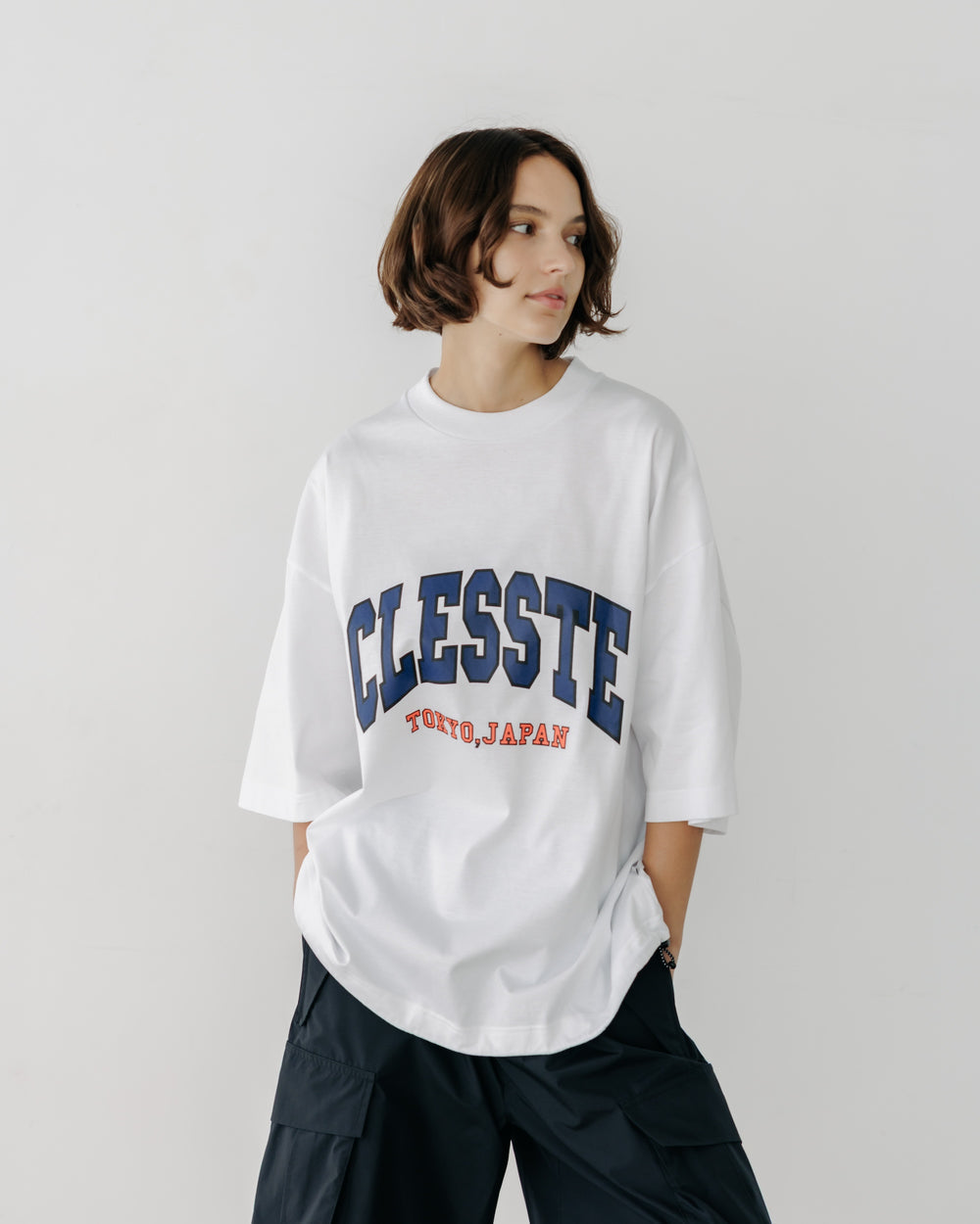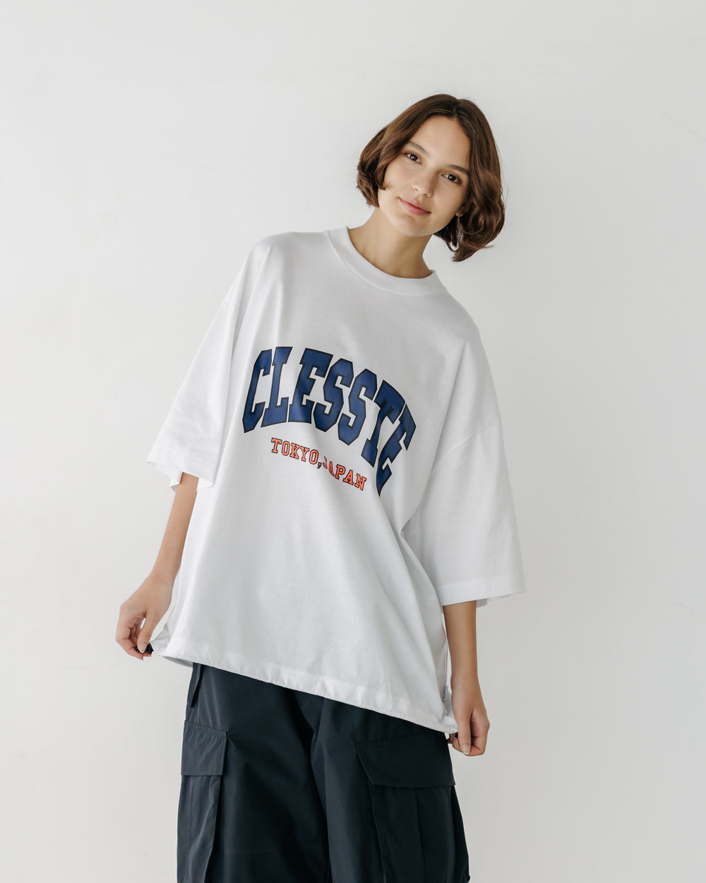 The CLESSTE COLLEGE LOGO is printed on the front. The left side of the hem features a shrink-tip adjuster, CLESSTE's signature. While it's a simple accent, you can also adjust the adjuster to change the way you wear it.