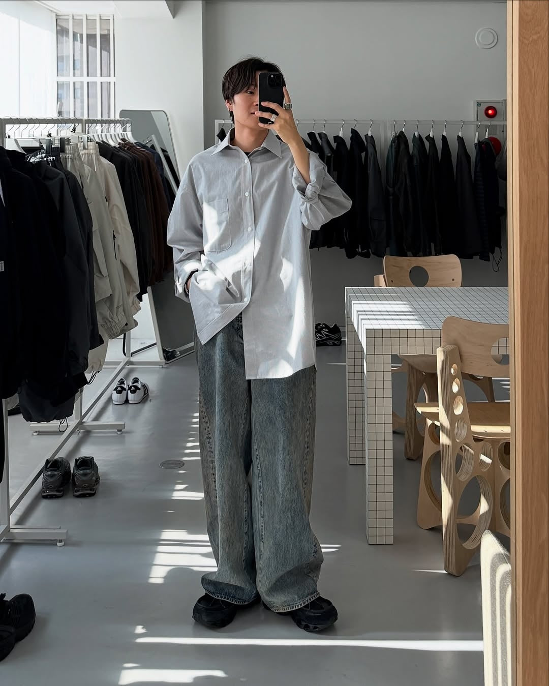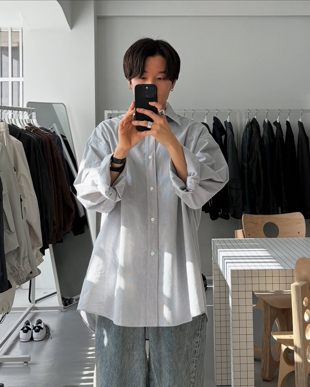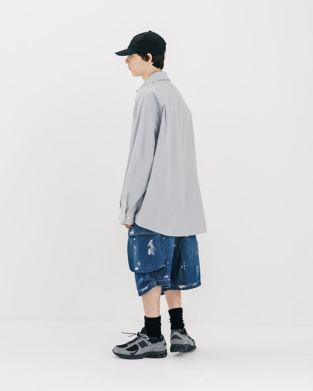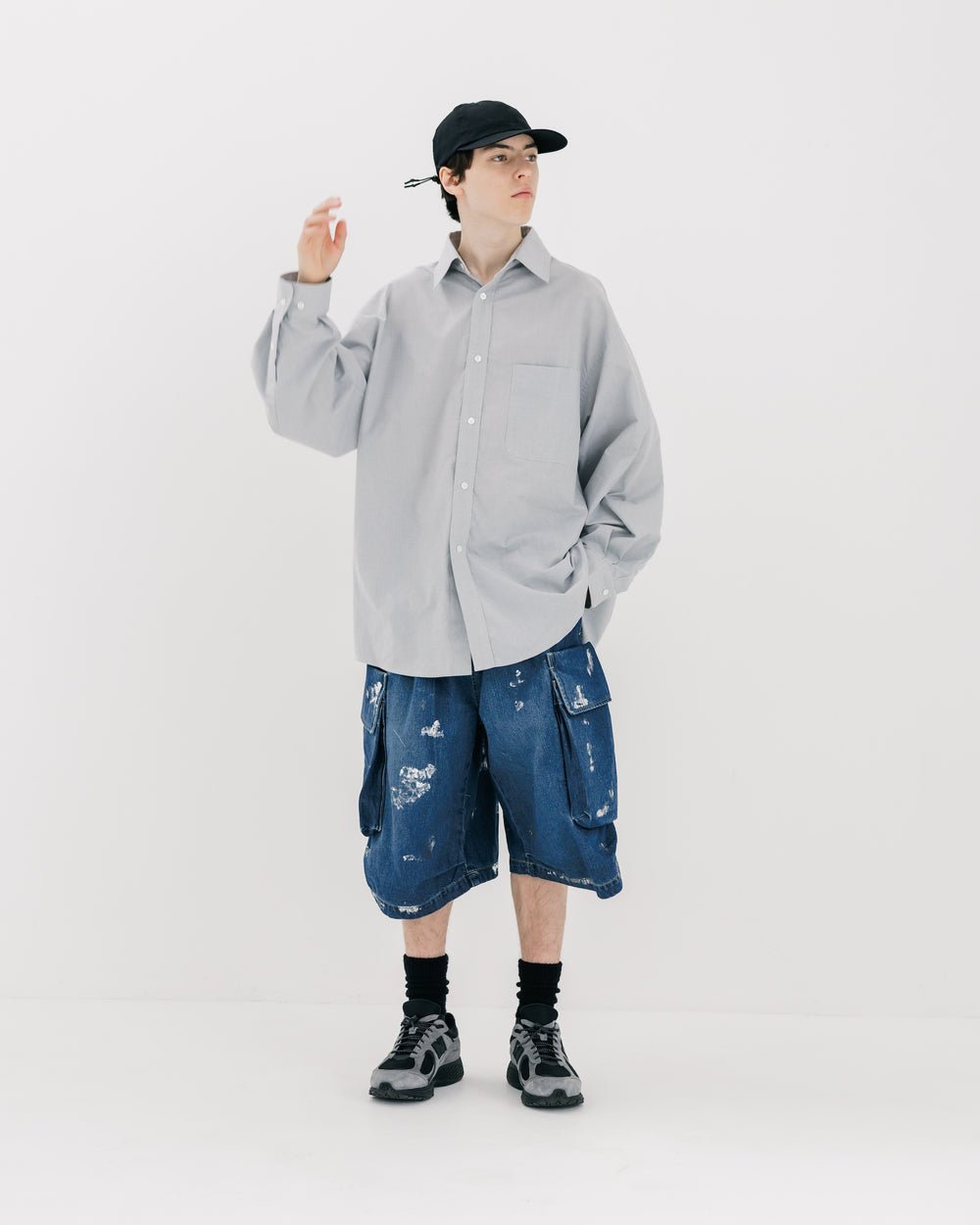 This piece is based on the classic American shirt design, but reconstructed with a modern urban sensibility. It features a large collar that maintains a classical atmosphere while adding an accent to your styling. The overall silhouette is oversized, giving it a relaxed and comfortable fit. The sleeves feature a three-dimensional pattern, providing ease of movement and design.