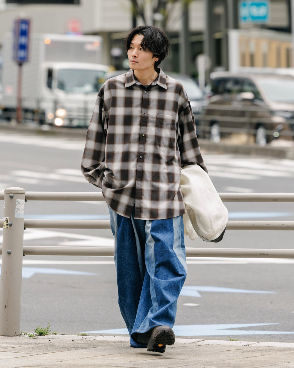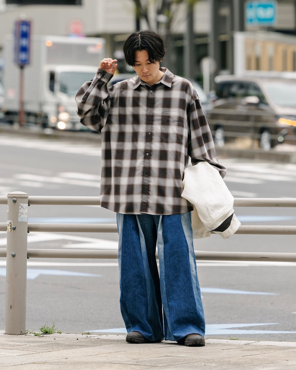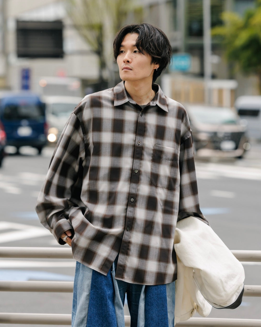 This piece is based on the classic American shirt design, but reconstructed with a modern urban sensibility. It features a large collar that maintains a classical atmosphere while adding an accent to your styling. The overall silhouette is oversized, giving it a relaxed and comfortable fit. The sleeves feature a three-dimensional pattern, providing ease of movement and design.