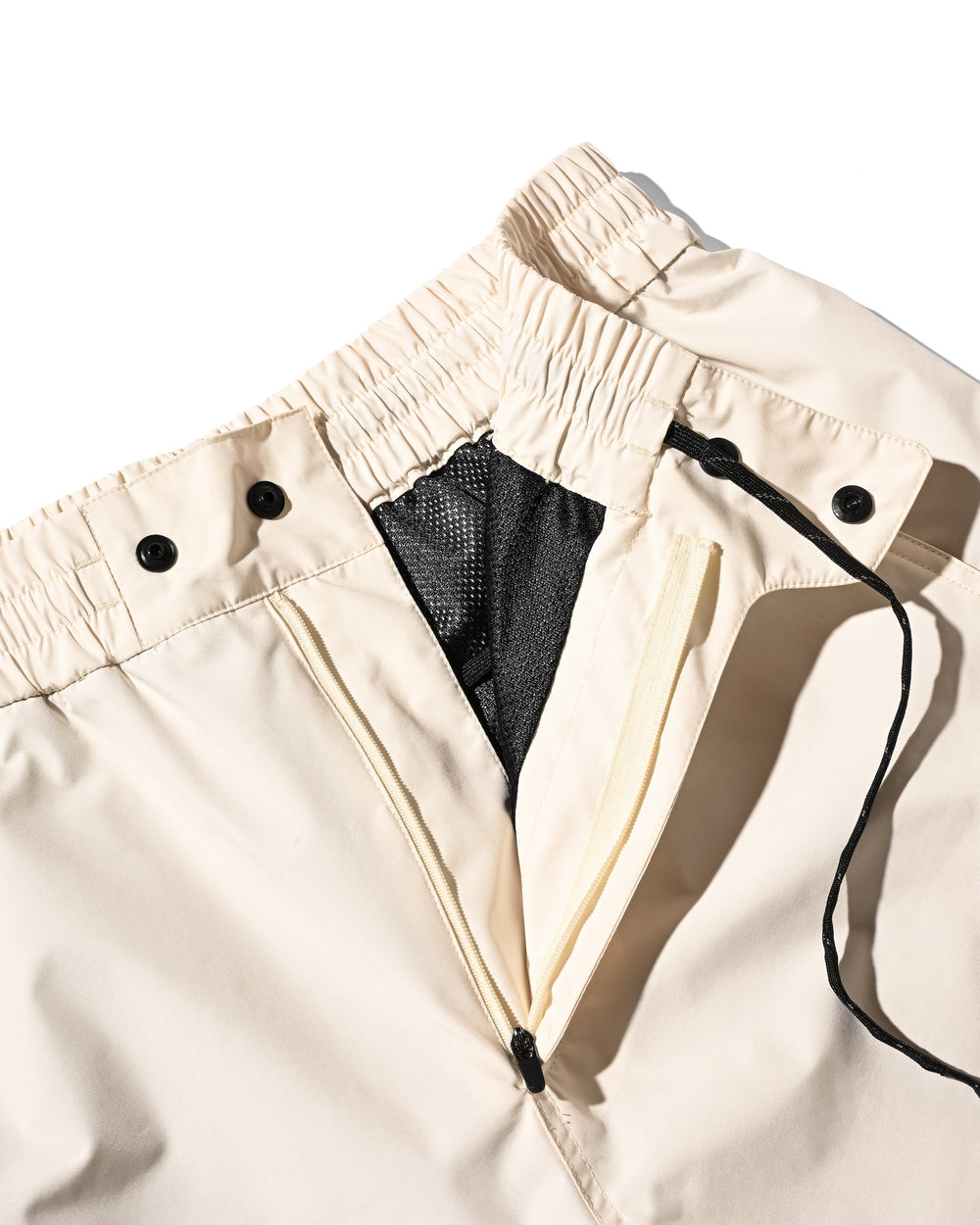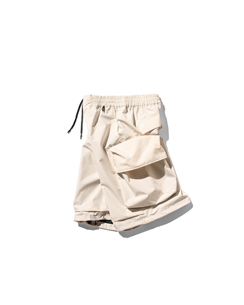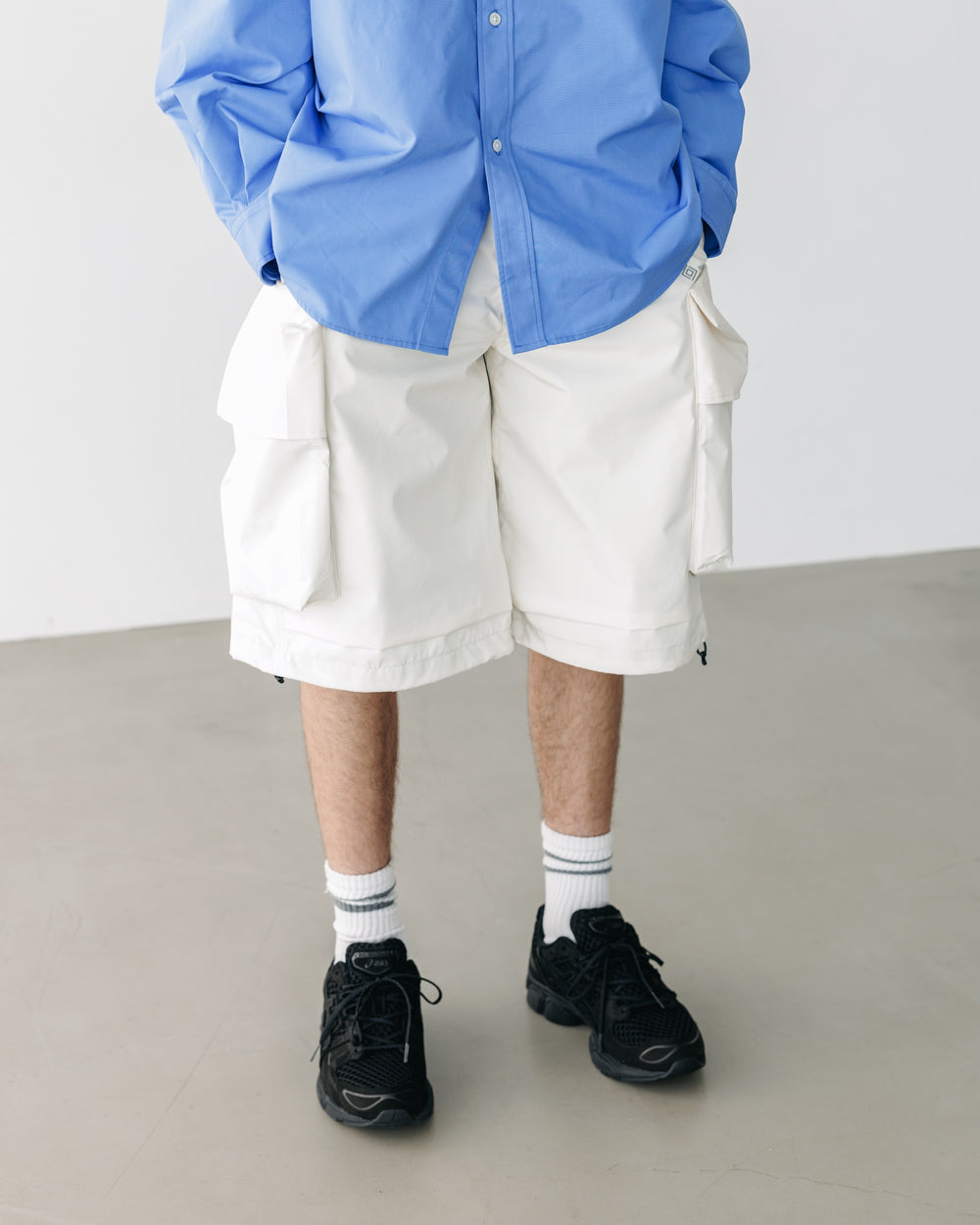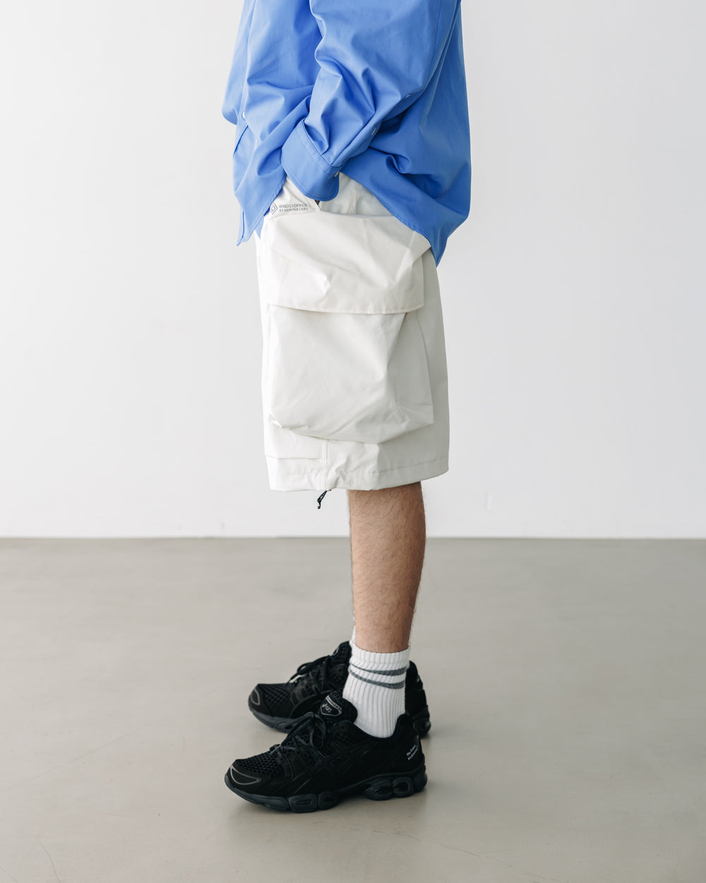 These half pants are based on the motif of overpants made to be worn over the M-51 cargo pants officially adopted in 1951, but have been updated to a more modern style. The side seams have a three-dimensional design with a twist on the front, and the cargo pockets on the sides have also been changed to a three-dimensional design. The waist is elastic and has a drawstring. There is also an adjuster at the hem.