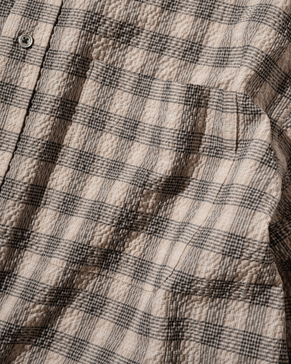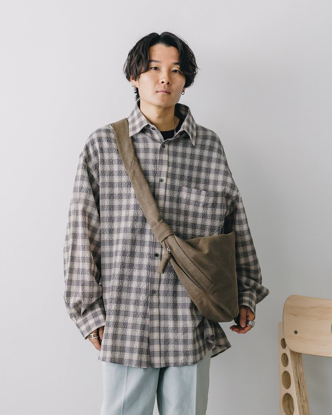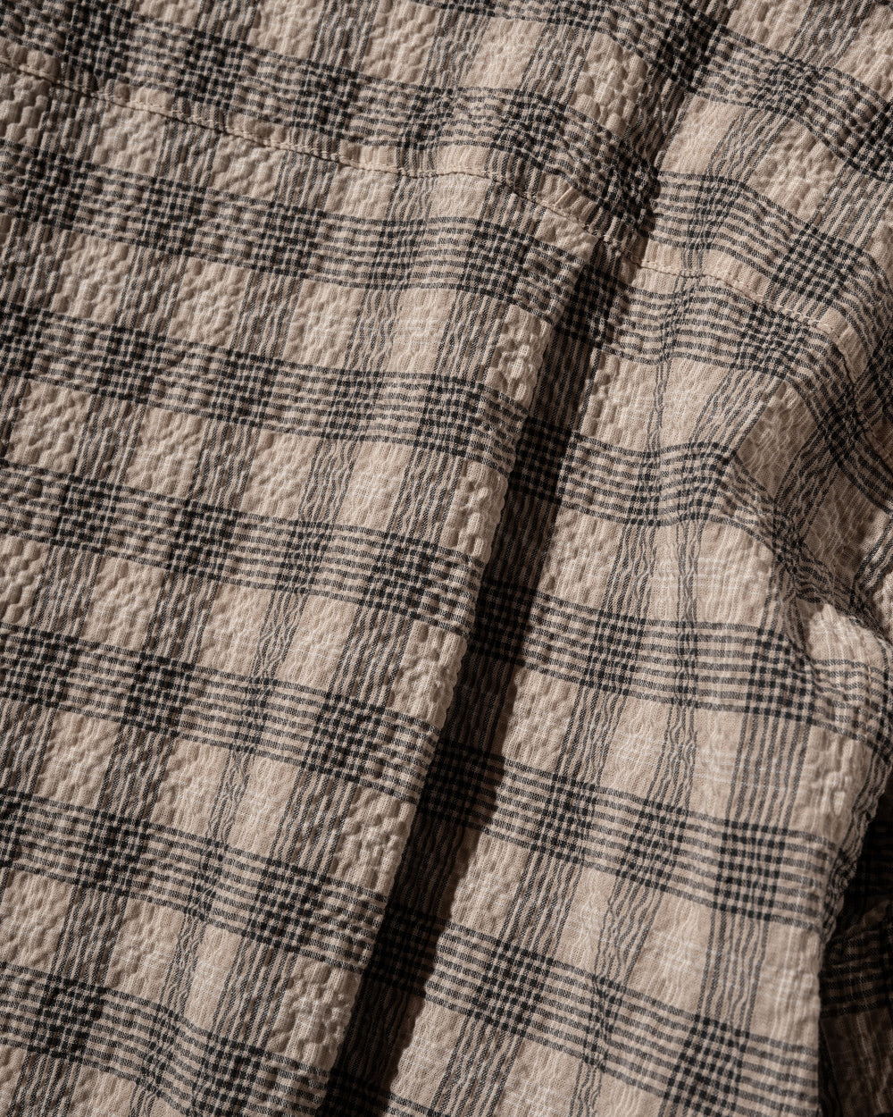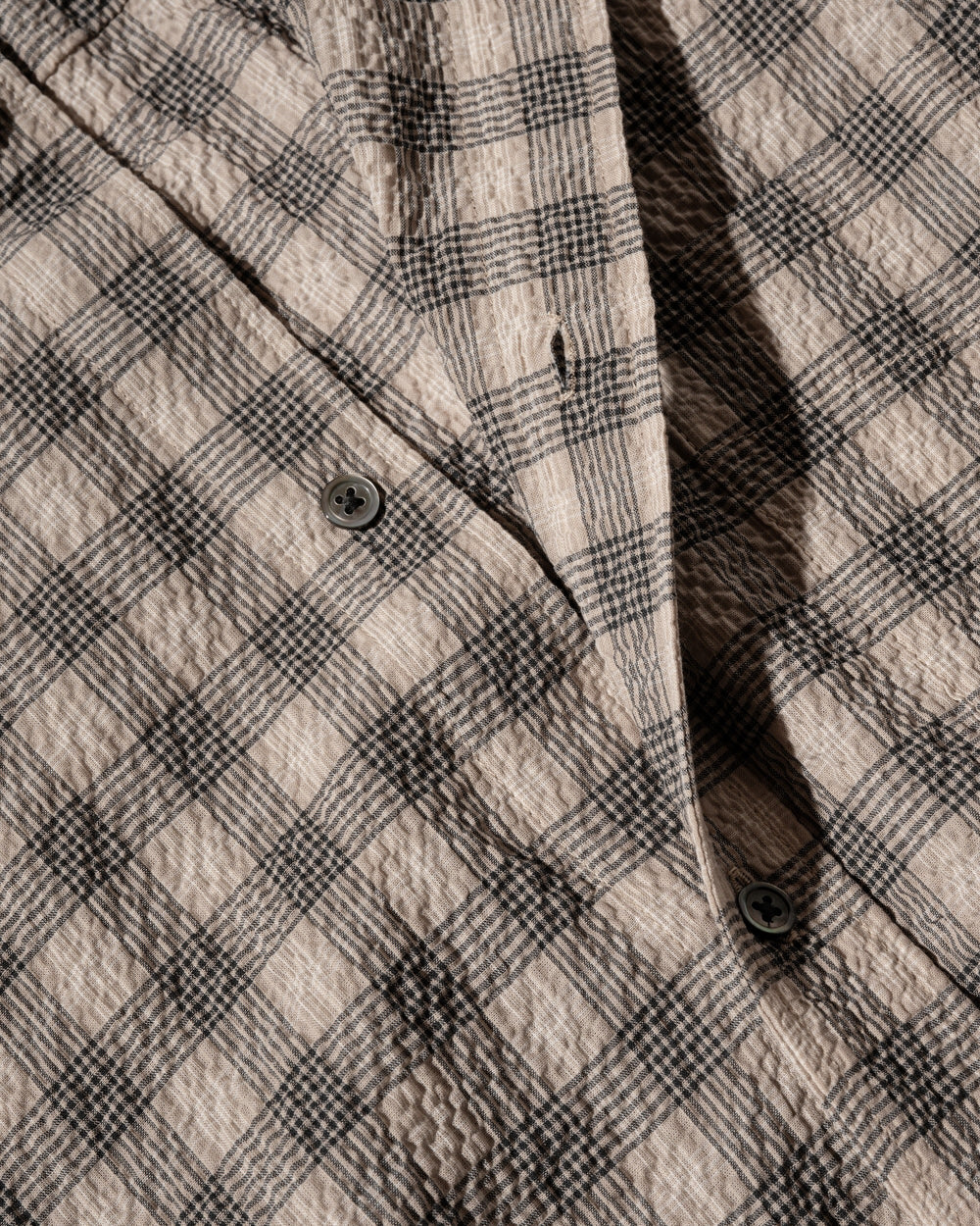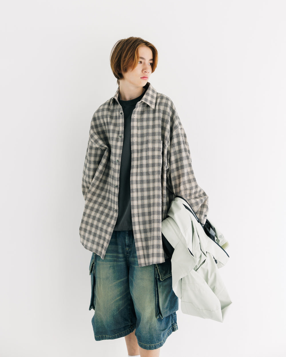 This piece is made of seersucker fabric, which features a unique uneven texture. It has a smooth and dry texture that does not stick to the skin even on sweaty days. With just the right amount of firmness and lightness, it is an item that gives a relaxed yet elegant impression. In addition, it is less likely to wrinkle after washing, so it can be used daily without ironing.