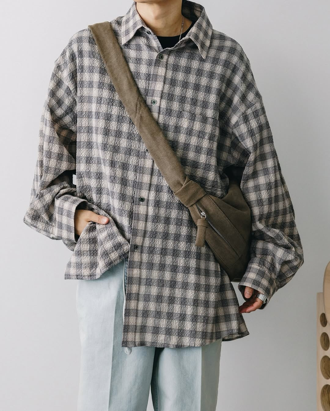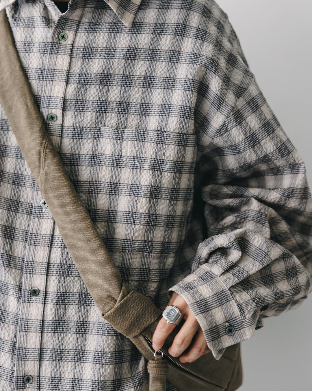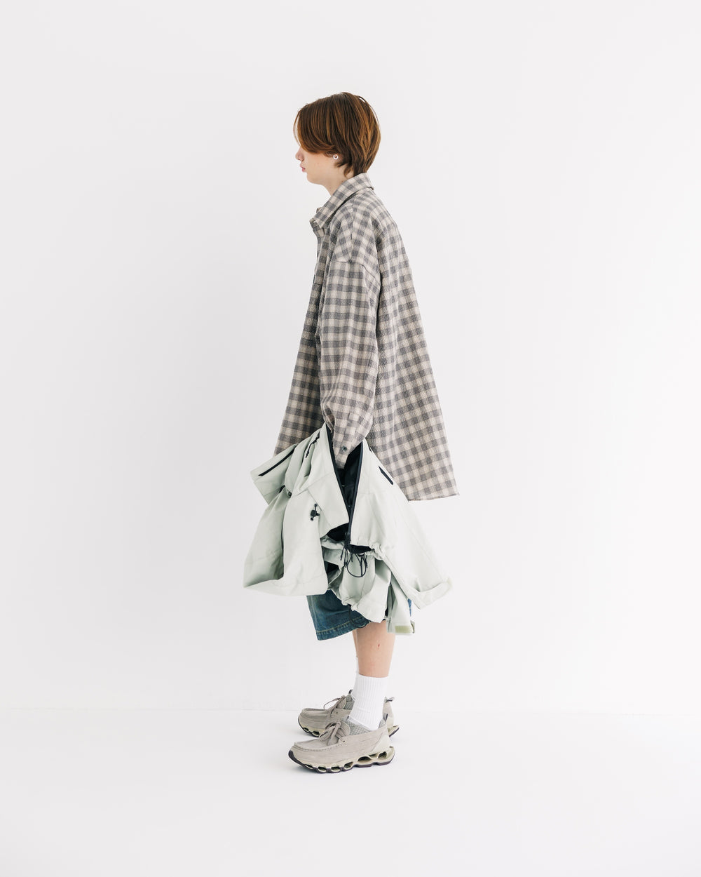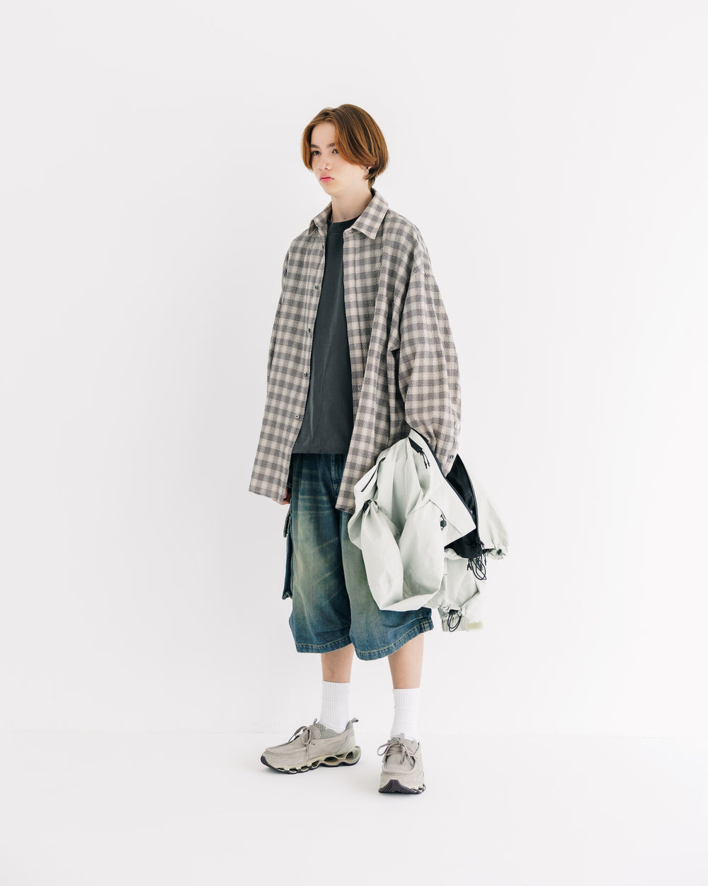 This piece is based on the classic American shirt design, but reconstructed with a modern urban sensibility. It features a large collar that maintains a classic atmosphere while adding an accent to your styling. The overall silhouette is oversized, giving it a relaxed and comfortable fit. The sleeves feature a three-dimensional pattern, combining ease of movement and design.