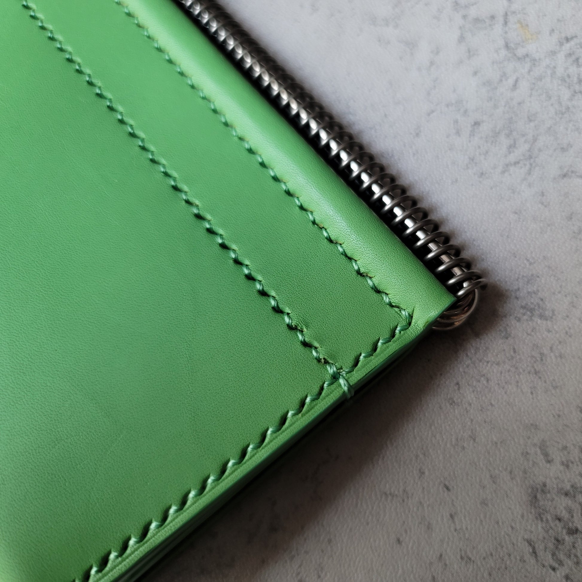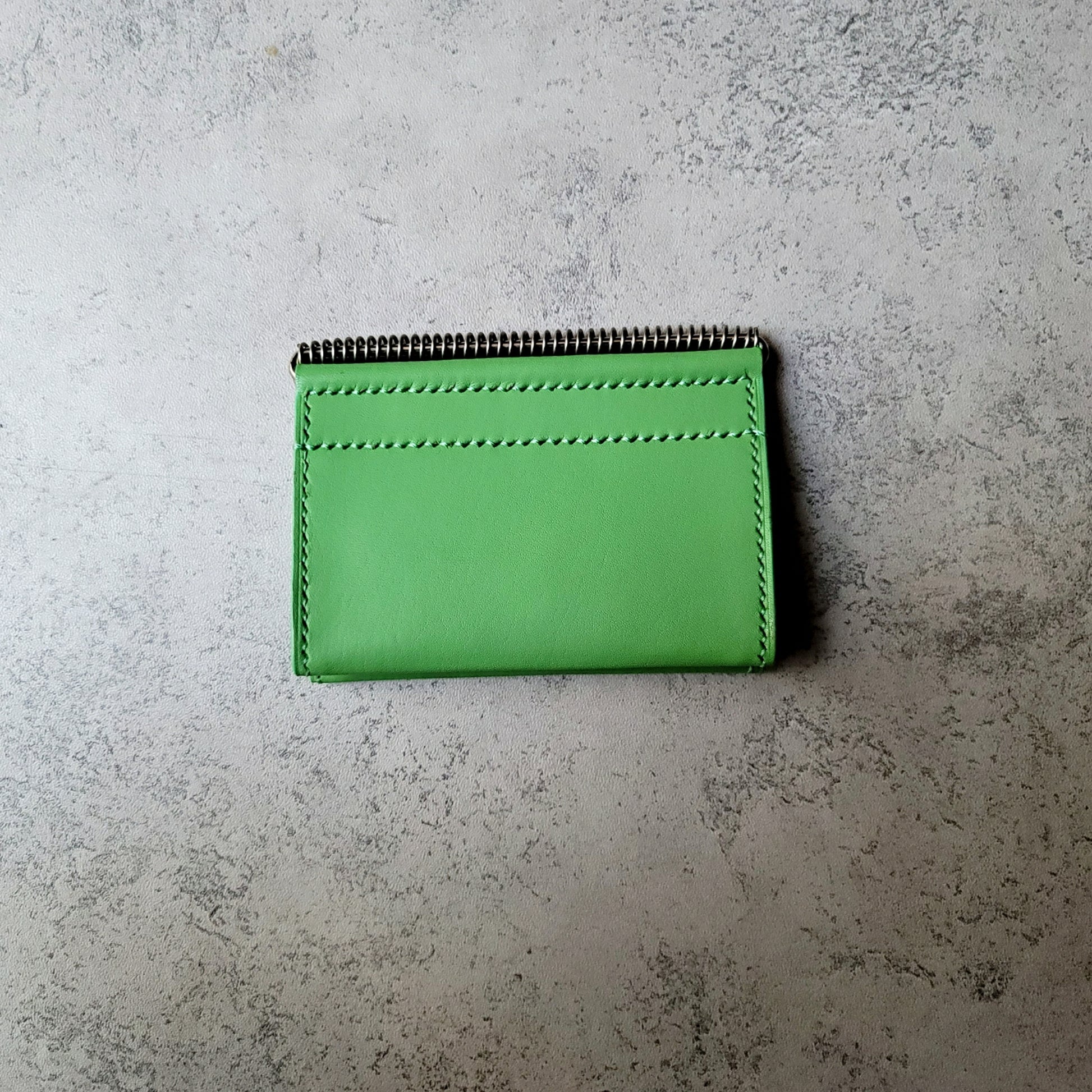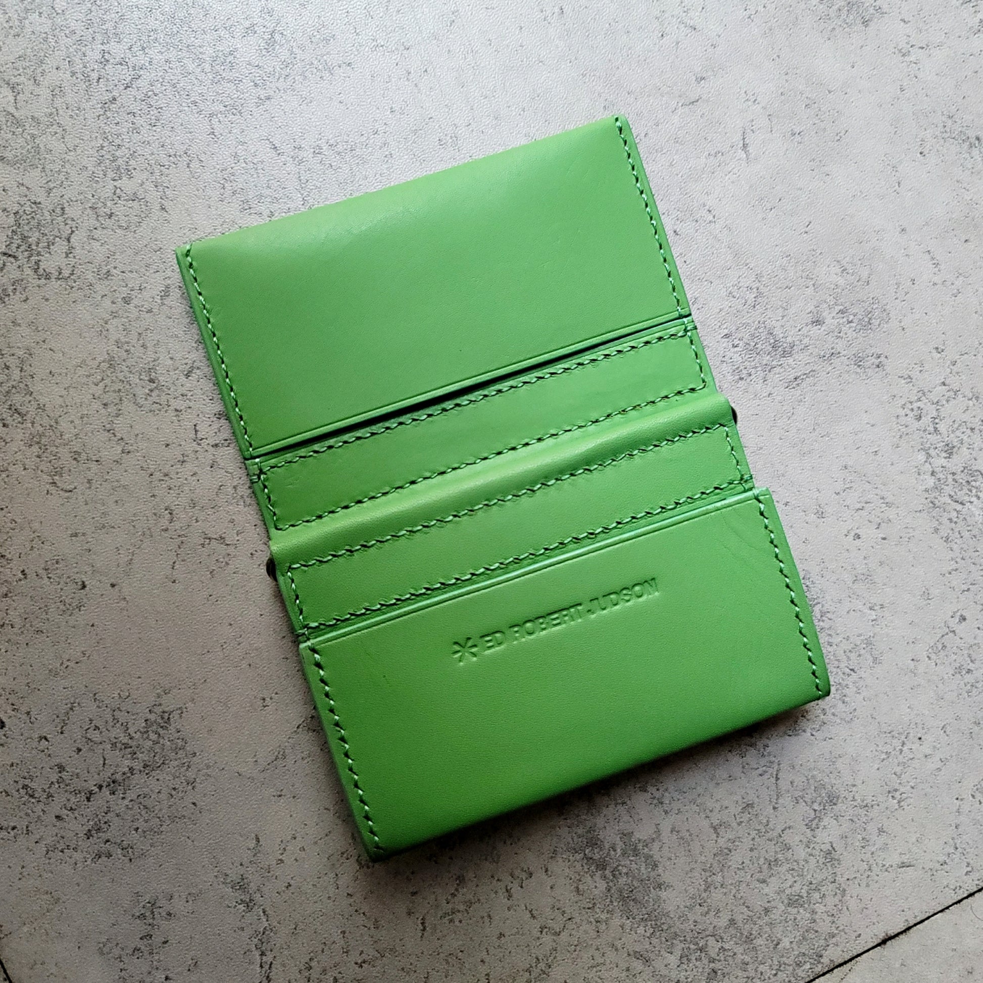 - A card case with moving parts connected by a spring and a metal frame. One side has a gusseted pocket for extra storage.