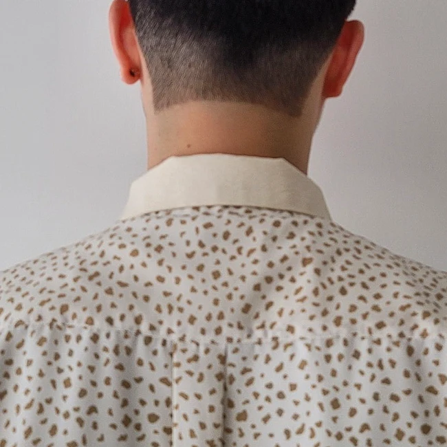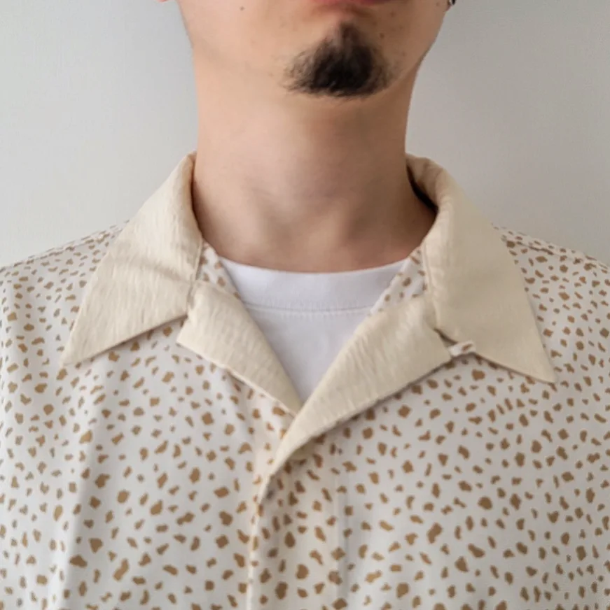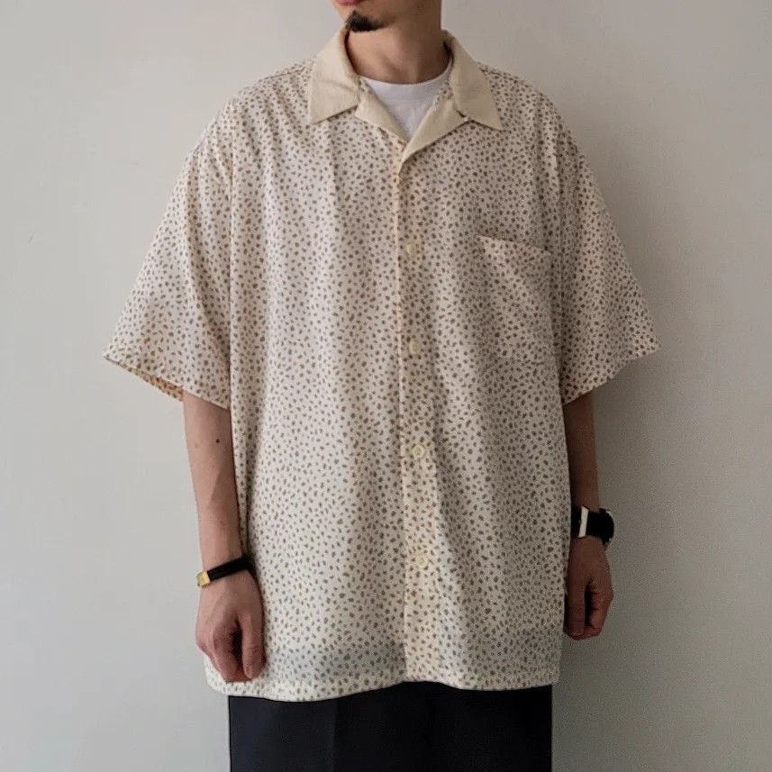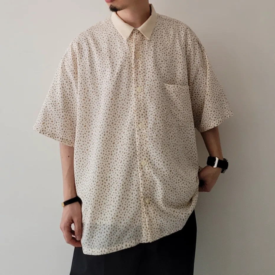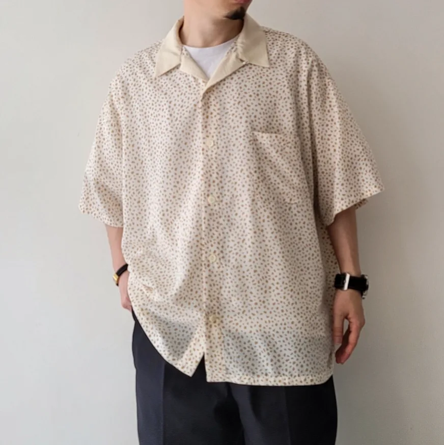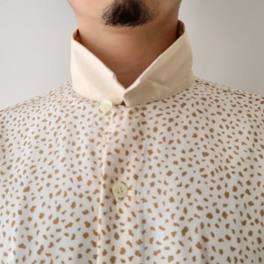 - An open collar shirt made from a soft, draped plain weave material with a powdery texture. An item accented with a color design that is switched in the same color as the humorous COW pattern.