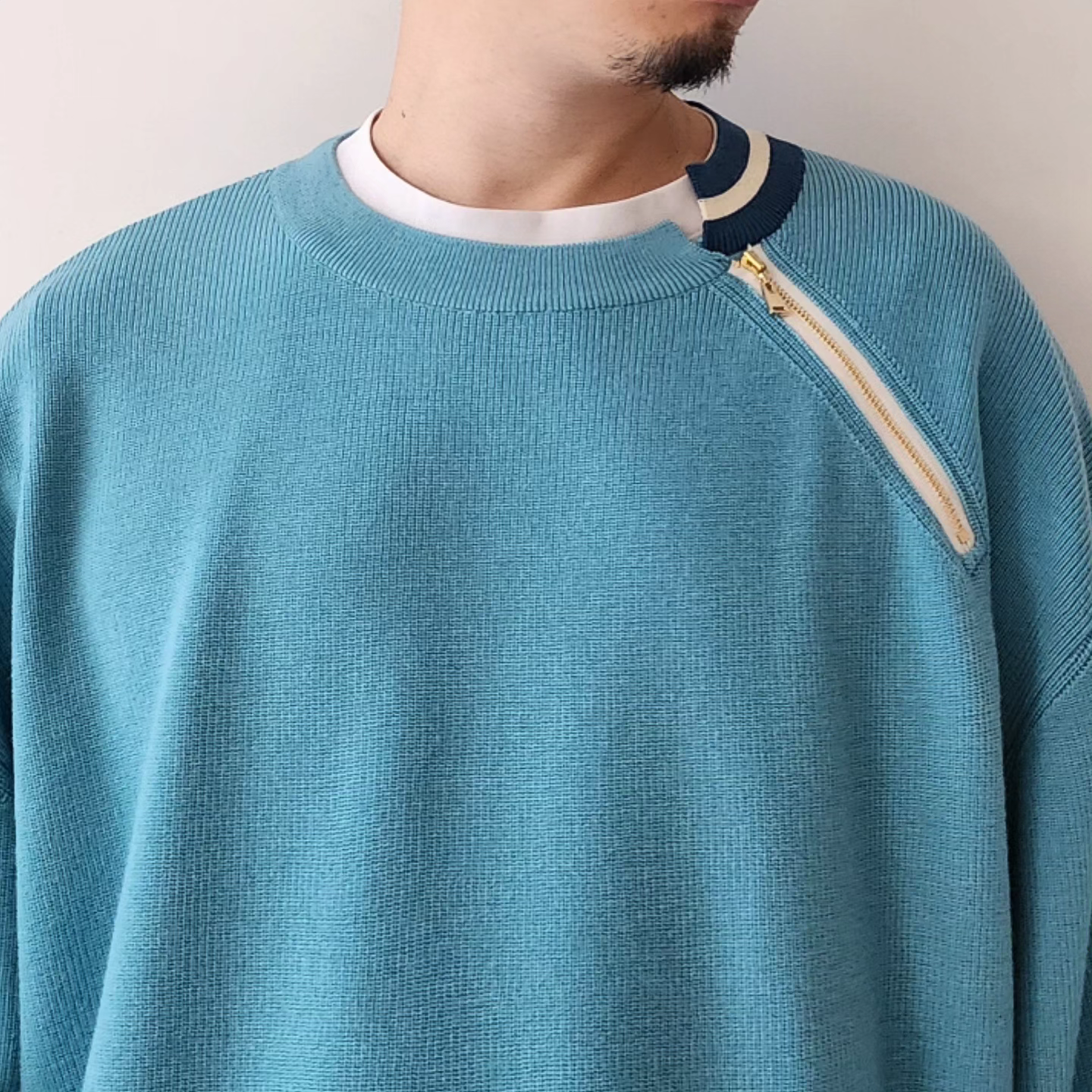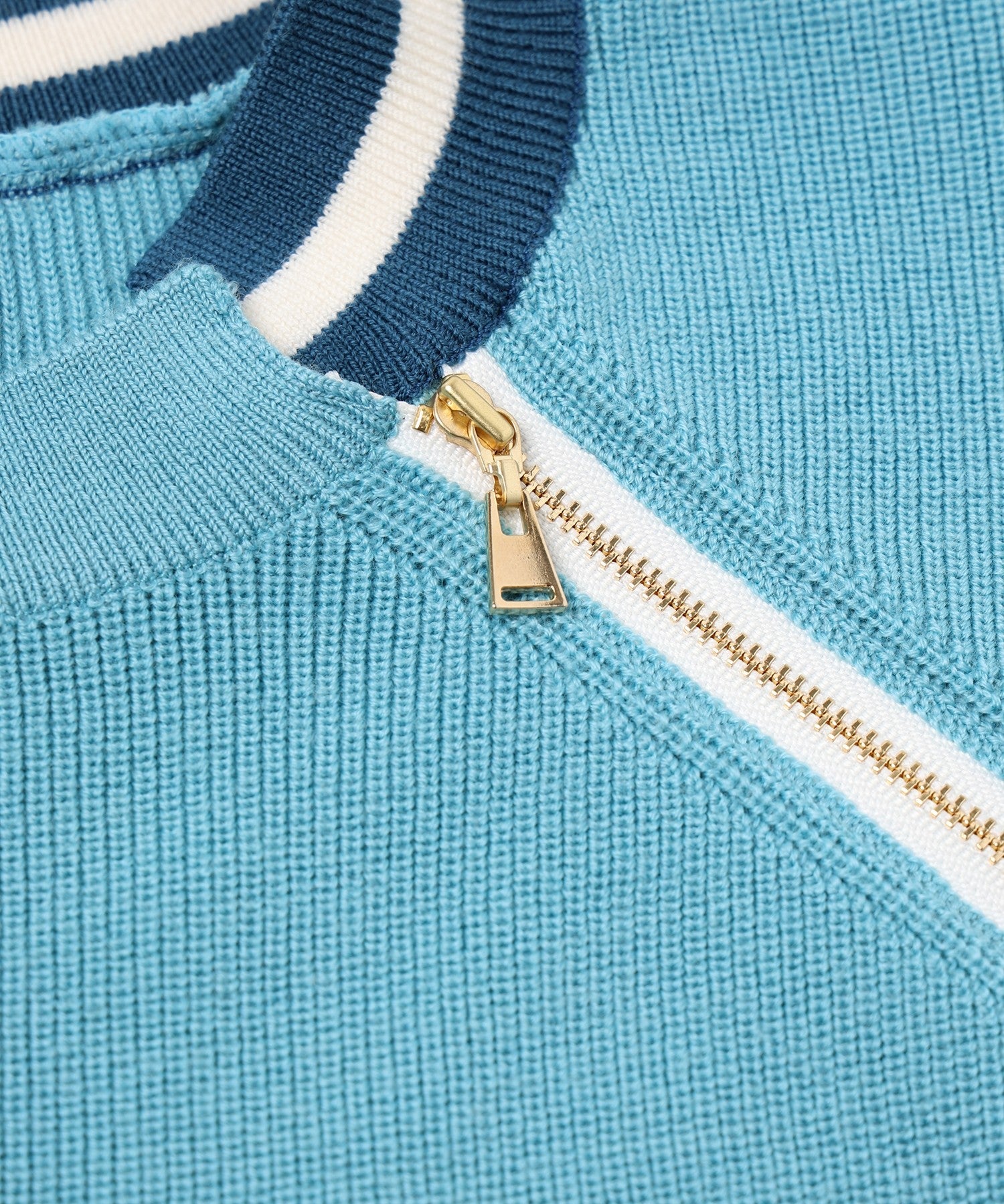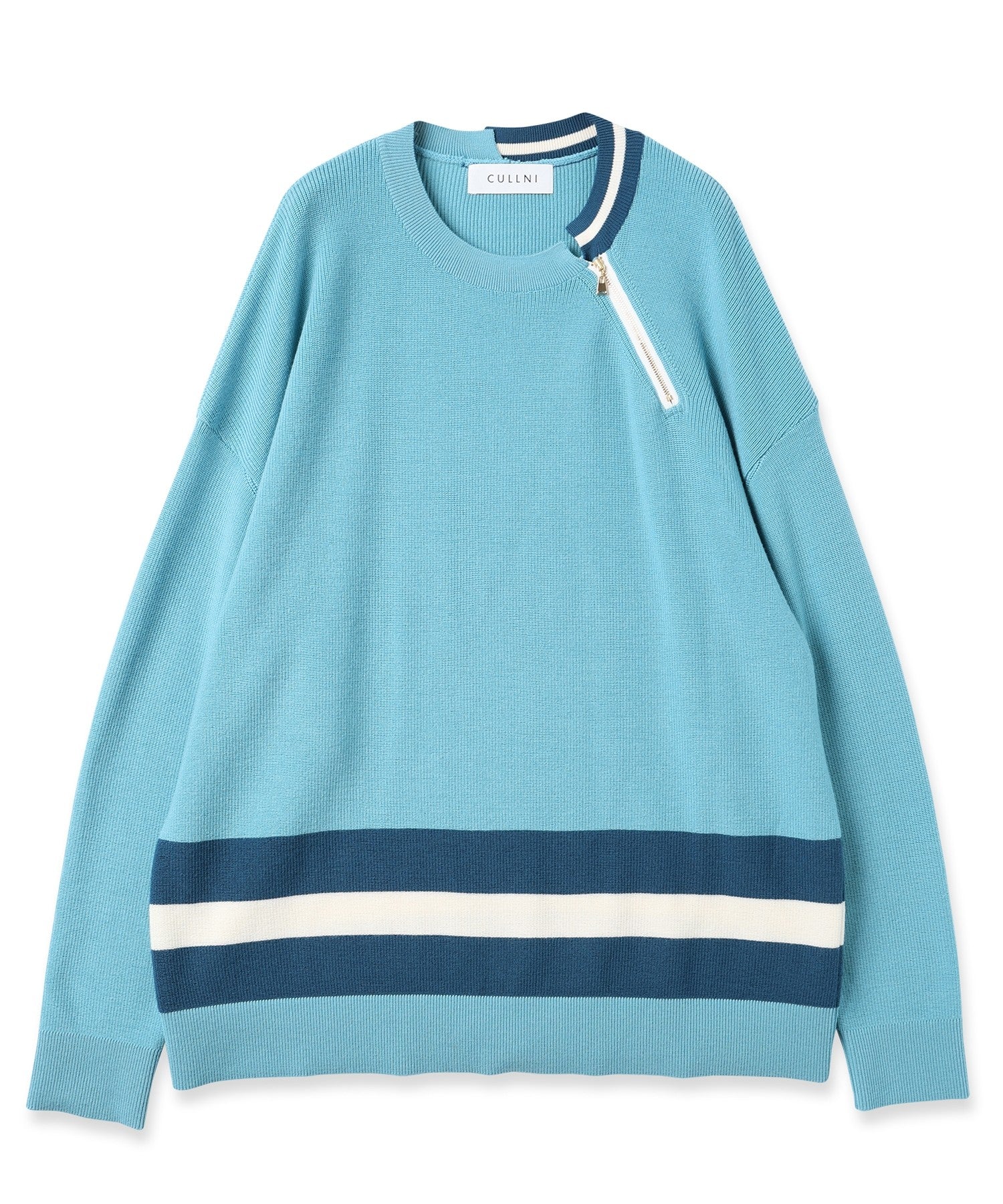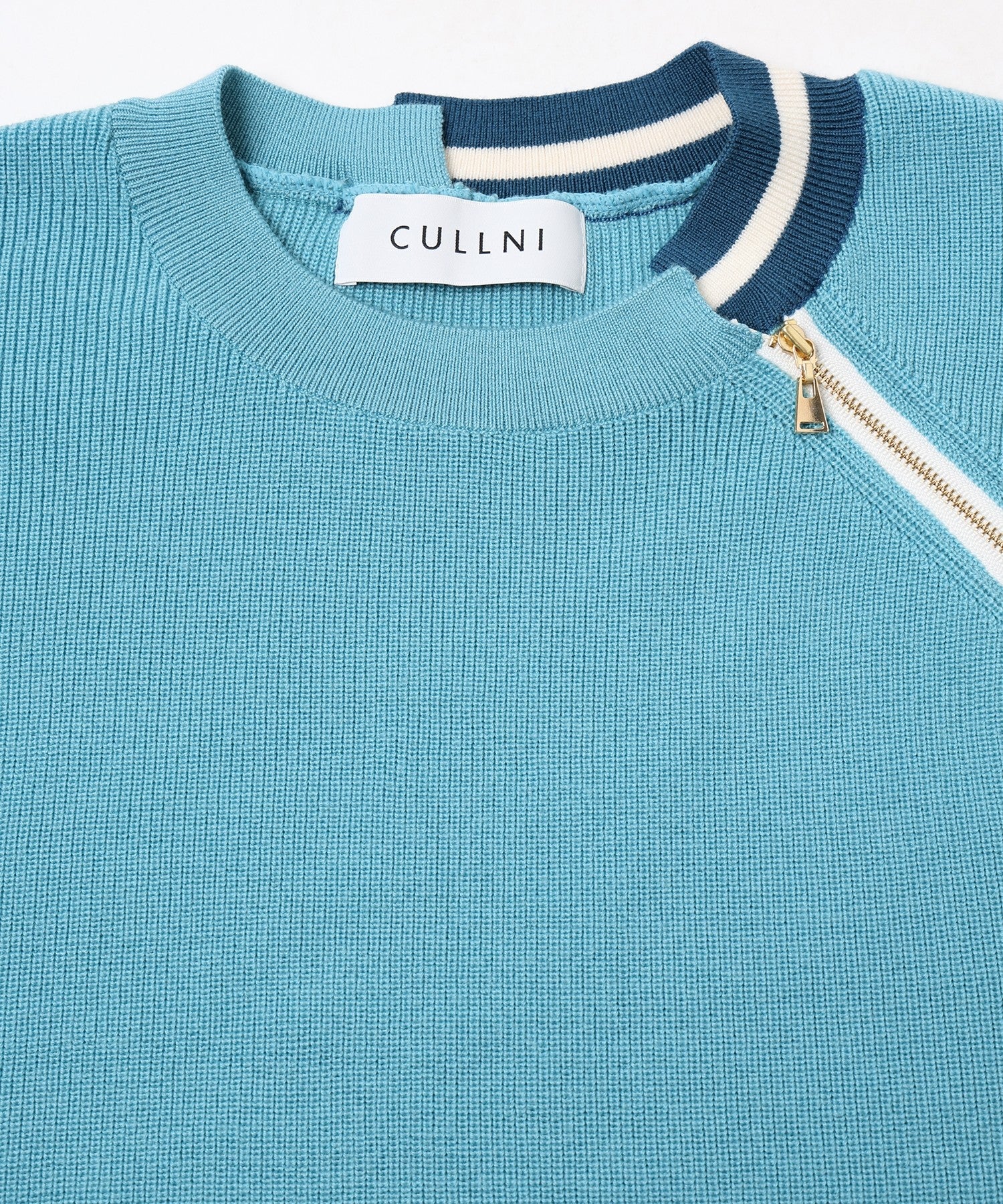 -Gold zipper on asymmetrical neck rib in the same color scheme as the hemline