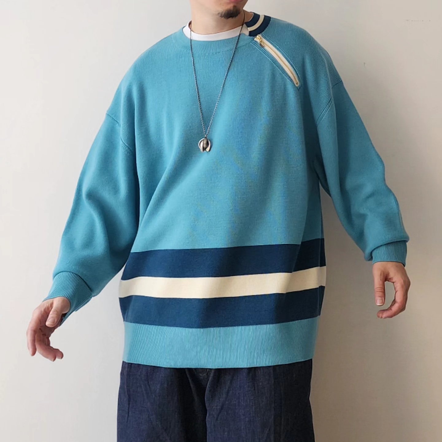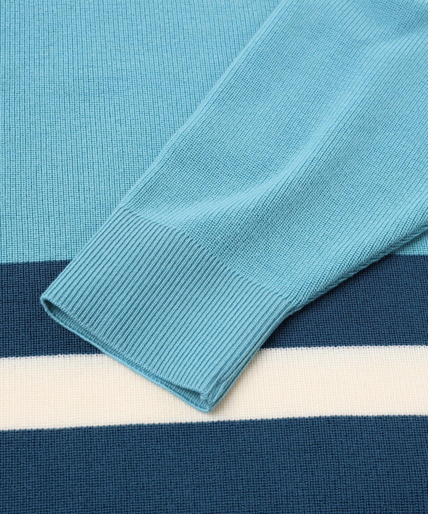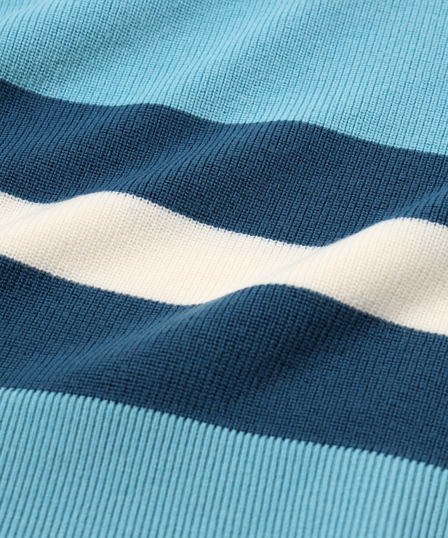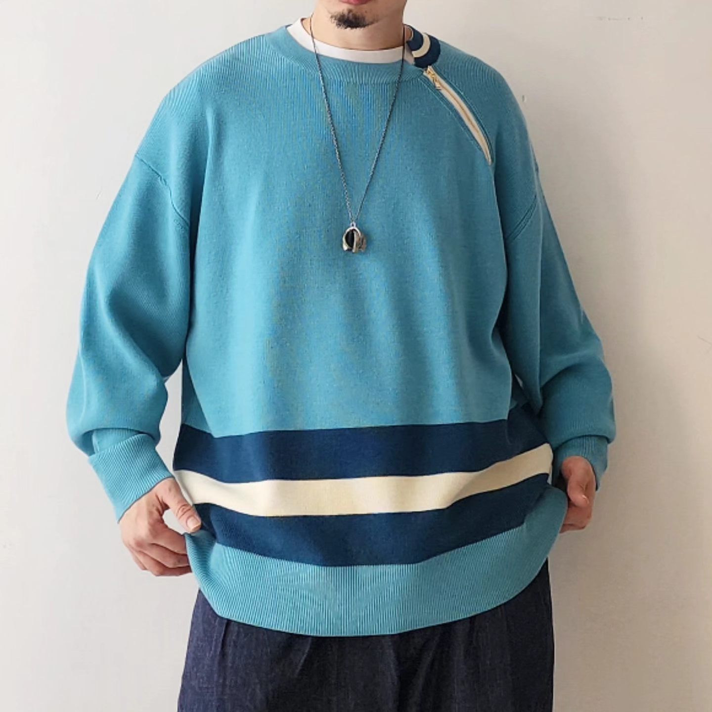 -Gold zipper on asymmetrical neck rib in the same color scheme as the hemline