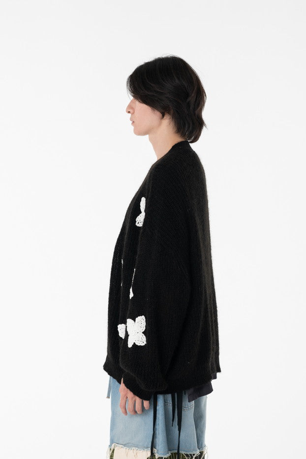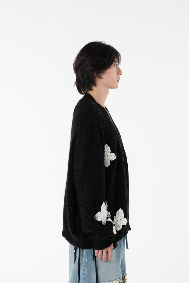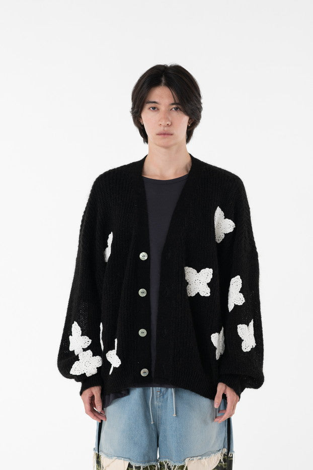 This knit cardigan is crafted from lightweight, lustrous mohair. Its relaxed silhouette and hand-crocheted butterfly motif are the highlights.