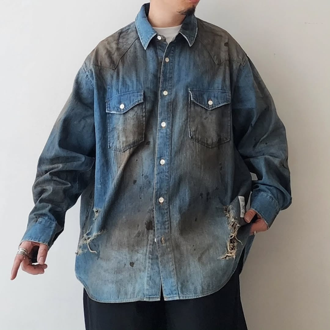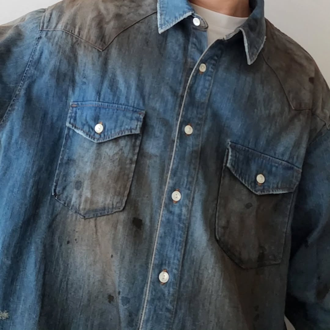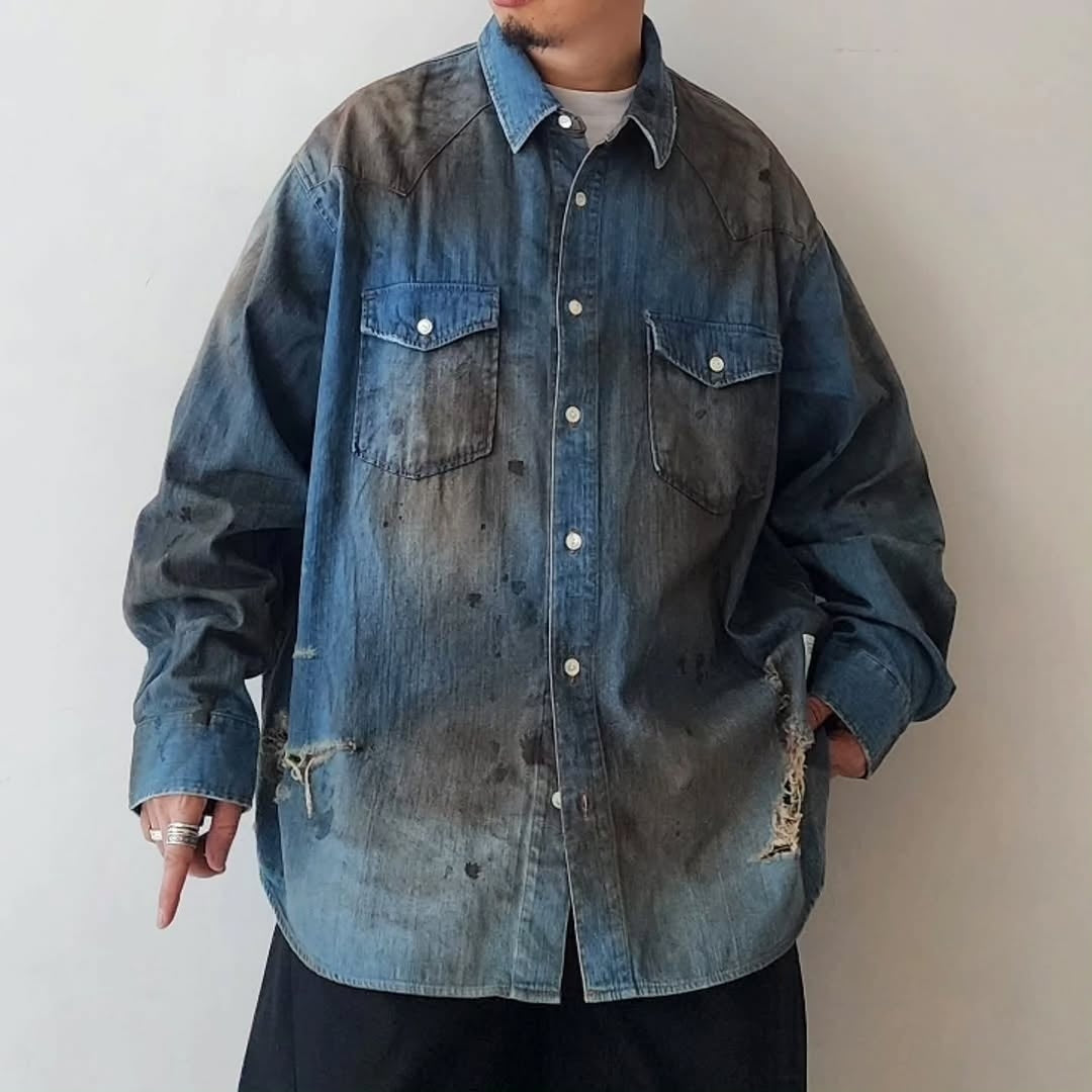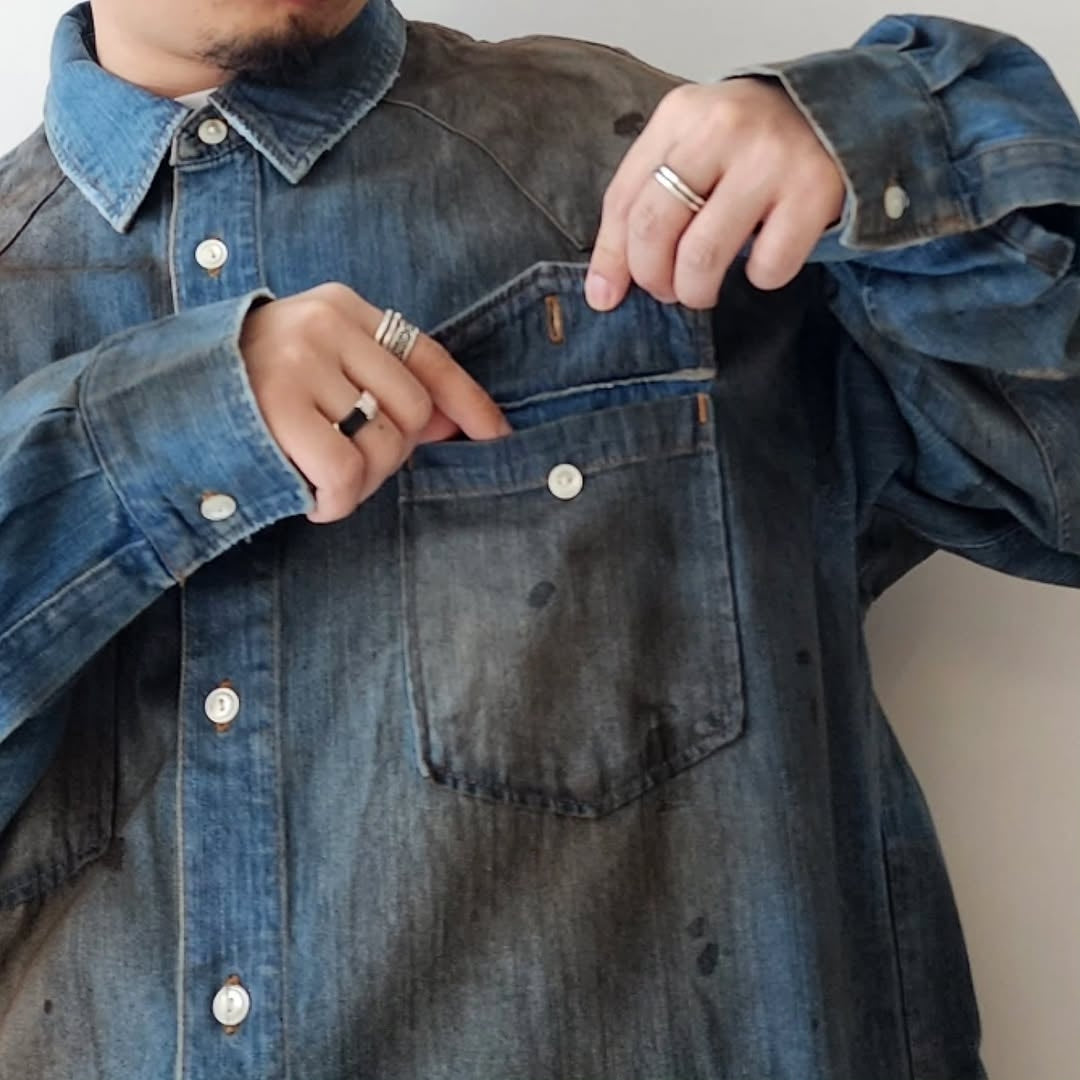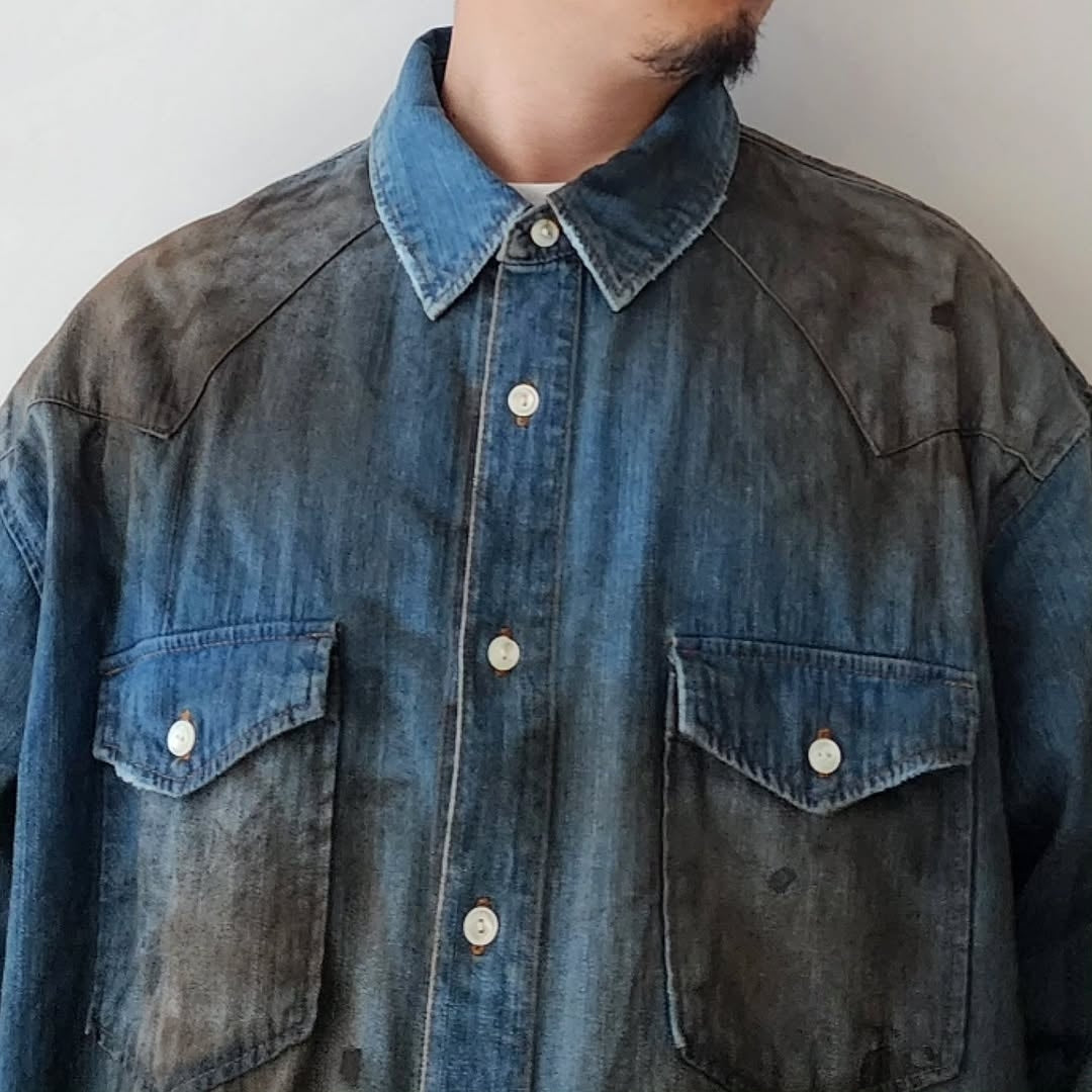 This denim shirt is crafted from 9oz warp and uneven yarns, creating a textured look. The carefully crafted vintage treatments include rubbing, perforations, overdyeing, and oil stains. The slightly wide silhouette makes it easy to incorporate into any outfit, perfectly suited to the current trend.
