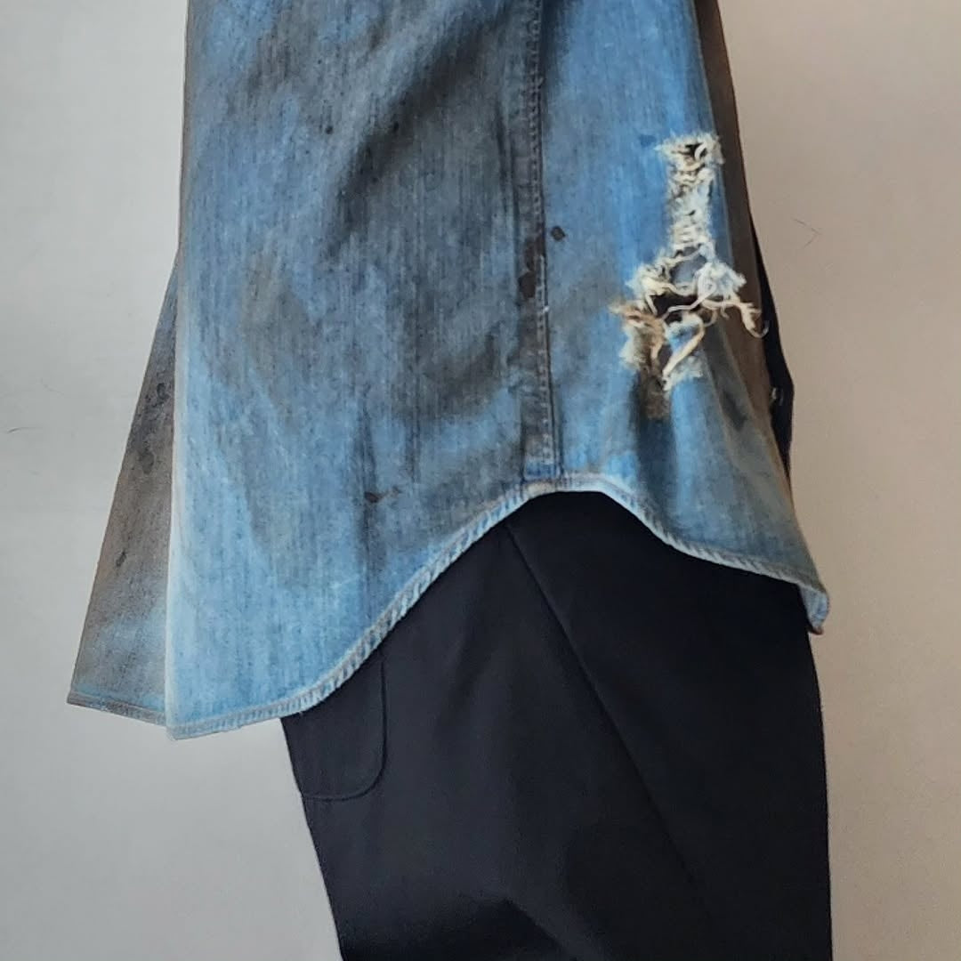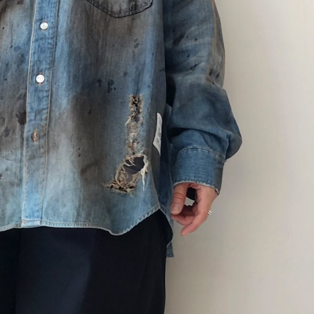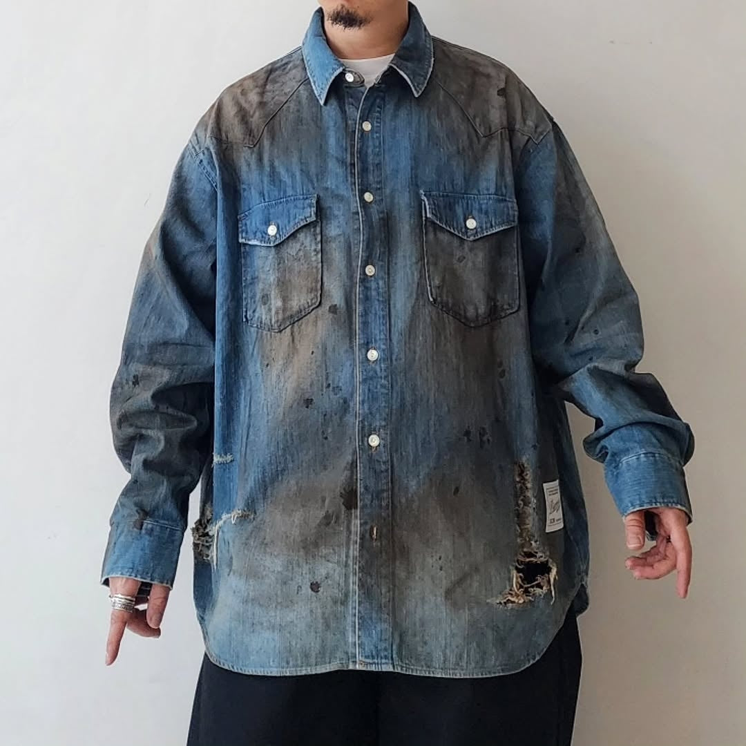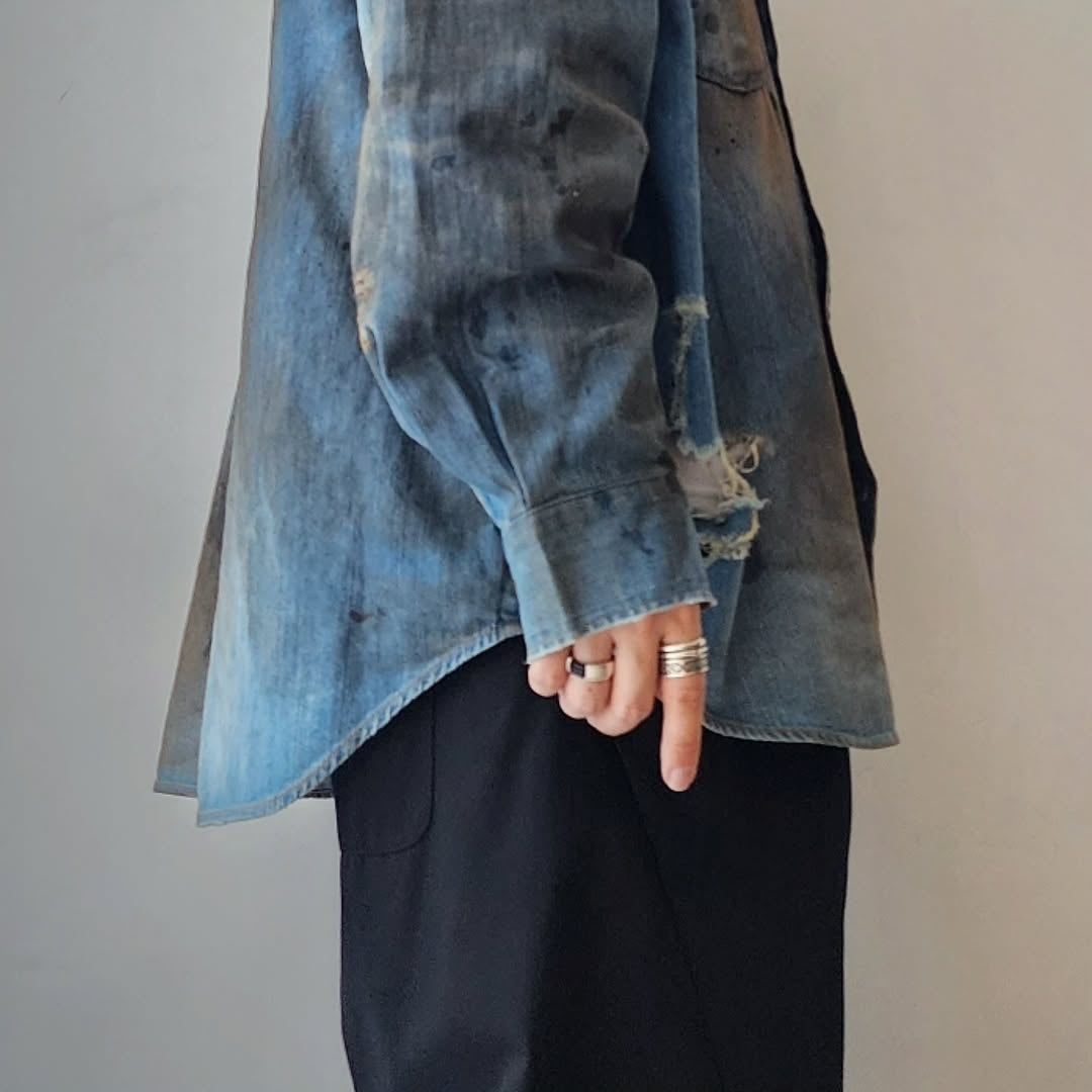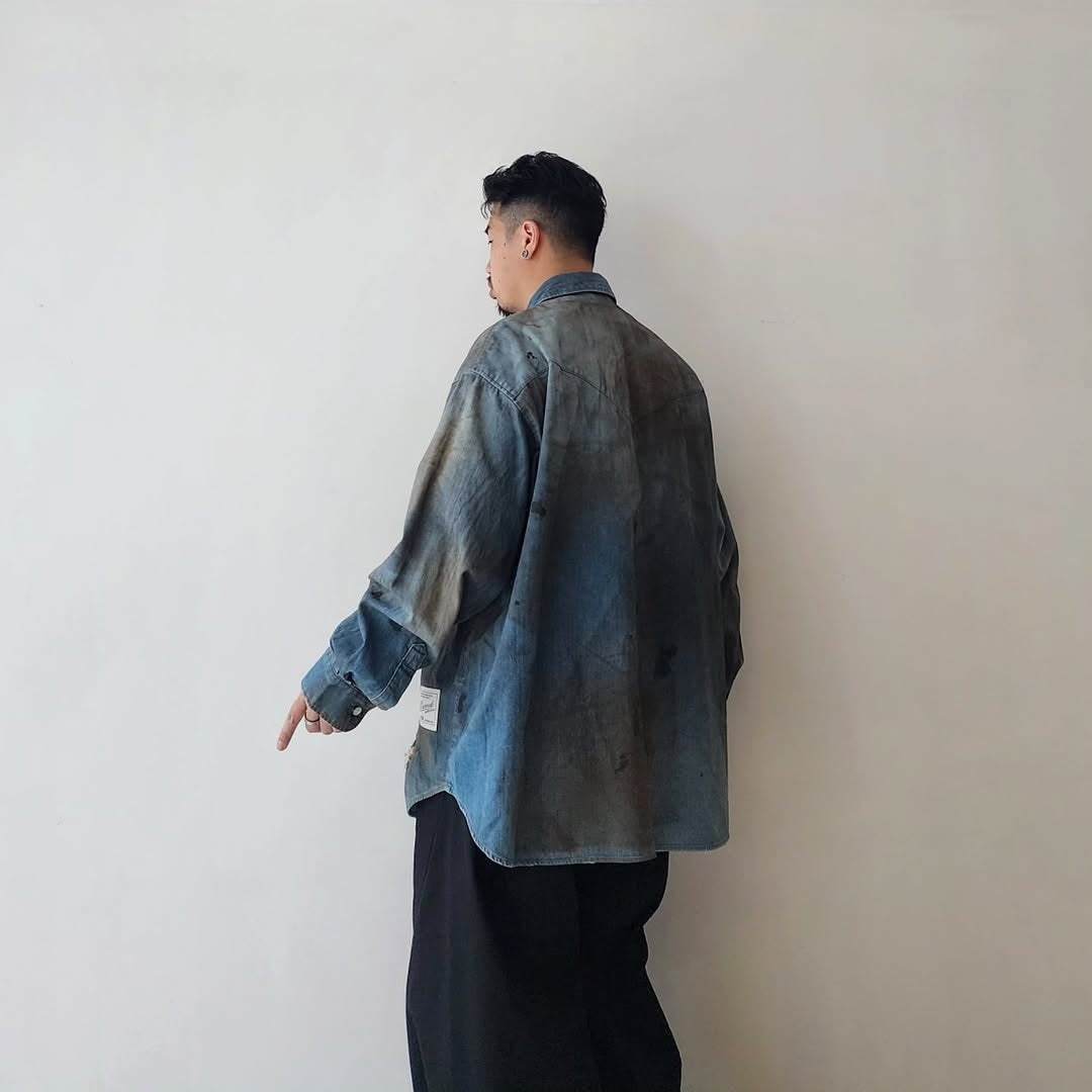 This denim shirt is crafted from 9oz warp and uneven yarns, creating a textured look. The carefully crafted vintage treatments include rubbing, perforations, overdyeing, and oil stains. The slightly wide silhouette makes it easy to incorporate into any outfit, perfectly suited to the current trend.