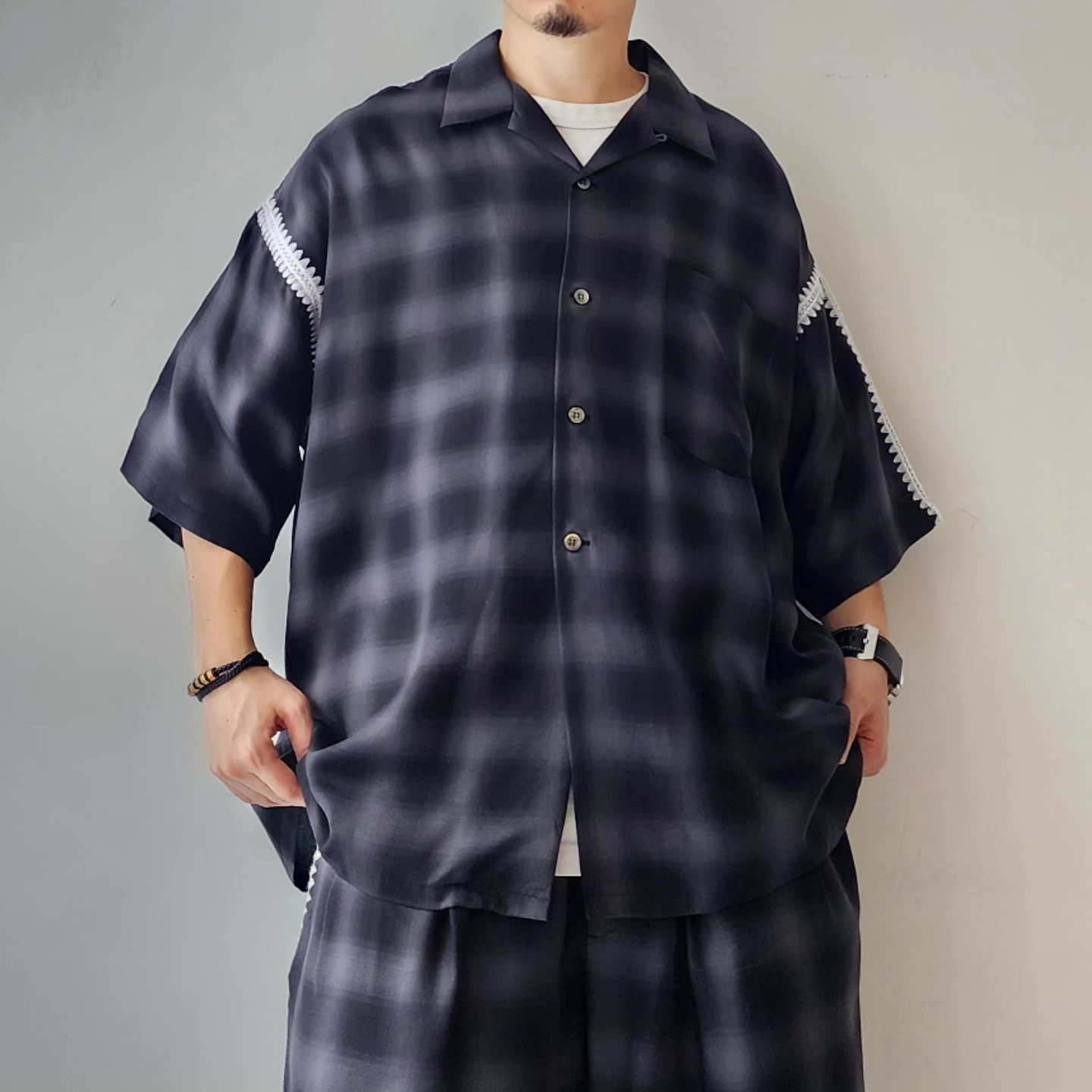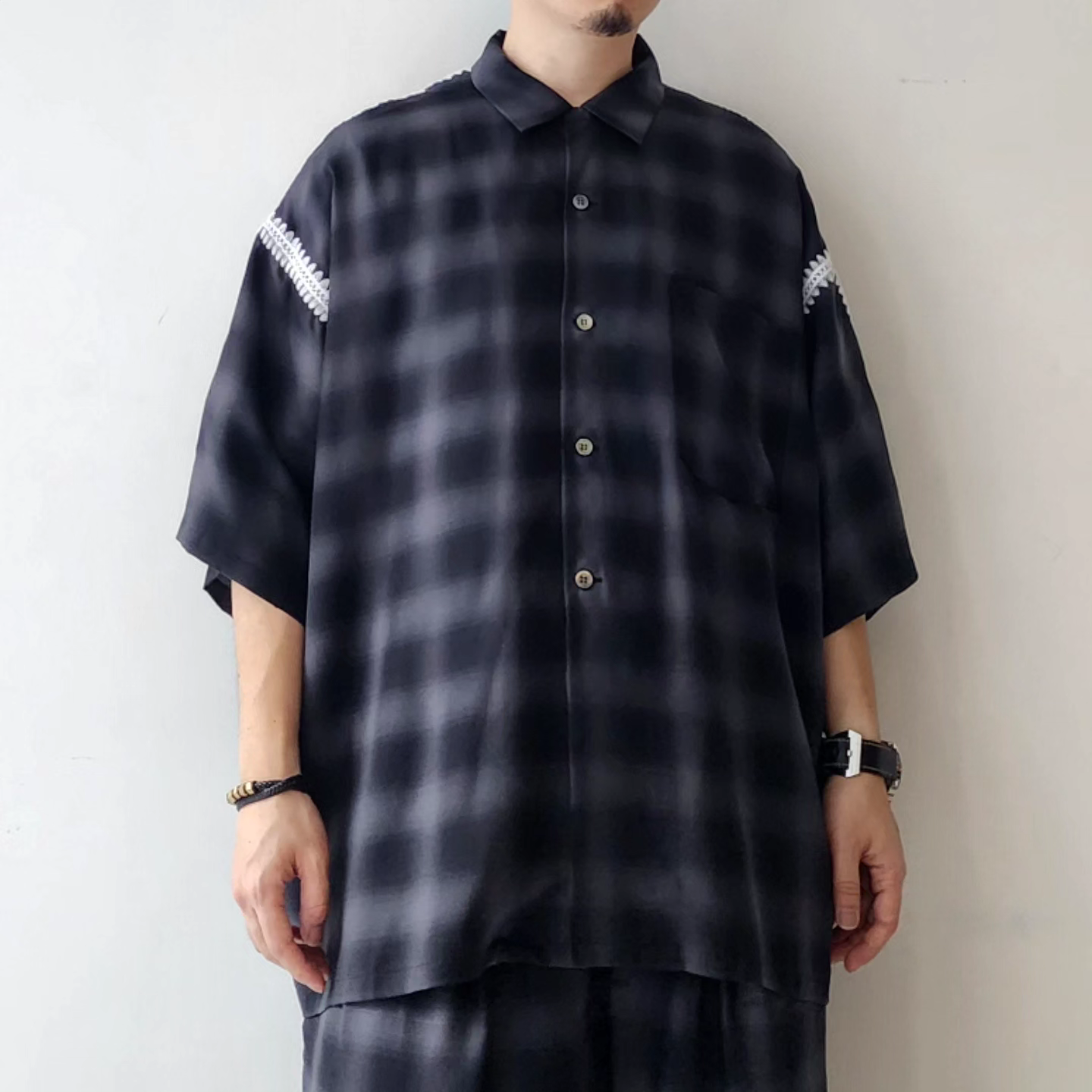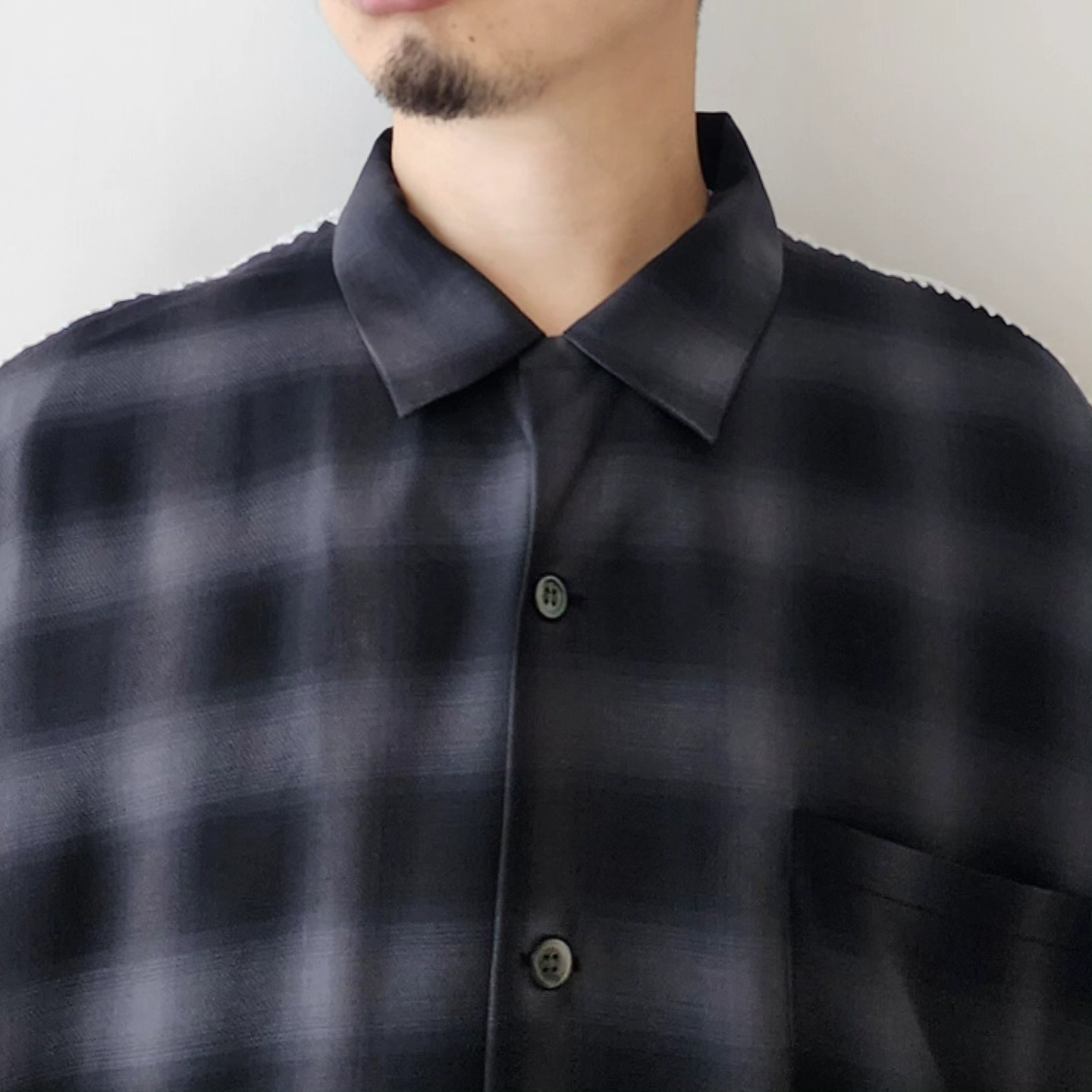 -Amundsen ombre check with beautiful supple drape. It is characterized by the fine unevenness of the tissue and the smooth feel of the cupra. An item with a moderately roomy silhouette and clam embroidery on the seams.
