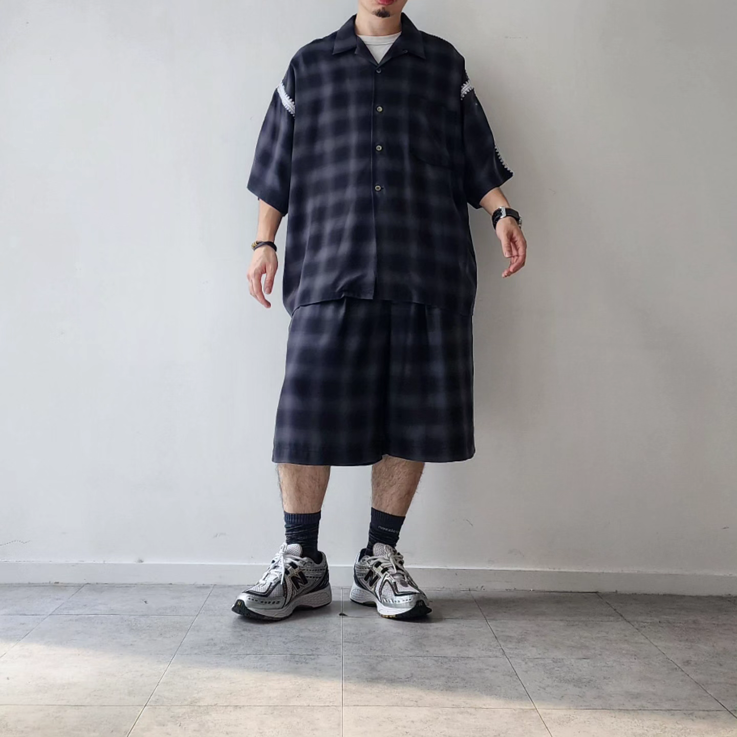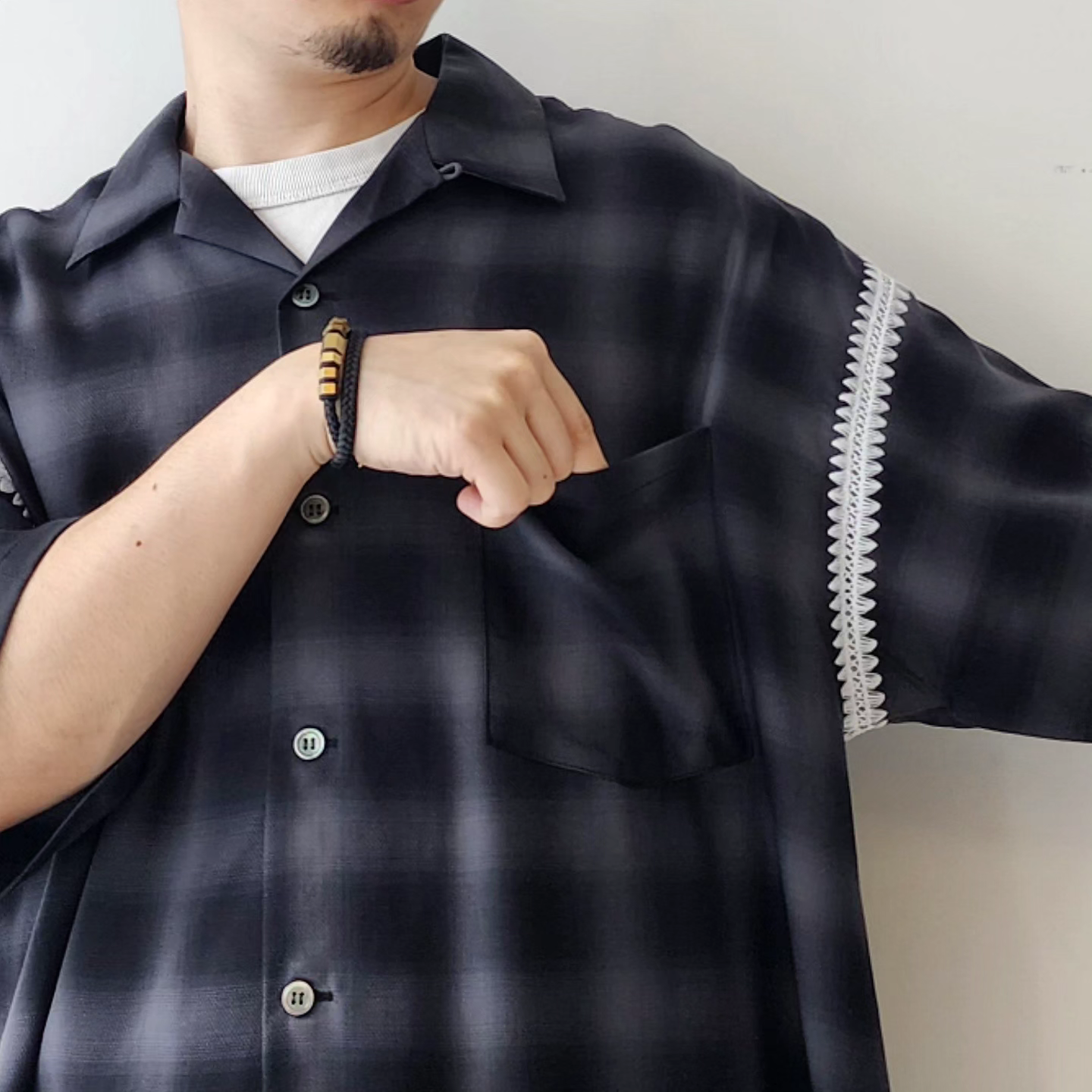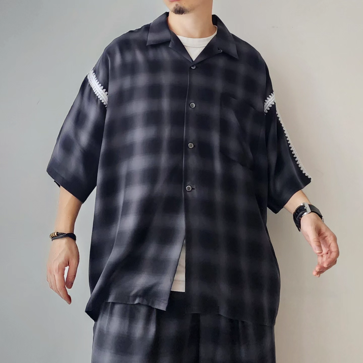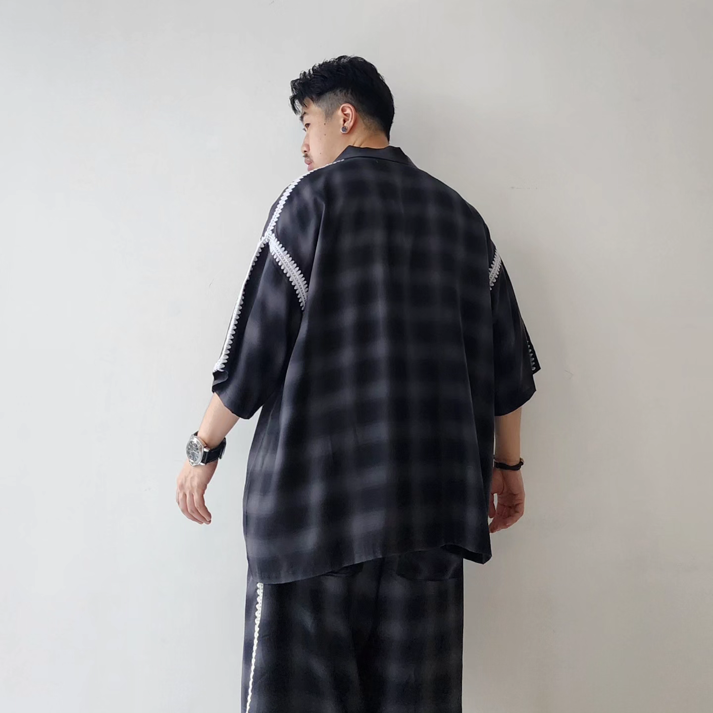 -Amundsen ombre check with beautiful supple drape. It is characterized by the fine unevenness of the tissue and the smooth feel of the cupra. An item with a moderately roomy silhouette and clam embroidery on the seams.