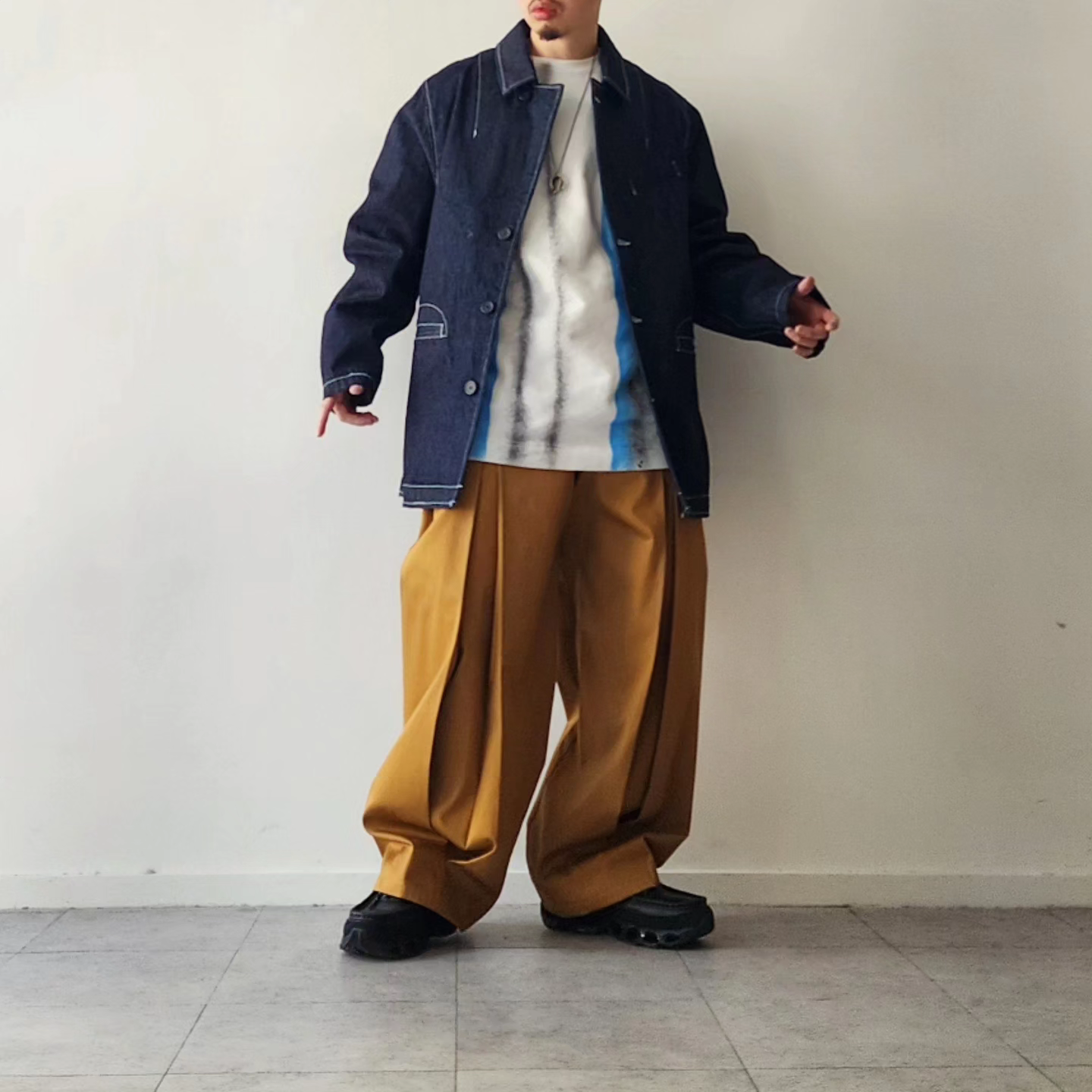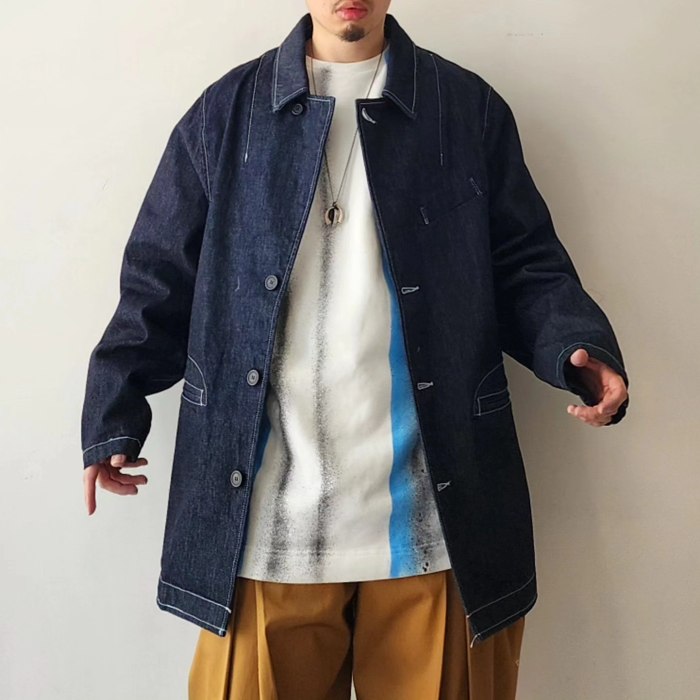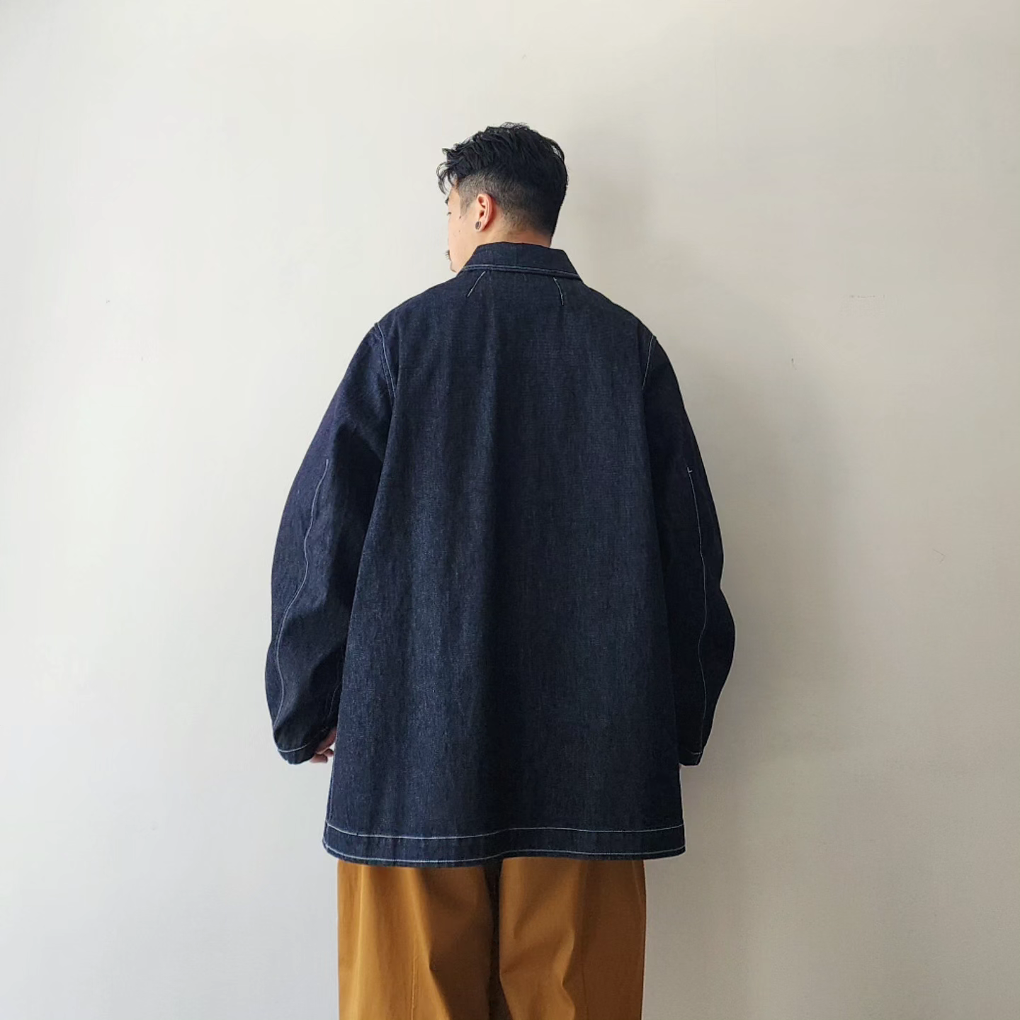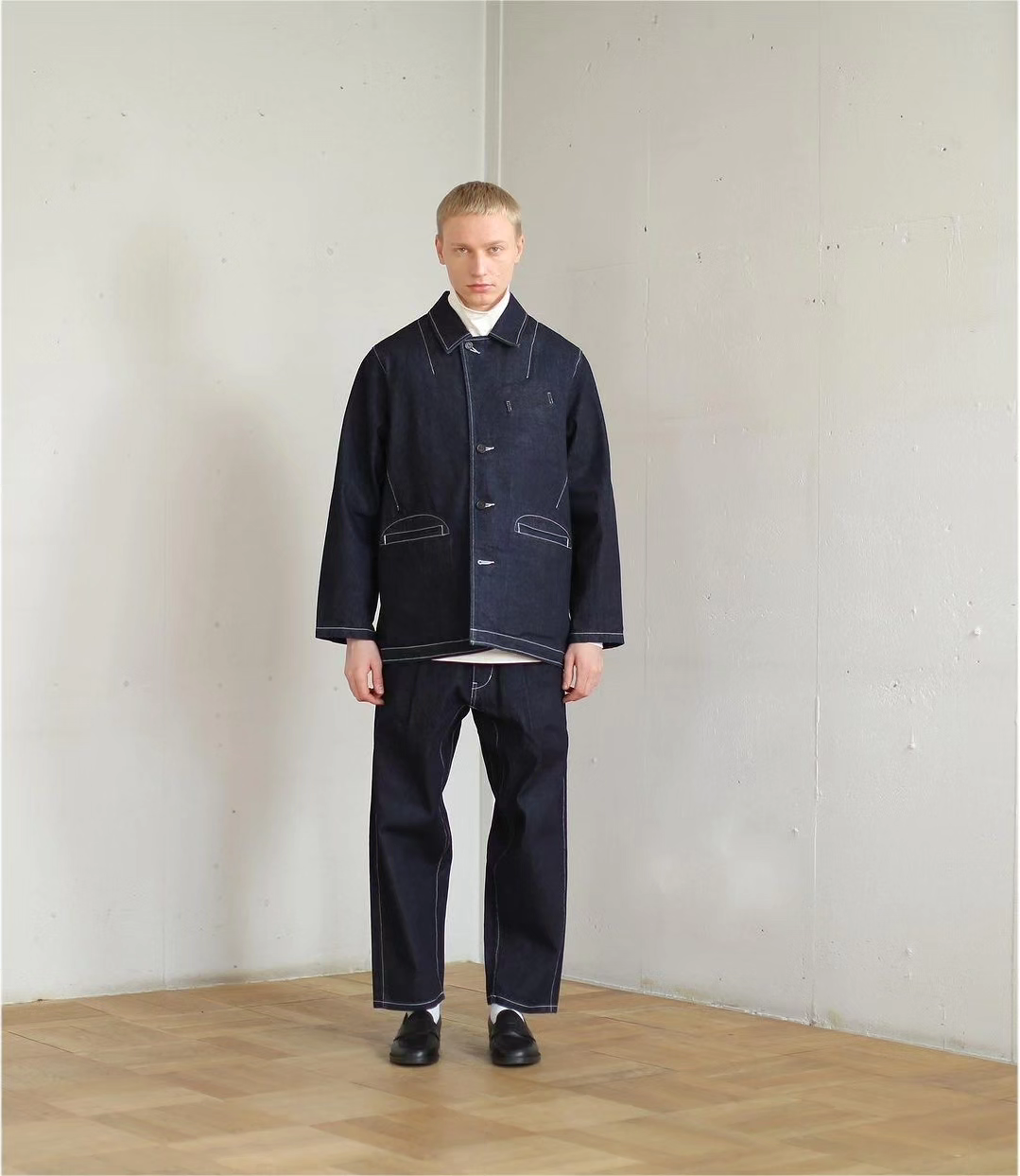 This jacket mixes the essence of tailoring with 3D patterns and the tool-like elements of coveralls"