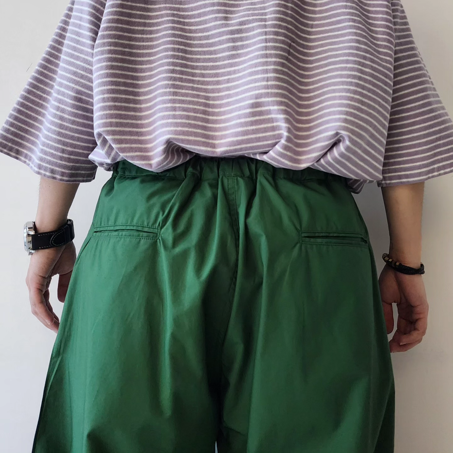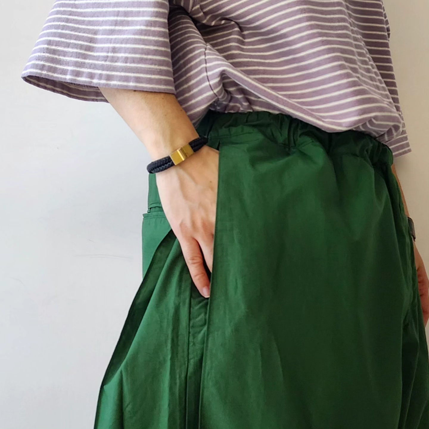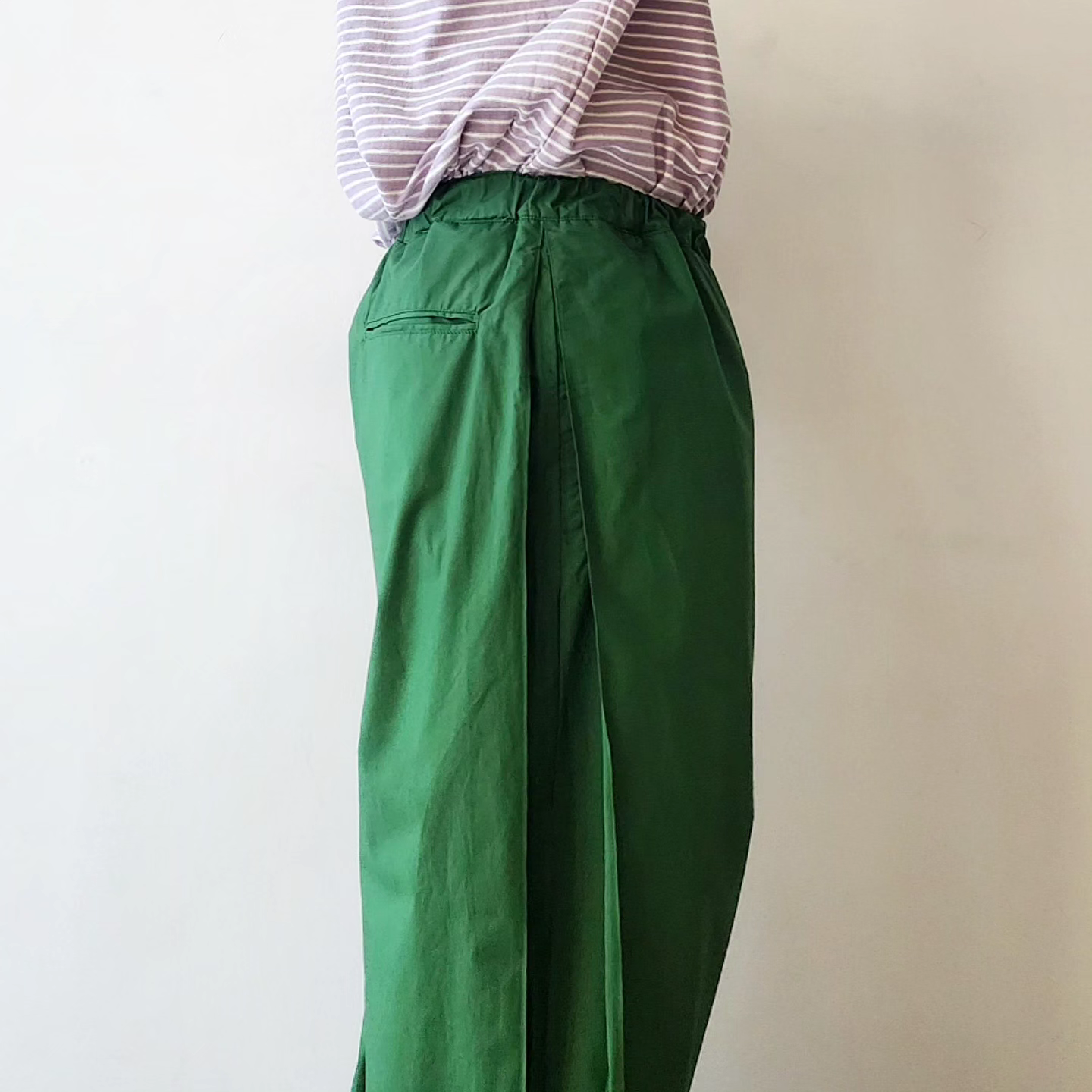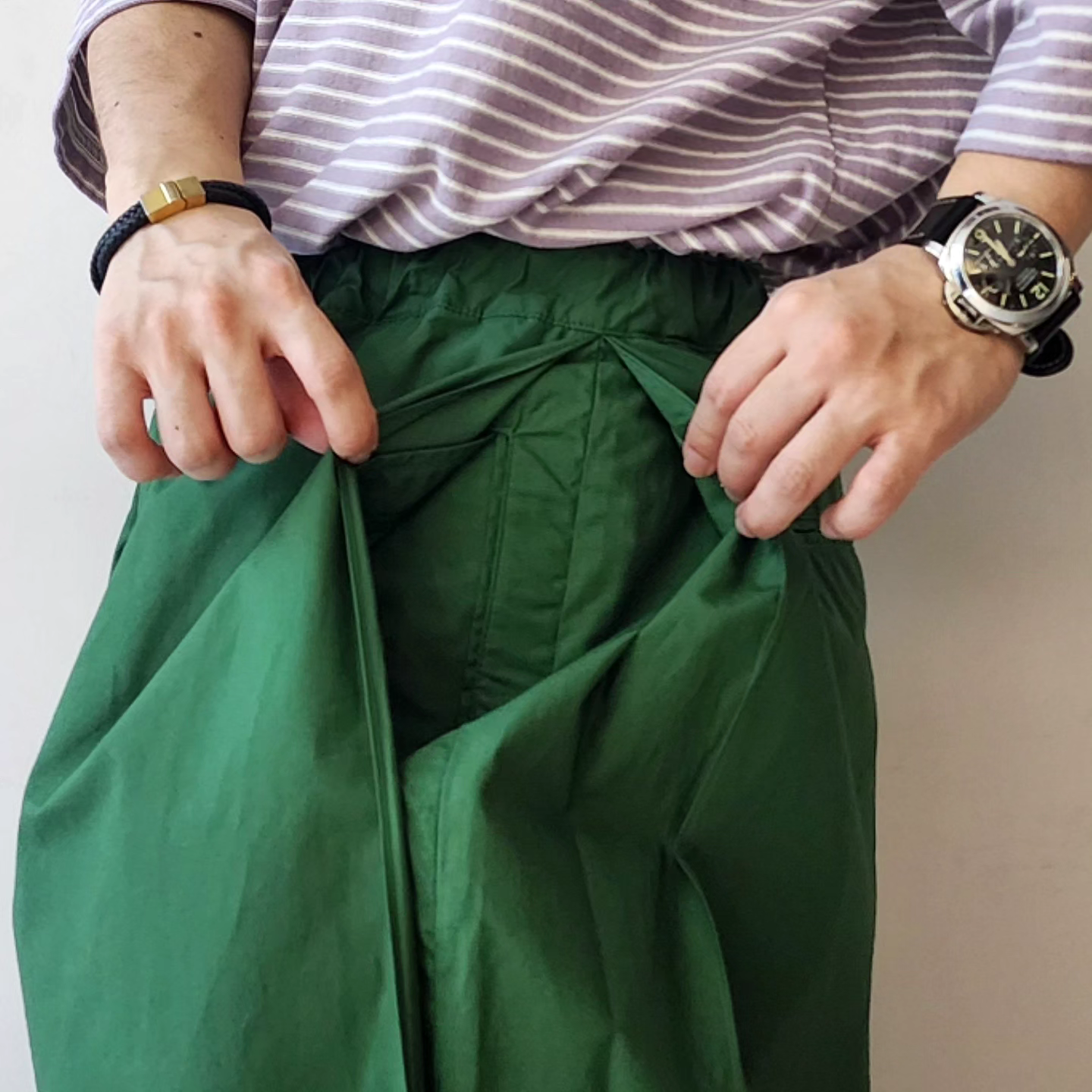 -The side tucks create a bold volume, and the hem creates an impressive silhouette.  With a cute, rounded expression and a line that gives you a sense of quality, it would be nice to wear it with a shirt or jacket.  The waist is elastic and drawstring, and the rise and thighs are roomy, making it easy to wear.  You can enjoy styling with free ideas, such as wearing sandals or leather shoes on your feet.