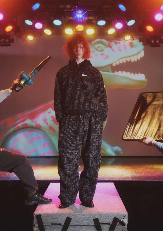 -The fabric is made of tweed with a slightly shiny rayon thread.