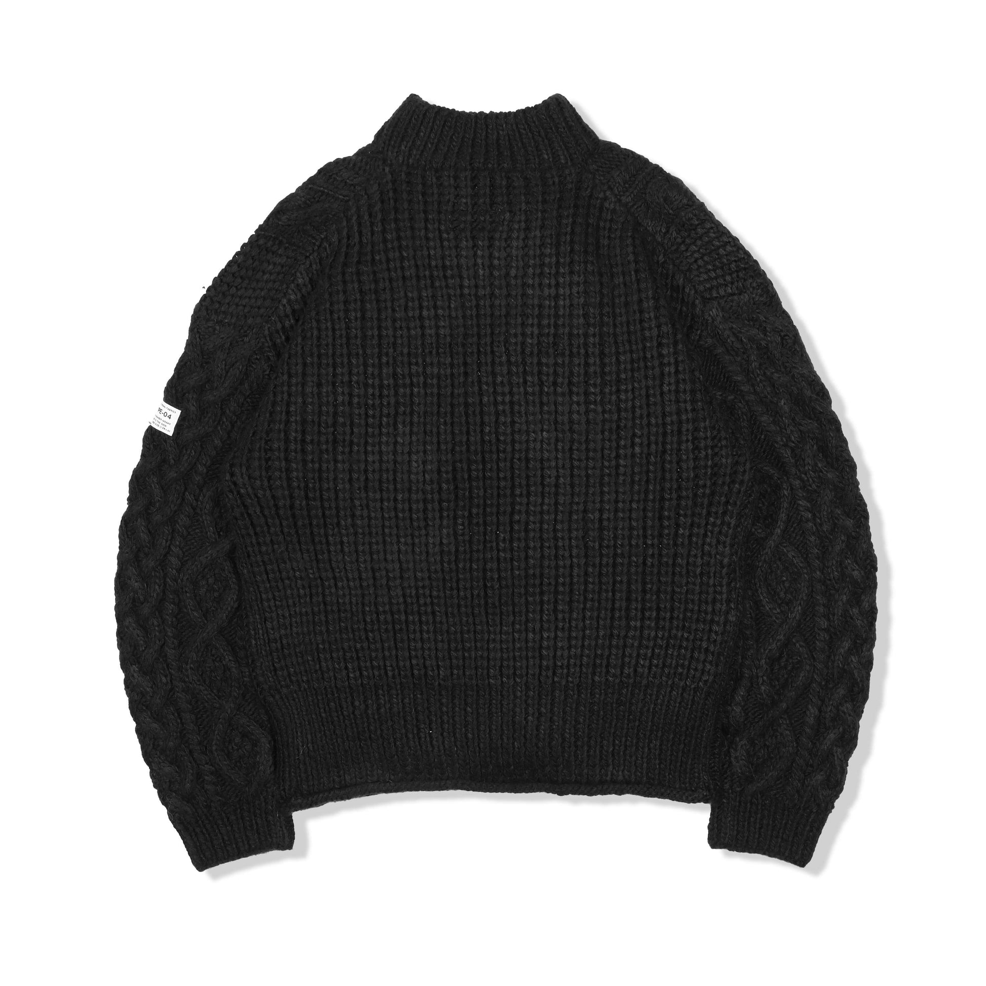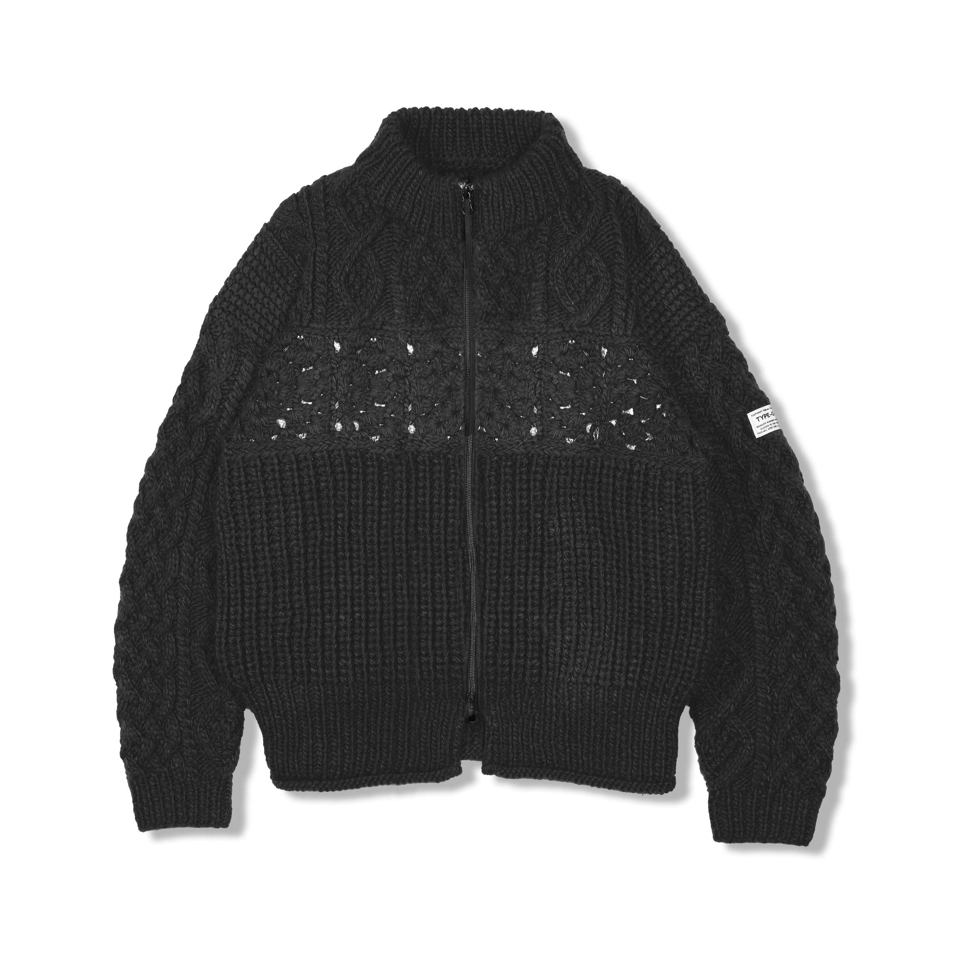 -A zip-up knit that is hand-knitted and combines three types of knit: Aran knit, crochet knit, and single-rib knit.