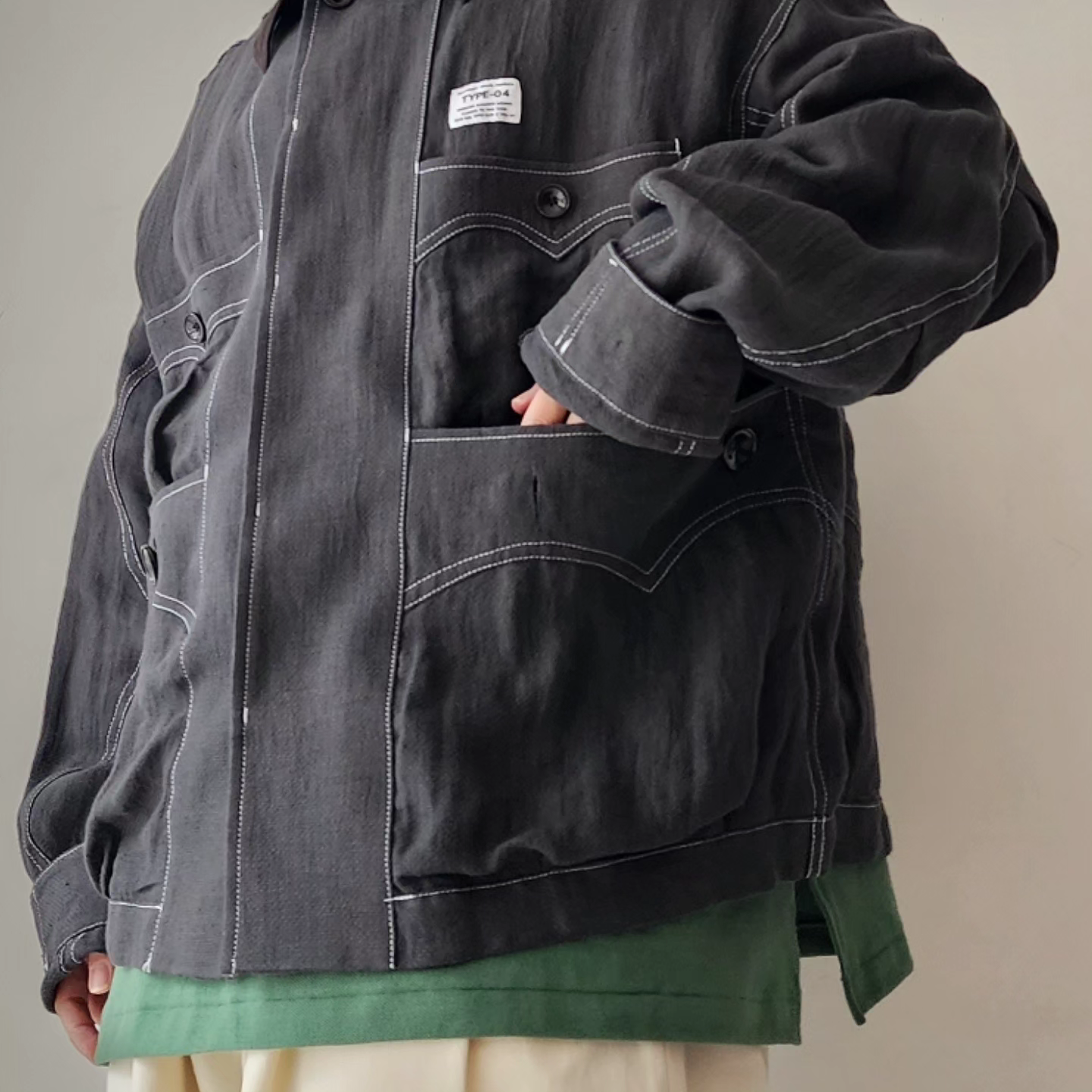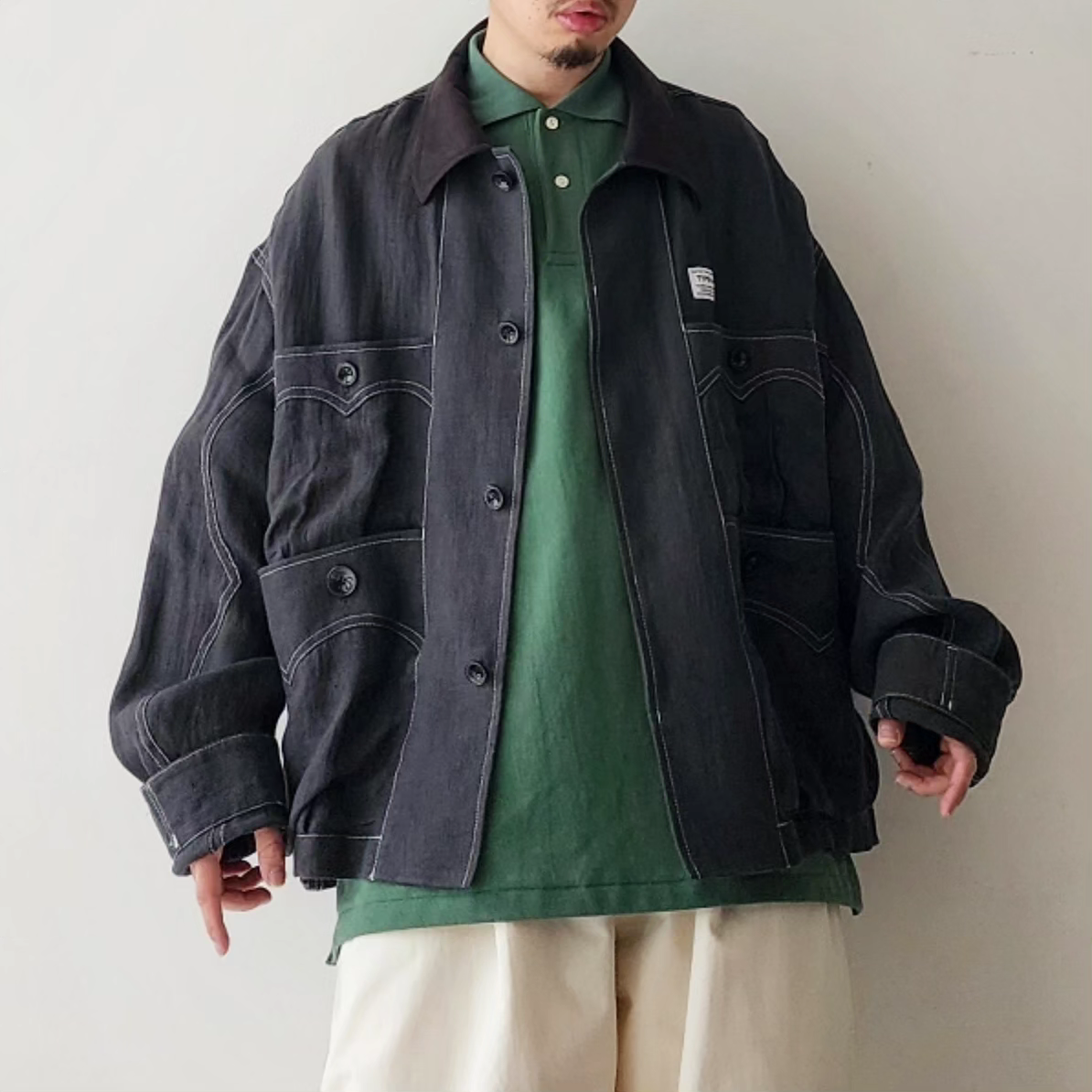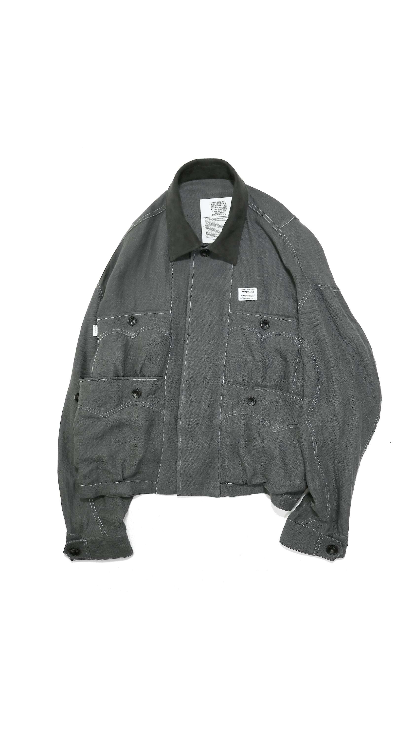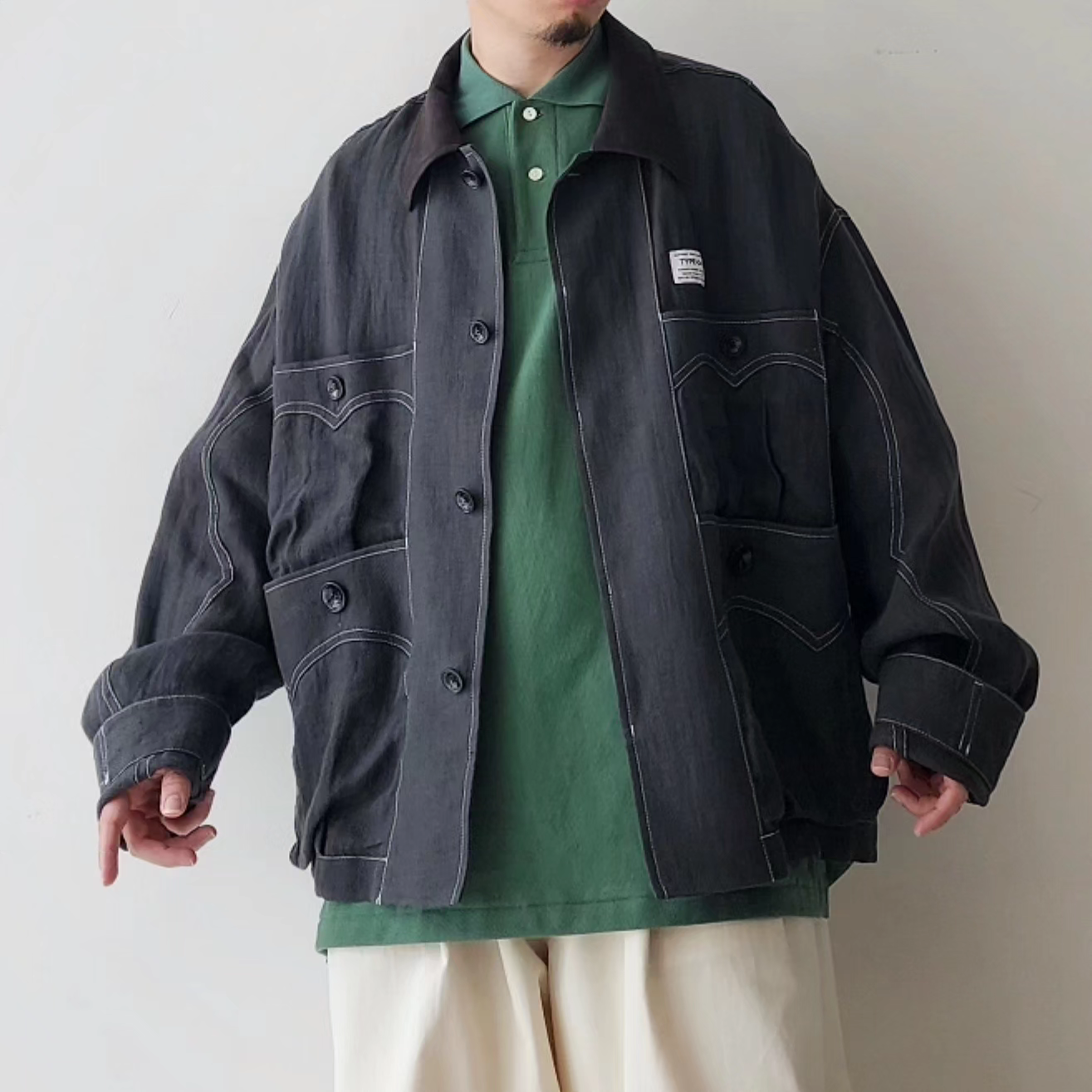 -Inspired by the Cuban shirt, this item has been stripped of pin tucks, embroidery and other decorations. It has six large and small 3D pockets with darts, giving it more storage capacity than a traditional Cuban shirt. The silhouette is boxy with wide armholes. The pockets and sleeves have seagull-shaped details, updating the earthy feel of the original Cuban shirt to a softer impression.