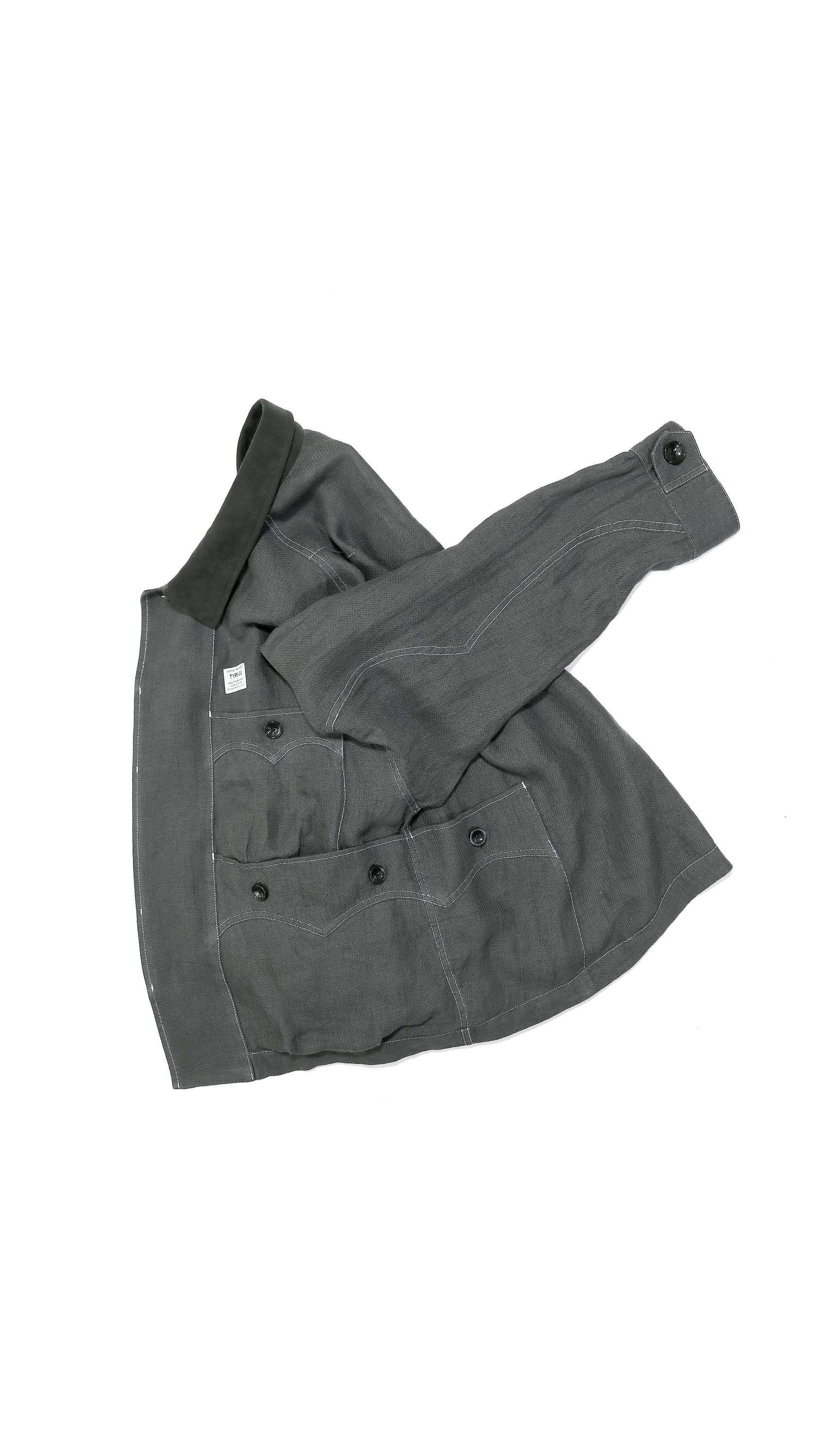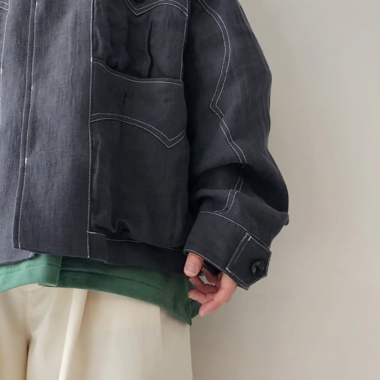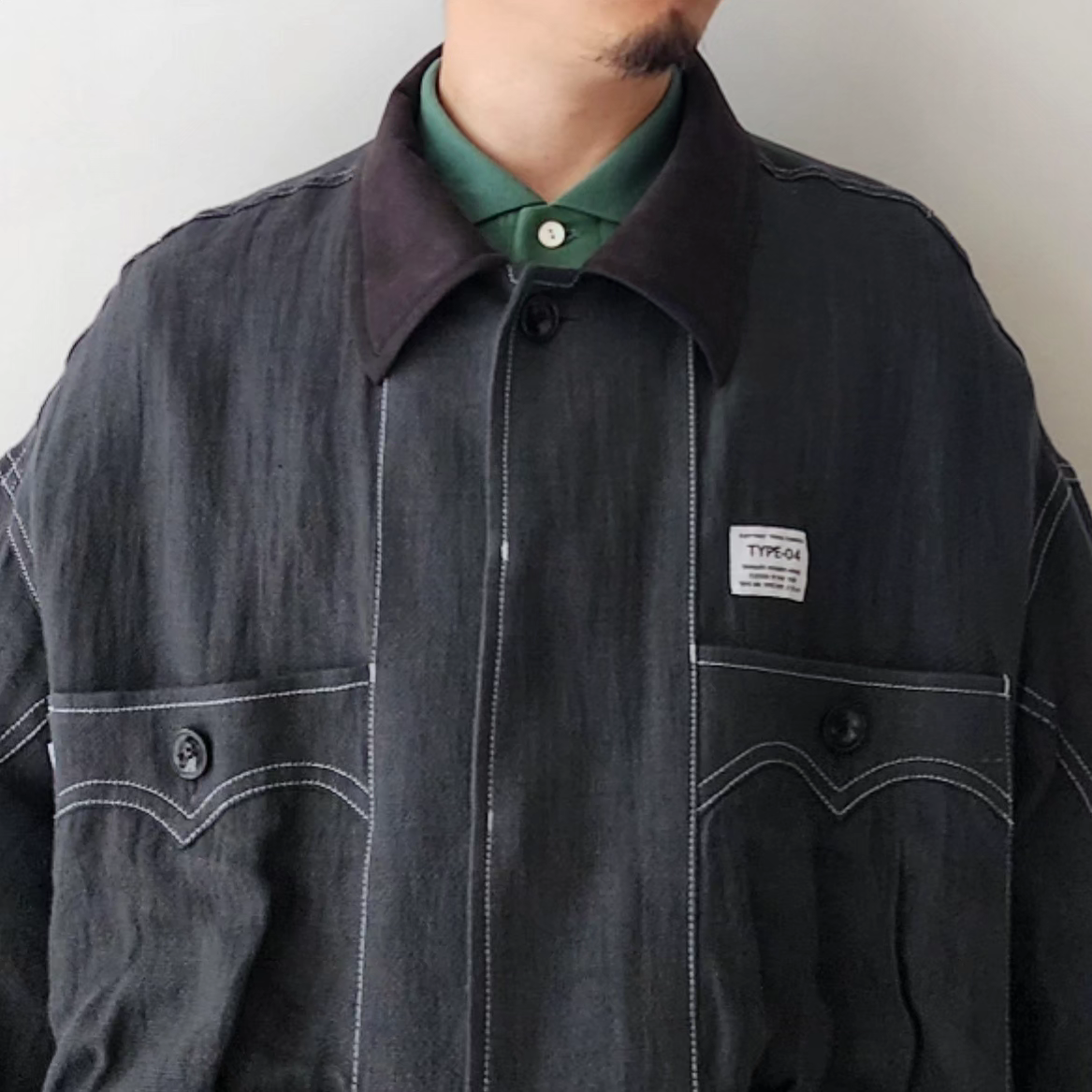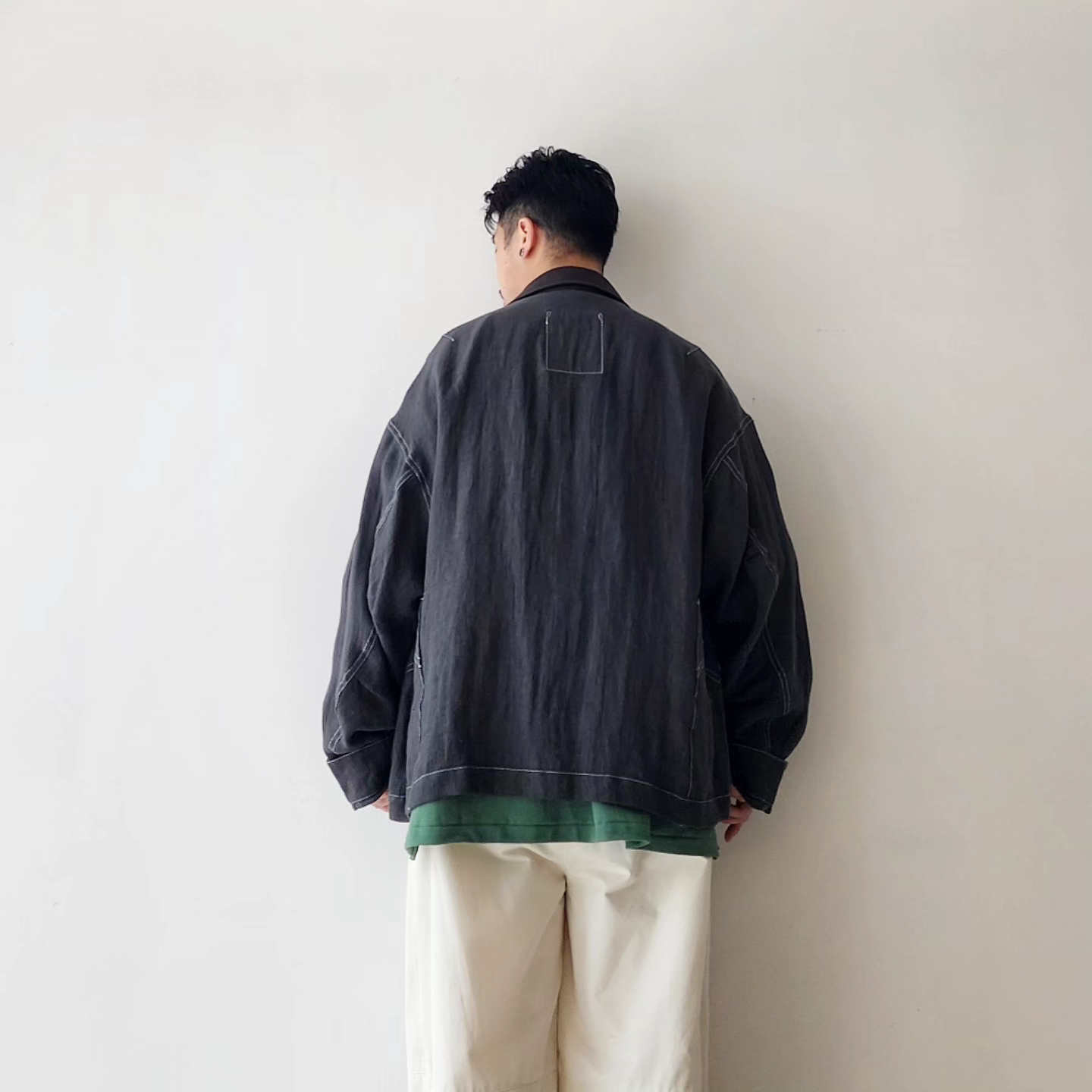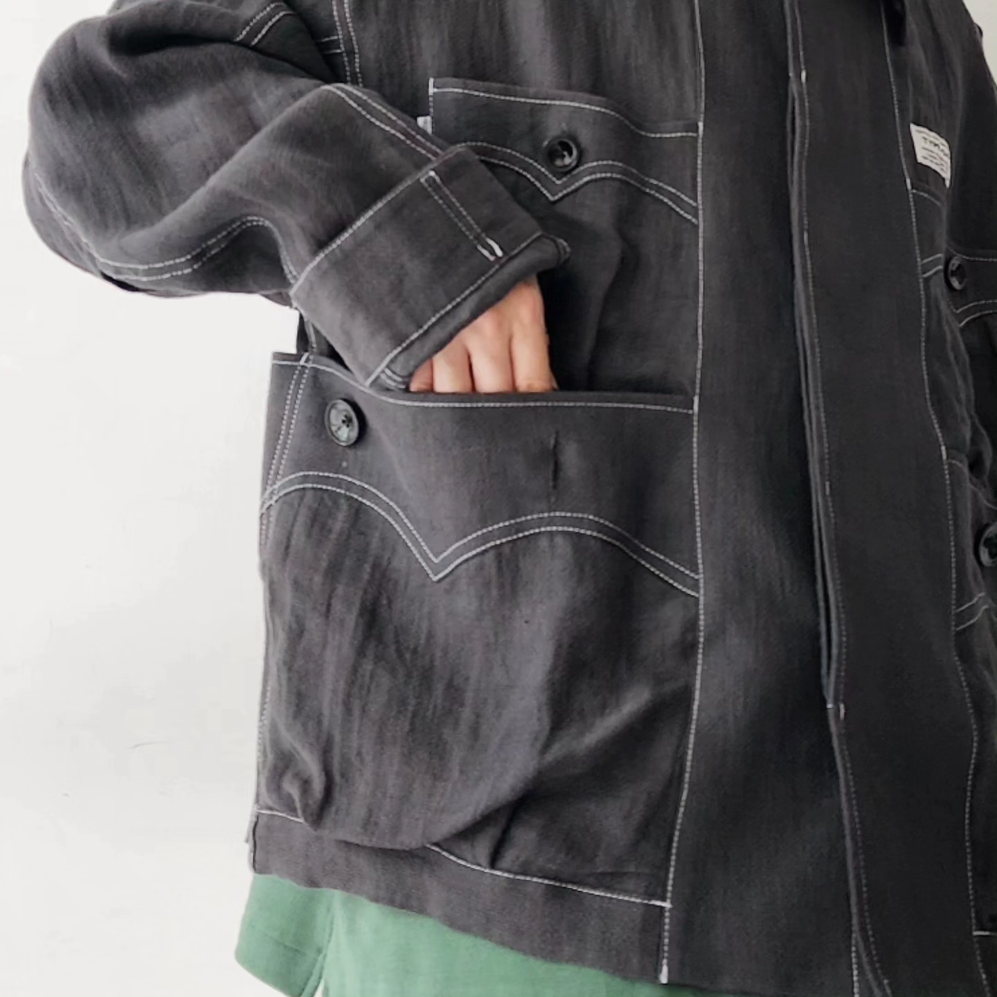 -Inspired by the Cuban shirt, this item has been stripped of pin tucks, embroidery and other decorations. It has six large and small 3D pockets with darts, giving it more storage capacity than a traditional Cuban shirt. The silhouette is boxy with wide armholes. The pockets and sleeves have seagull-shaped details, updating the earthy feel of the original Cuban shirt to a softer impression.