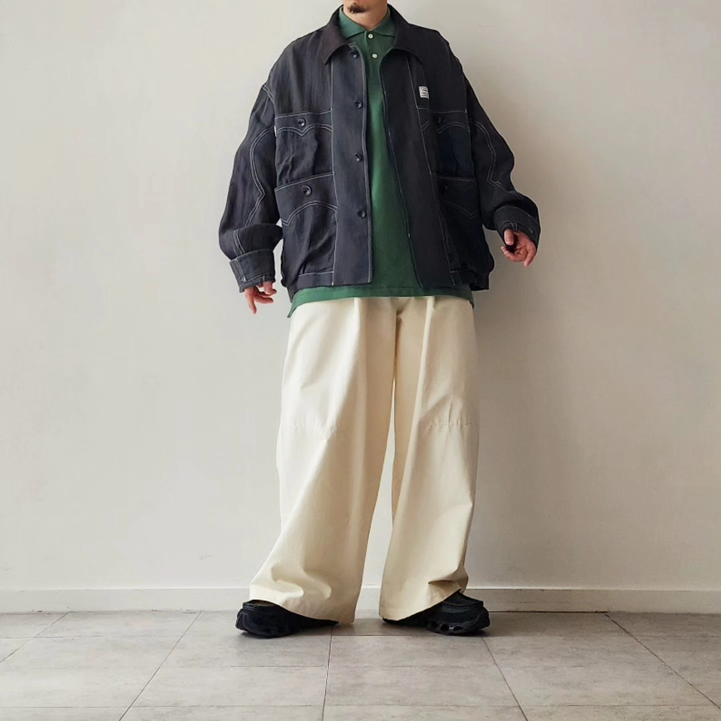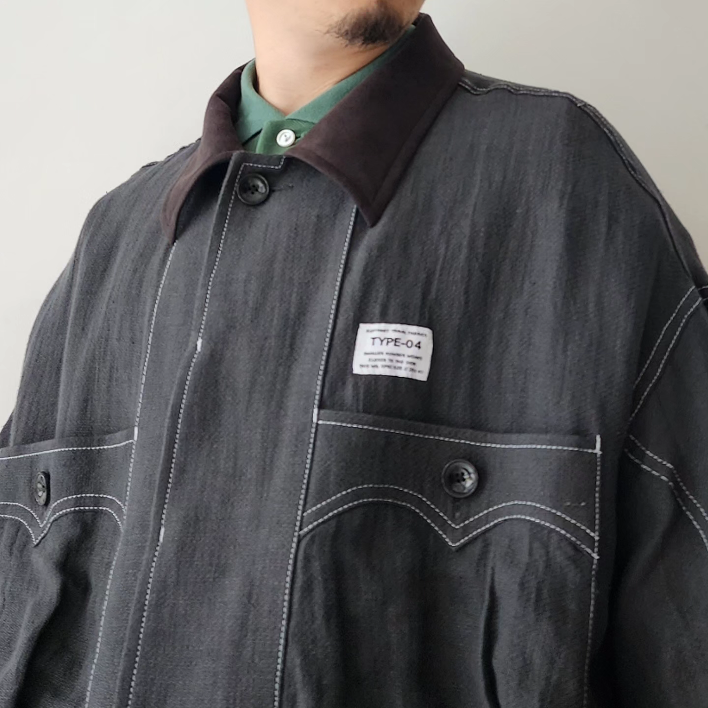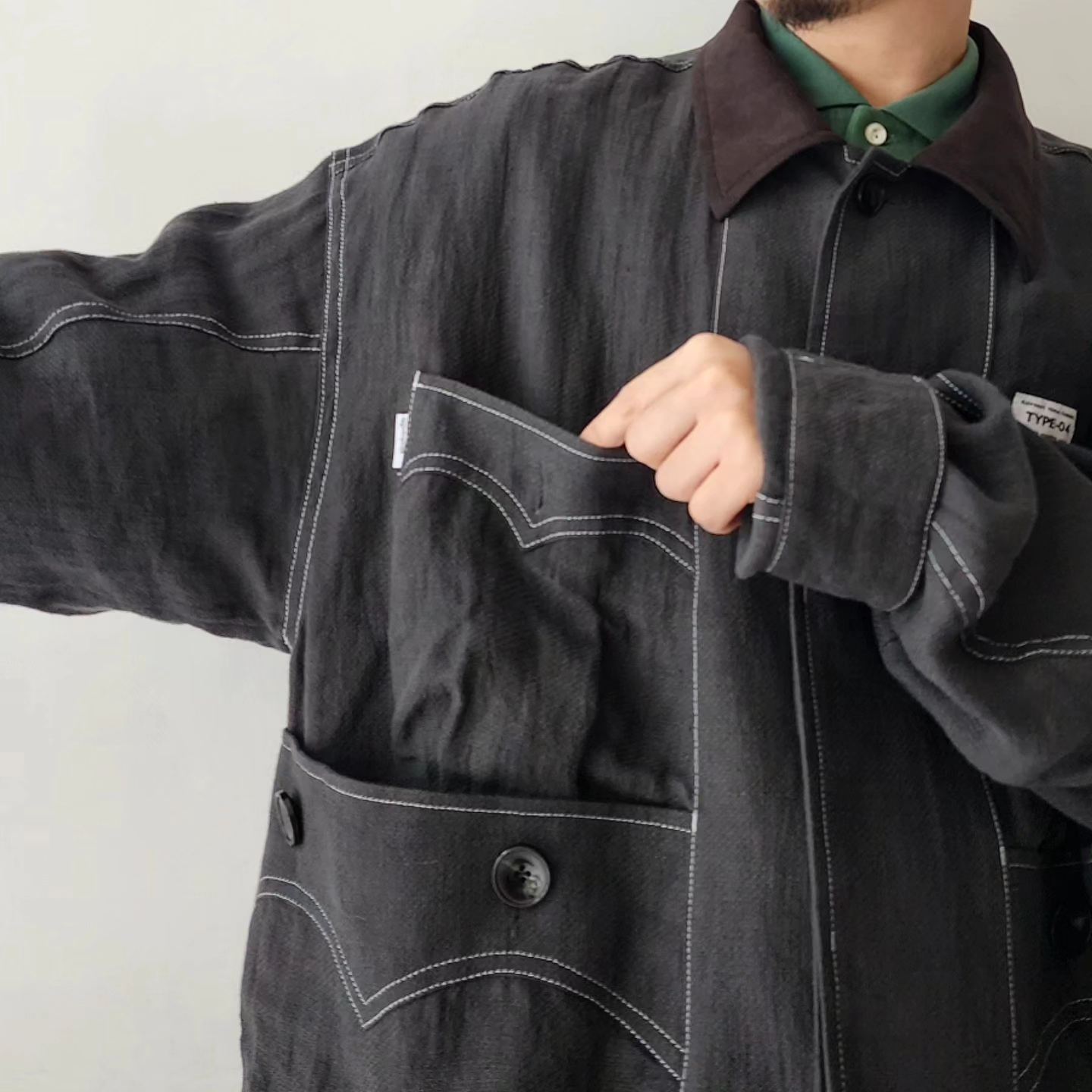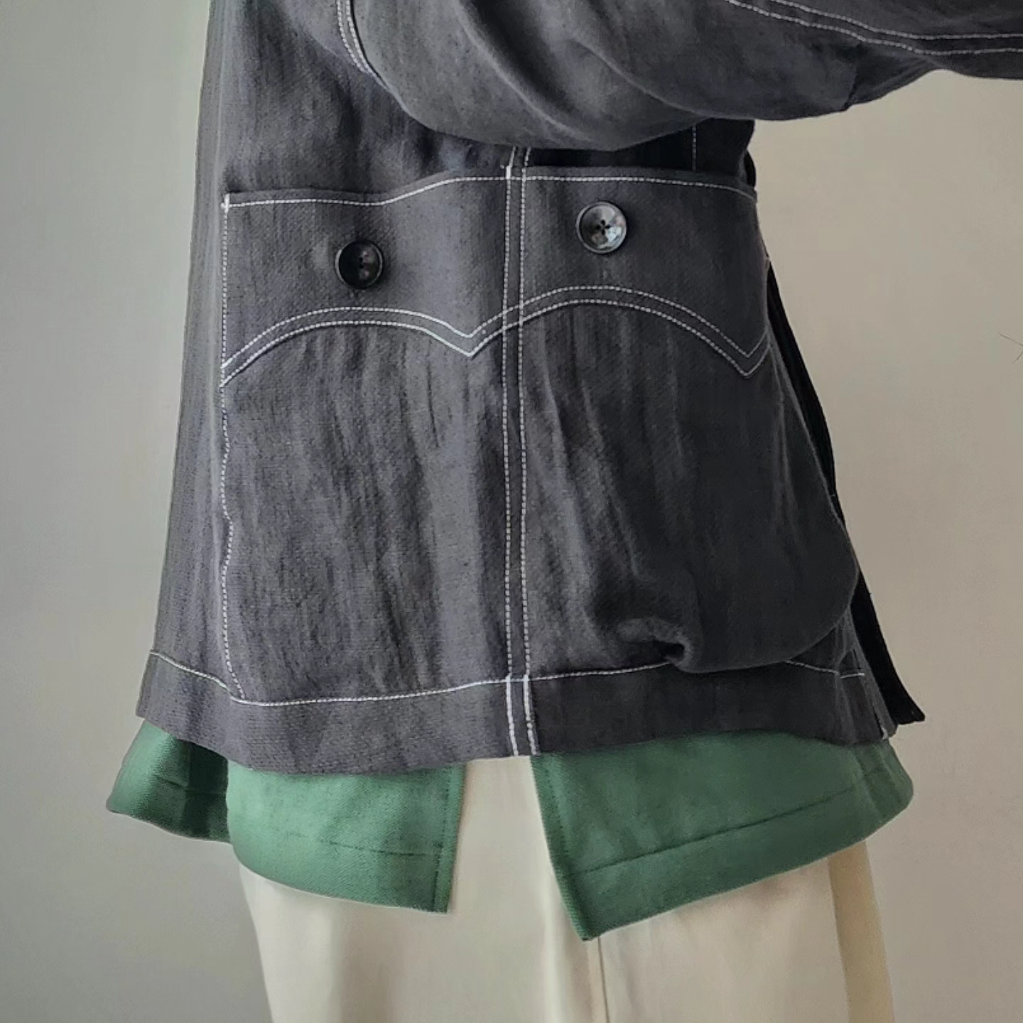 -Inspired by the Cuban shirt, this item has been stripped of pin tucks, embroidery and other decorations. It has six large and small 3D pockets with darts, giving it more storage capacity than a traditional Cuban shirt. The silhouette is boxy with wide armholes. The pockets and sleeves have seagull-shaped details, updating the earthy feel of the original Cuban shirt to a softer impression.