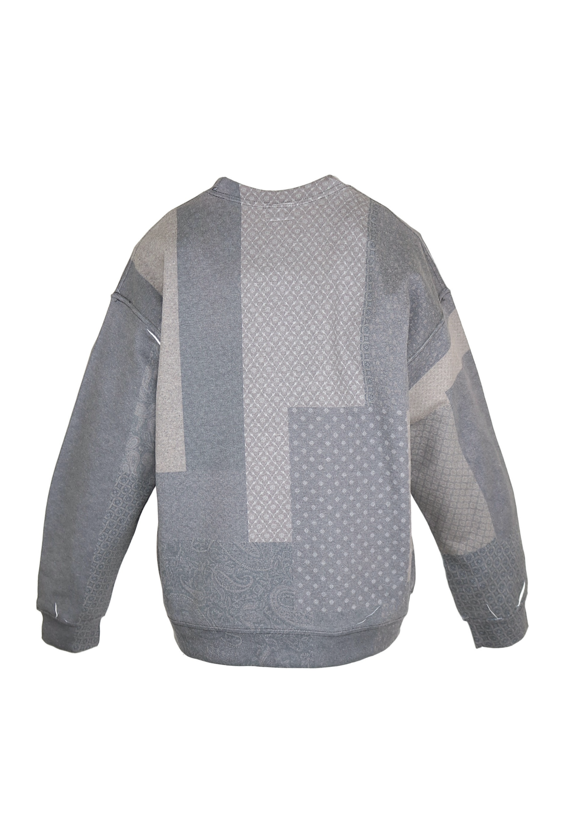 -Sweatshirt with backed fabric with sublimation transfer print on both sides. After printing, the scarf fabric is bonded and pressed. The contrast of fabric texture, color, and design is patchworked.