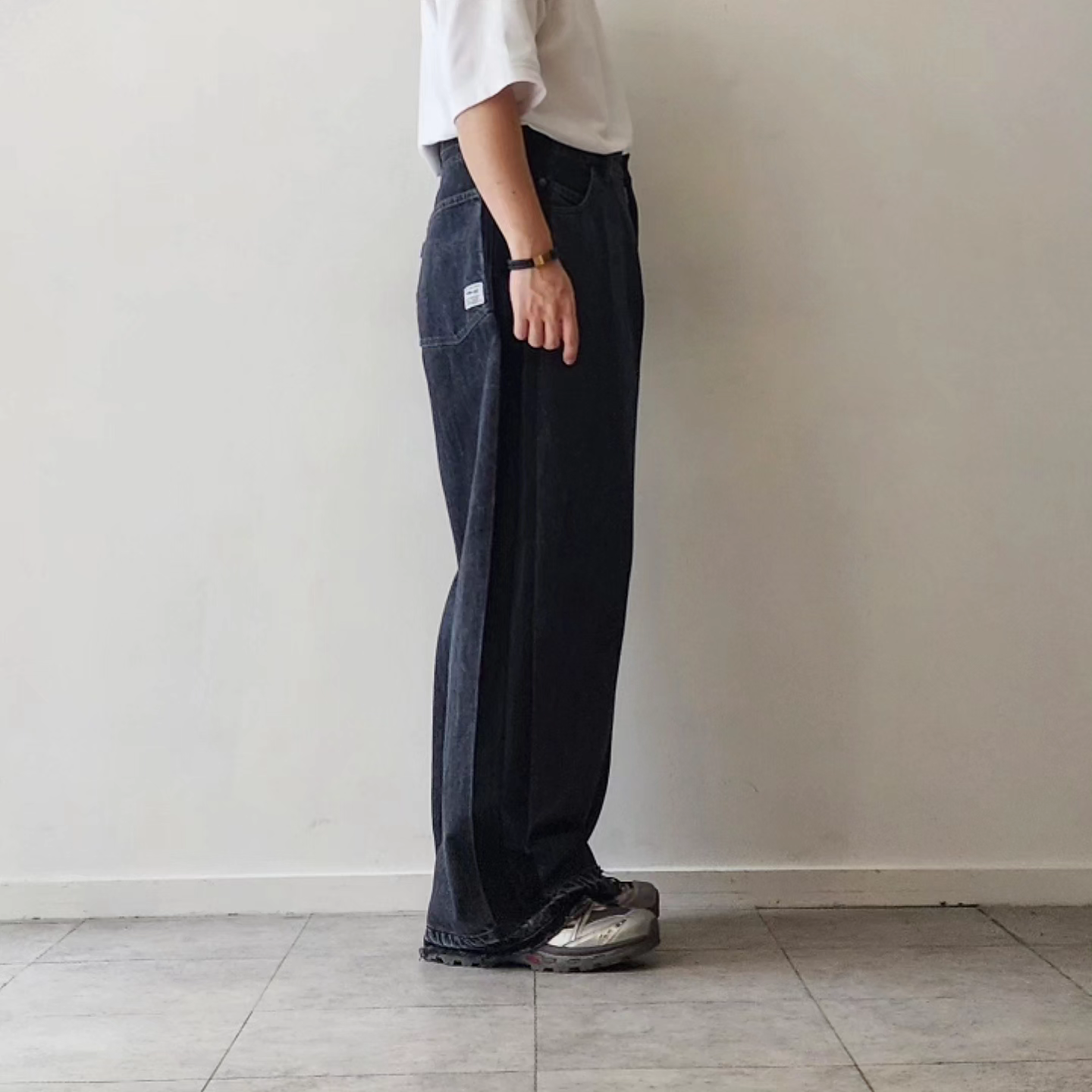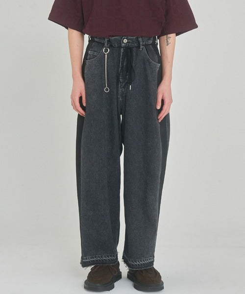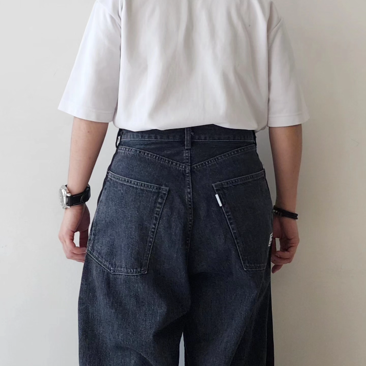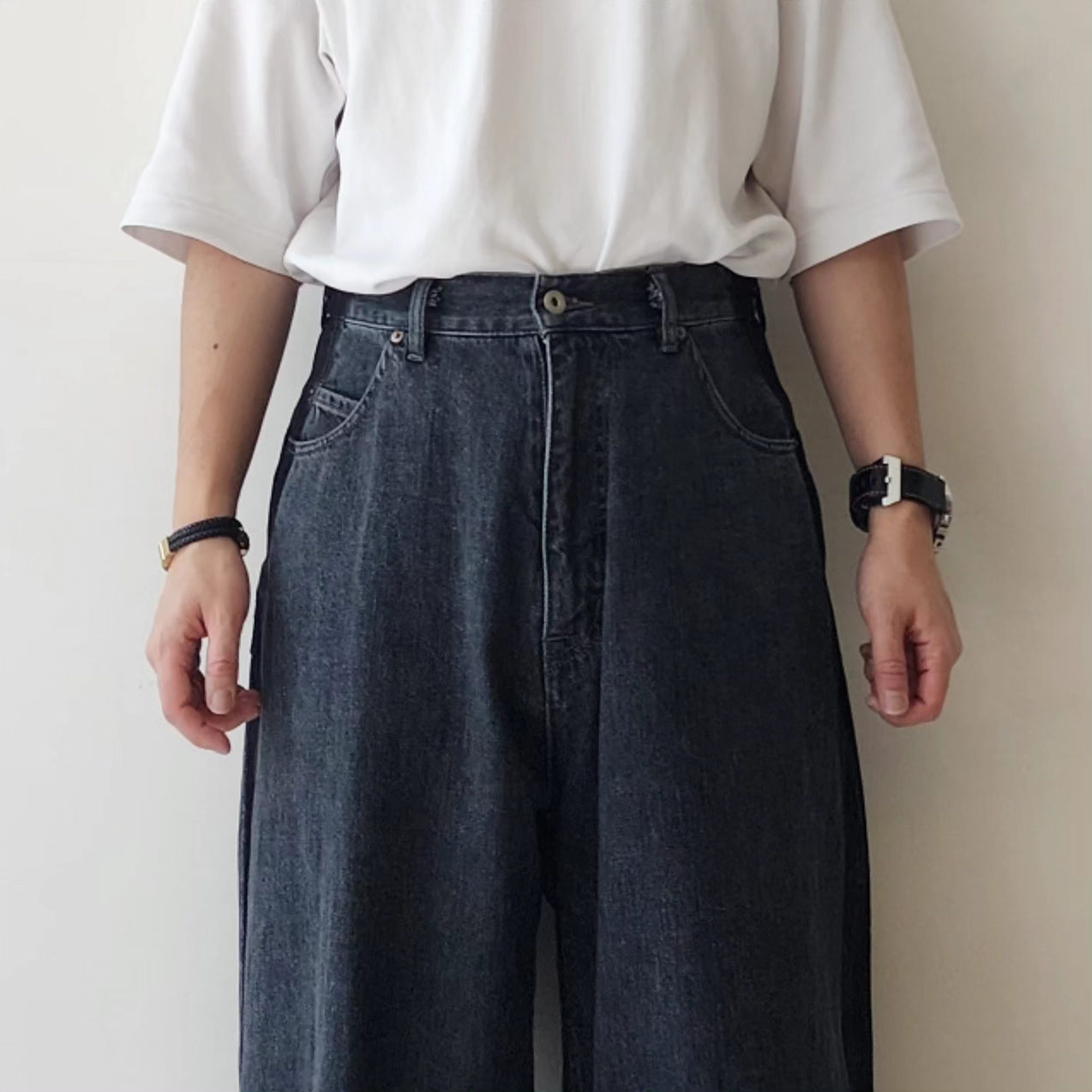 -The side lines, which are a distinctive feature of this item, are sewn and then temporarily secured with partial stitching. Then a stone bio wash process is applied, and the temporarily sewn parts are untied. The difference in color shading that occurs because there are no stone marks from the processing process is utilized to create the shape.