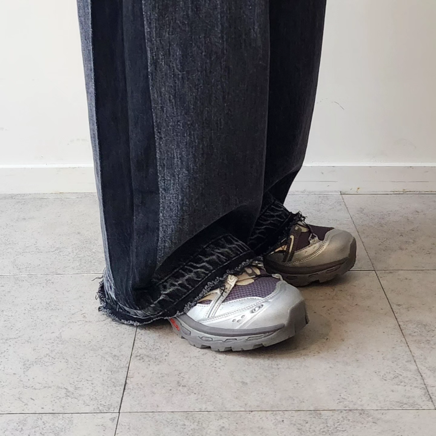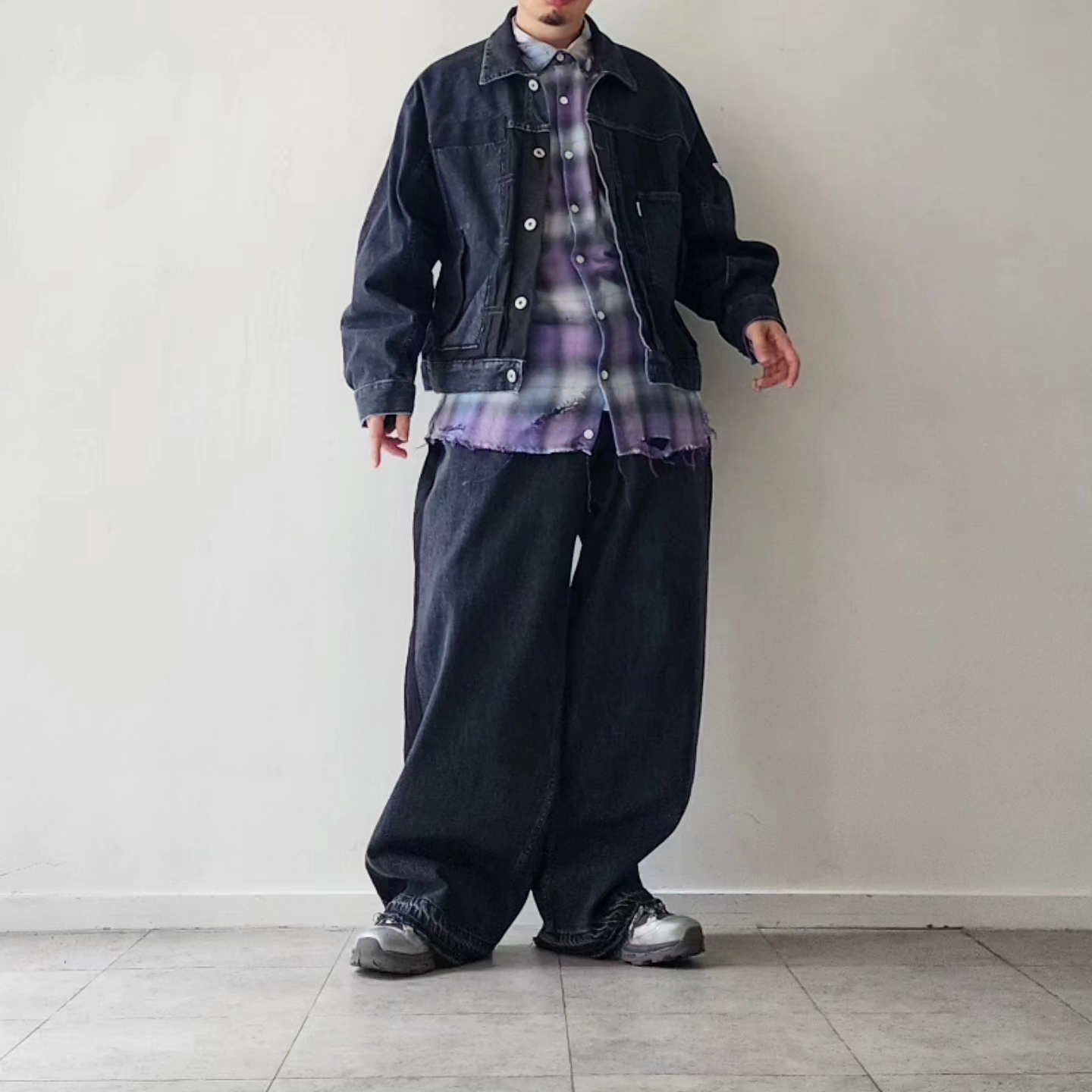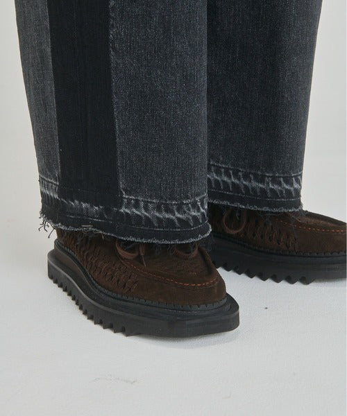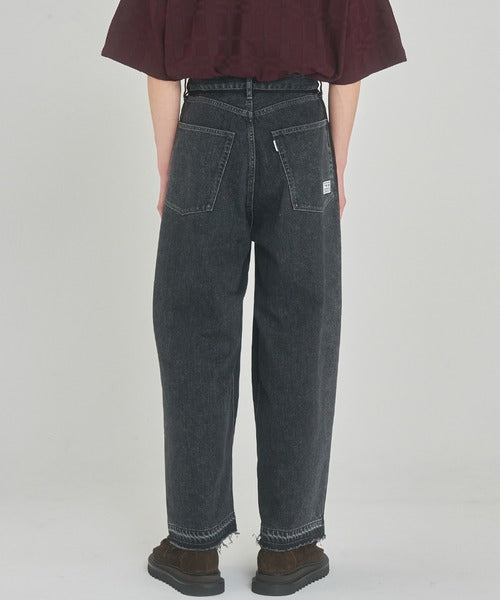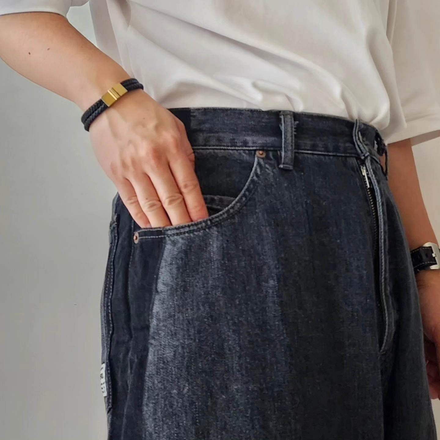 -The side lines, which are a distinctive feature of this item, are sewn and then temporarily secured with partial stitching. Then a stone bio wash process is applied, and the temporarily sewn parts are untied. The difference in color shading that occurs because there are no stone marks from the processing process is utilized to create the shape.