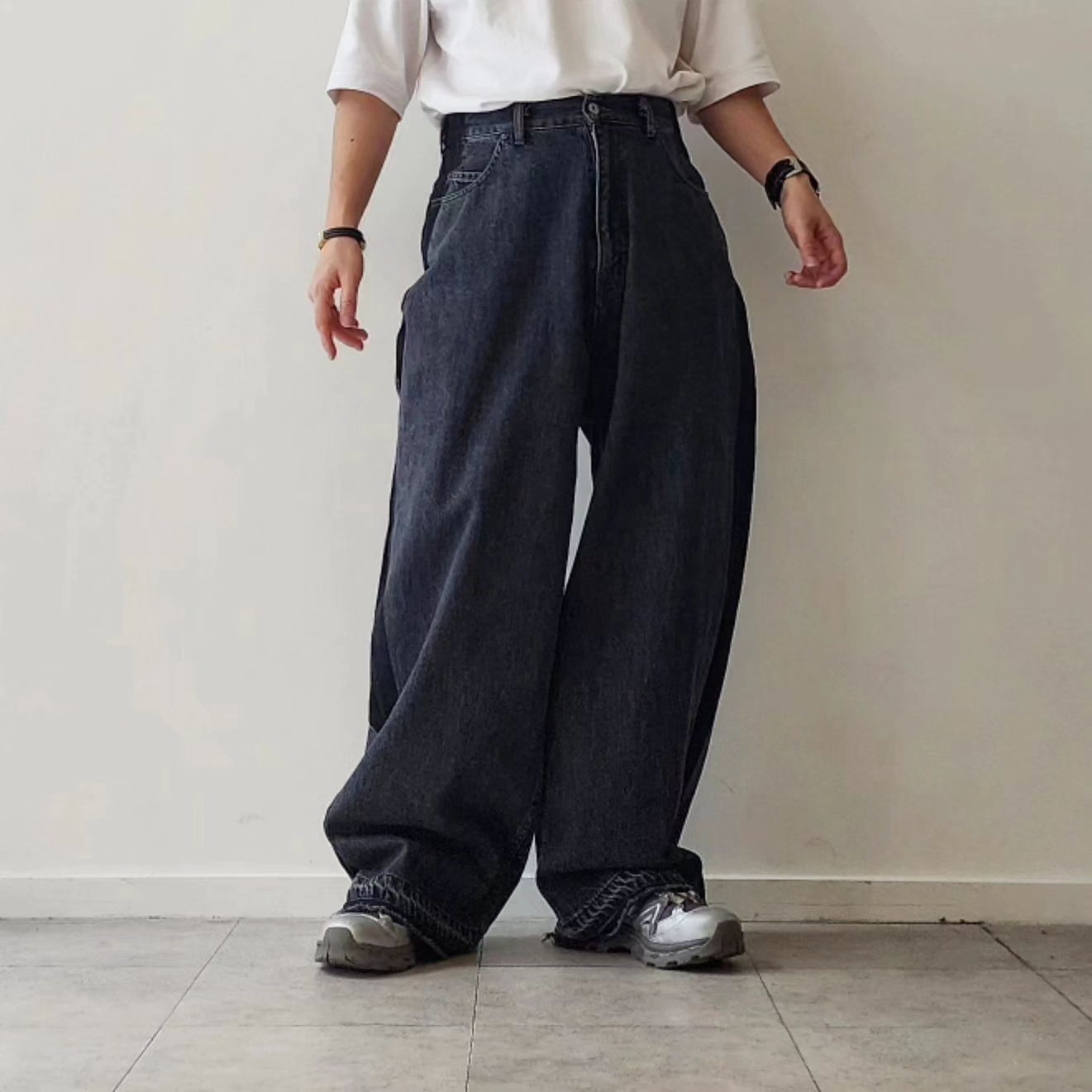 -The silhouette is patterned to look like extremely large denim pants with a tight belt around the waist.