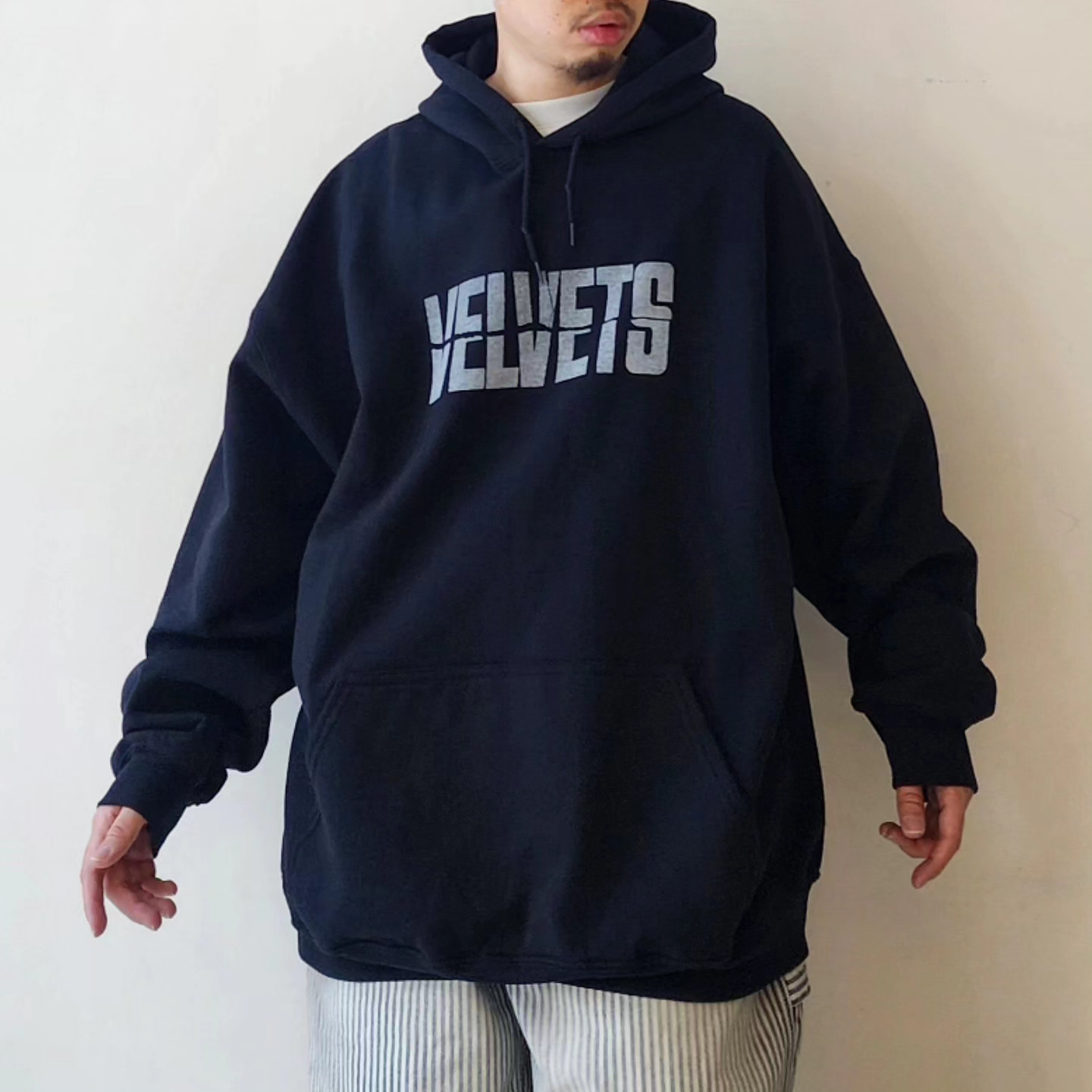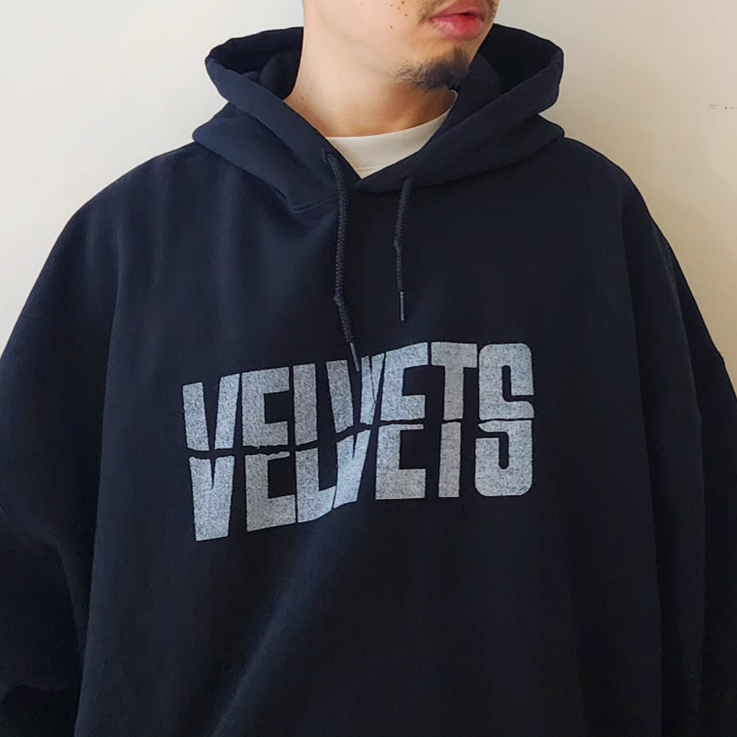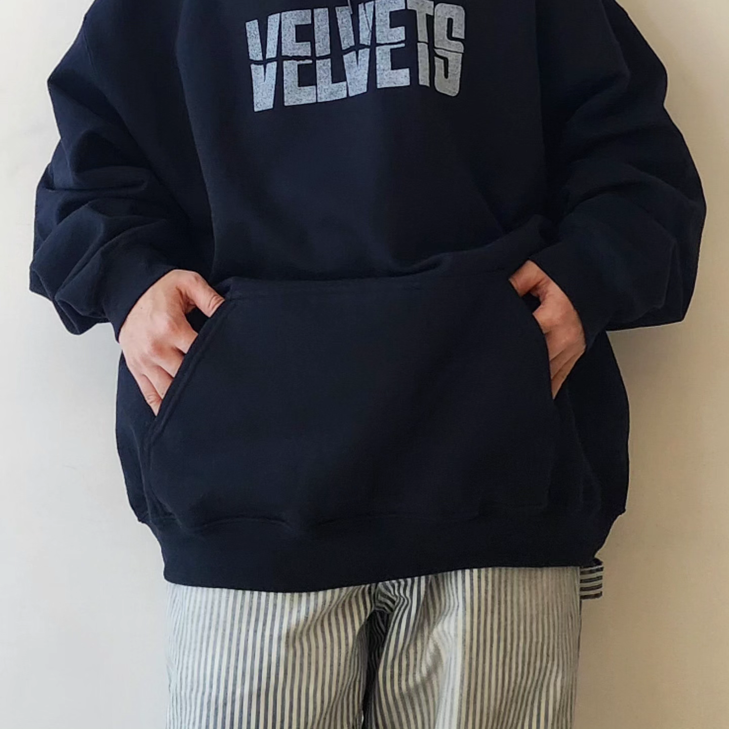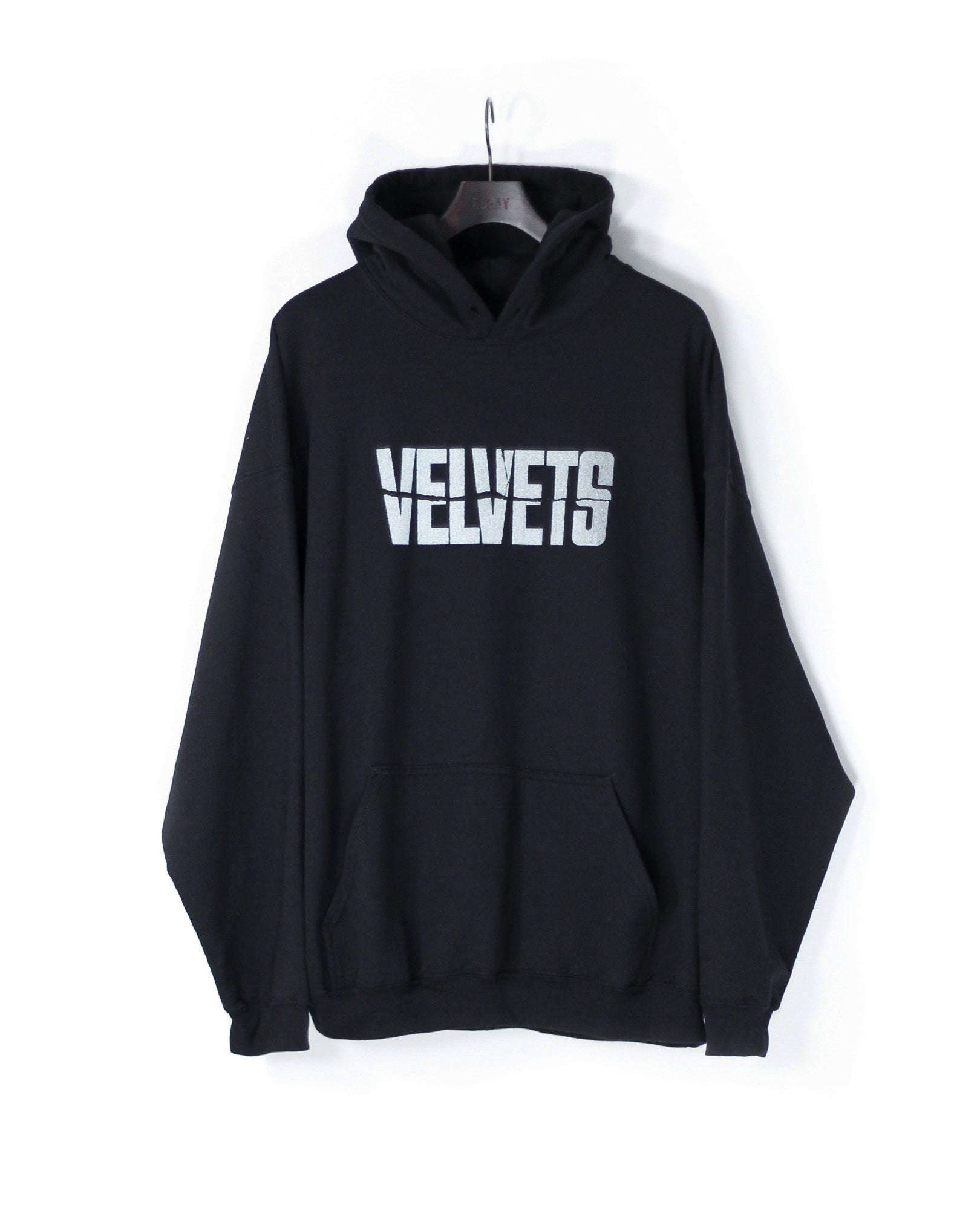 -An oversized black hoodie made of comfortable 8.0oz heavy blend cotton polyester fabric and printed USED. An eye-catching "VELVETS" print on the front. Inspired by The Velvet Underground's "Heroin," "Run Run Run," and "Sunday Morning." Relaxed silhouette with a relaxed fit and dropped shoulders. Kangaroo pocket on the front. The texture of the silk screen print may vary slightly depending on the individual item.