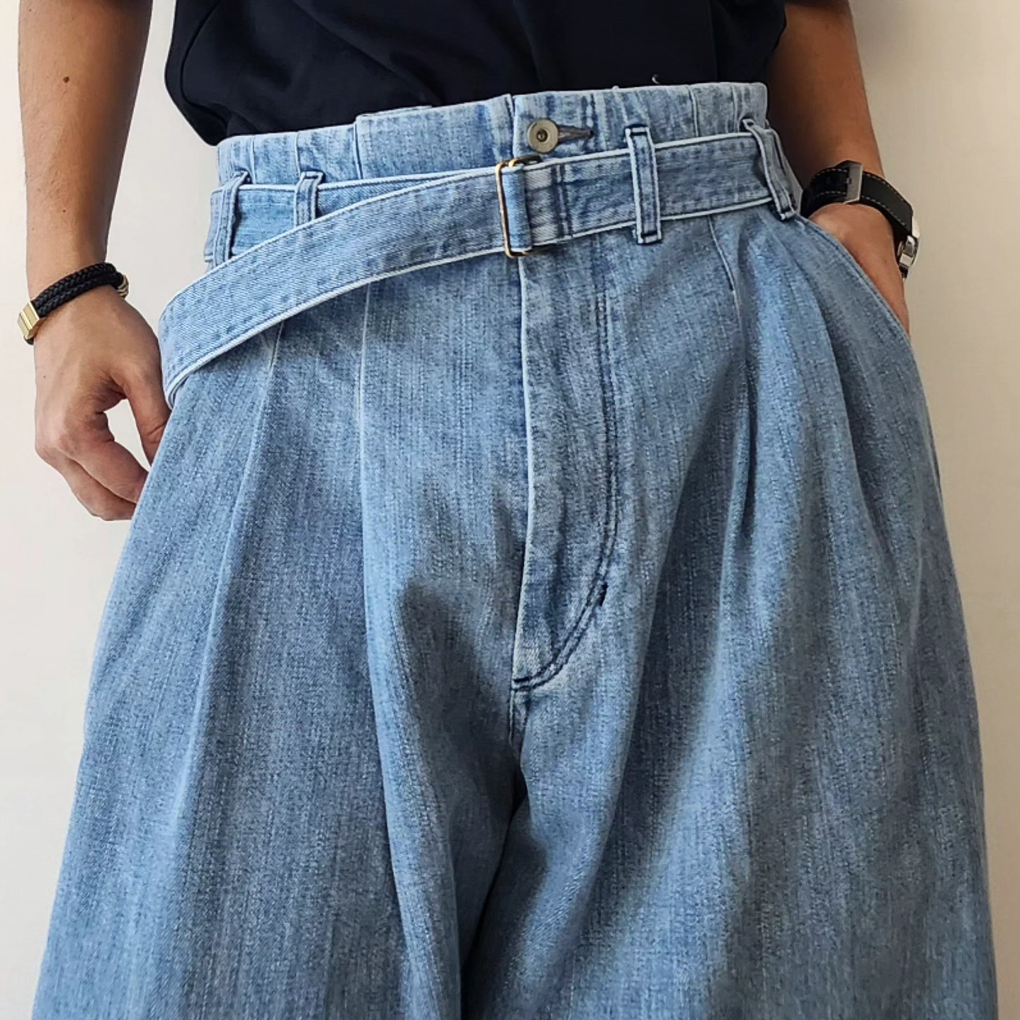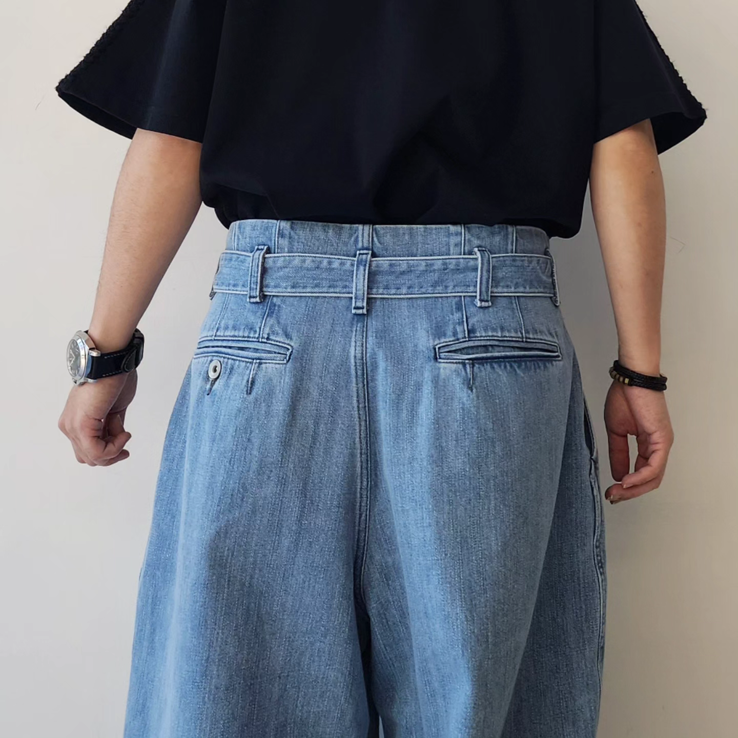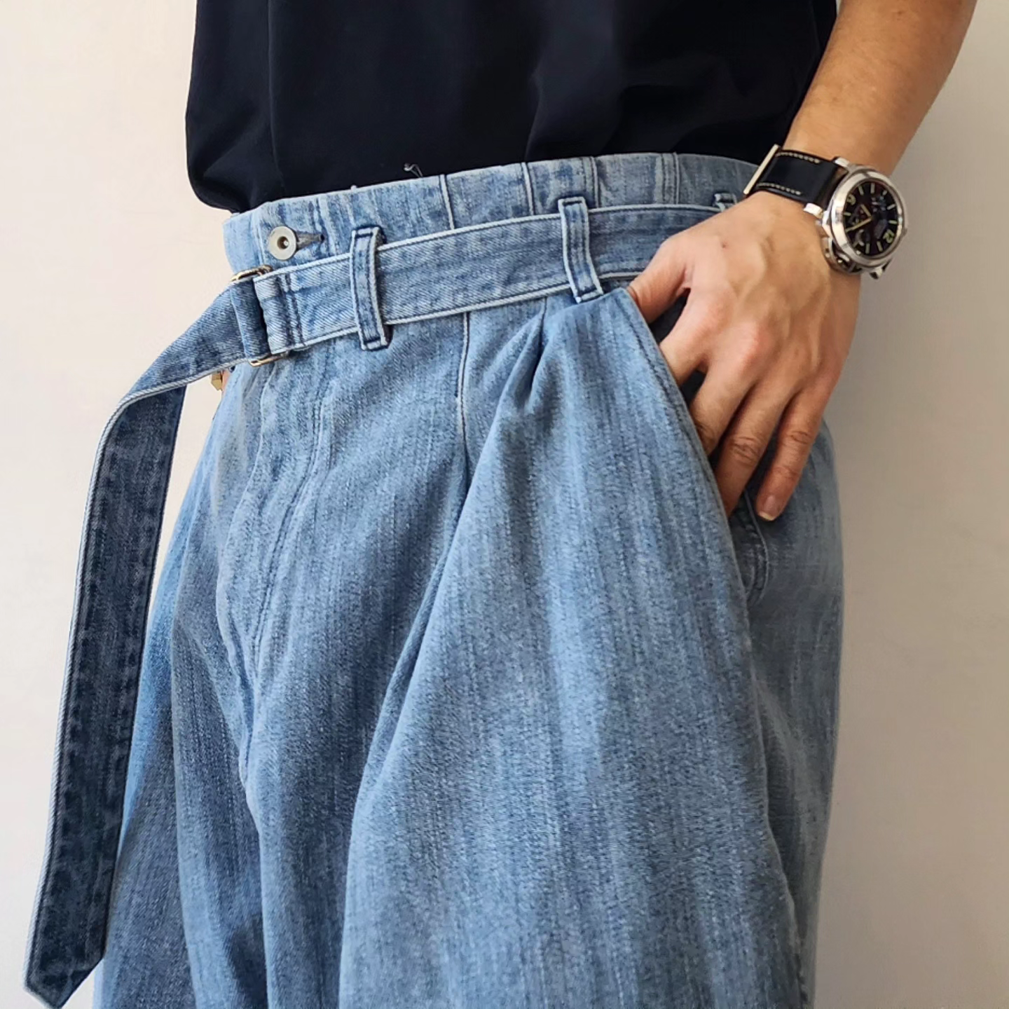 -Hakama denim pants wondrously constructed in a 13oz highly bleached denim, pleated sharply at the right side that falls to a wider leg from a belted waist. A loose look inspired by traditional Japanese hakama. Hakama trousers possess a up-lifting quality unique to ESSAY and carries the indigenous underground into a new golden age.