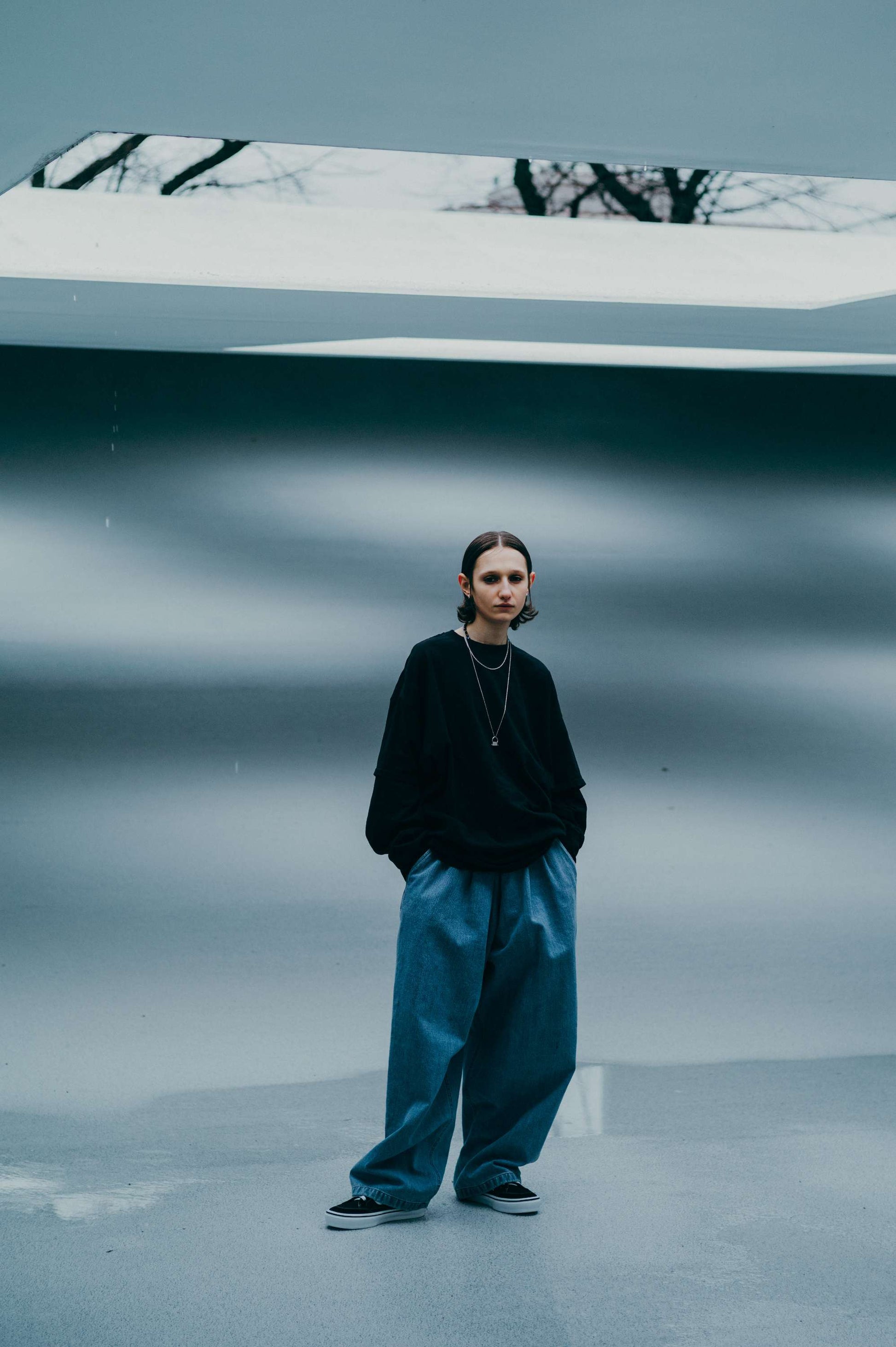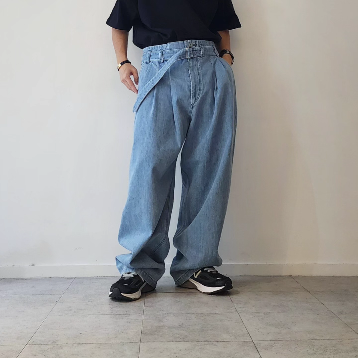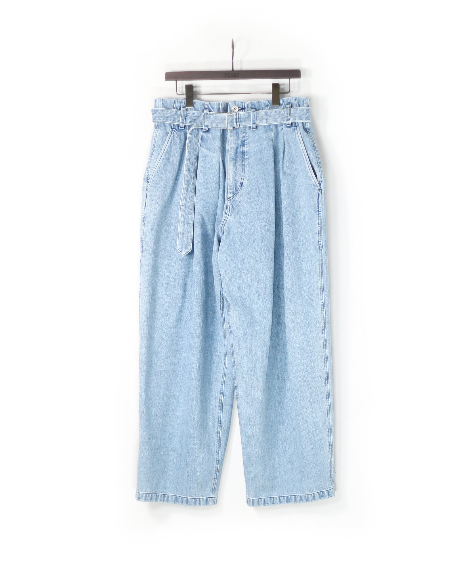 -Hakama denim pants wondrously constructed in a 13oz highly bleached denim, pleated sharply at the right side that falls to a wider leg from a belted waist. A loose look inspired by traditional Japanese hakama. Hakama trousers possess a up-lifting quality unique to ESSAY and carries the indigenous underground into a new golden age.