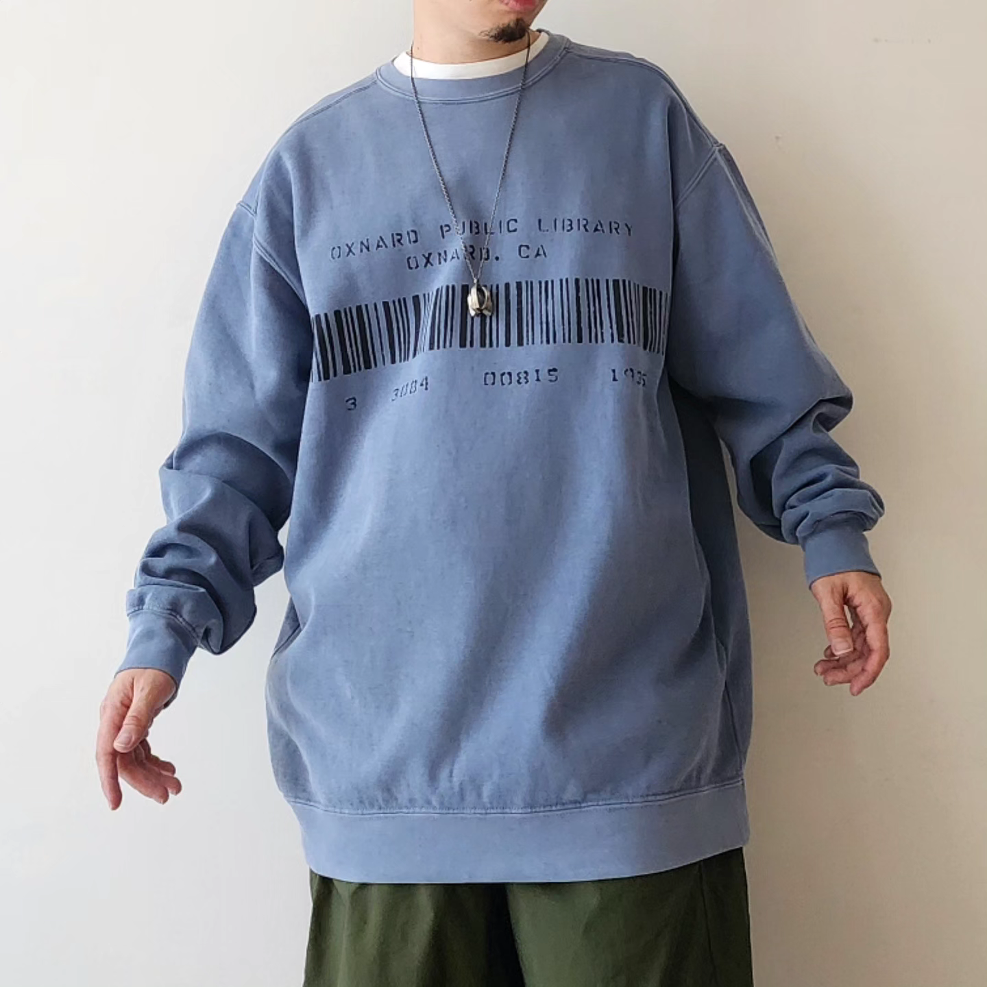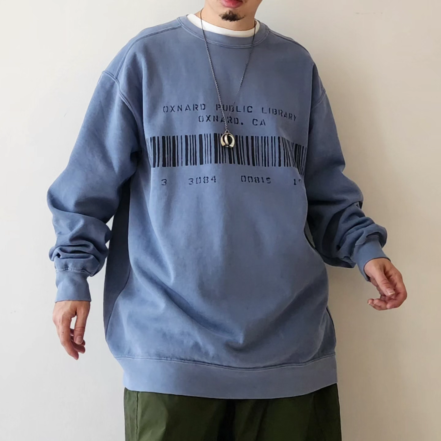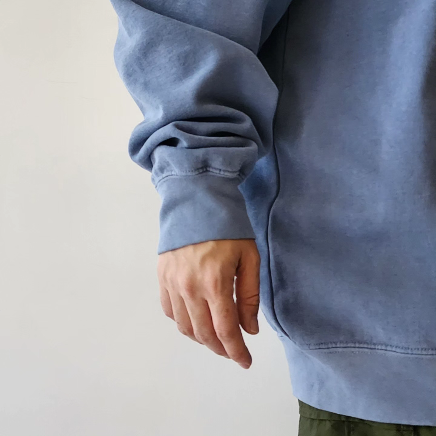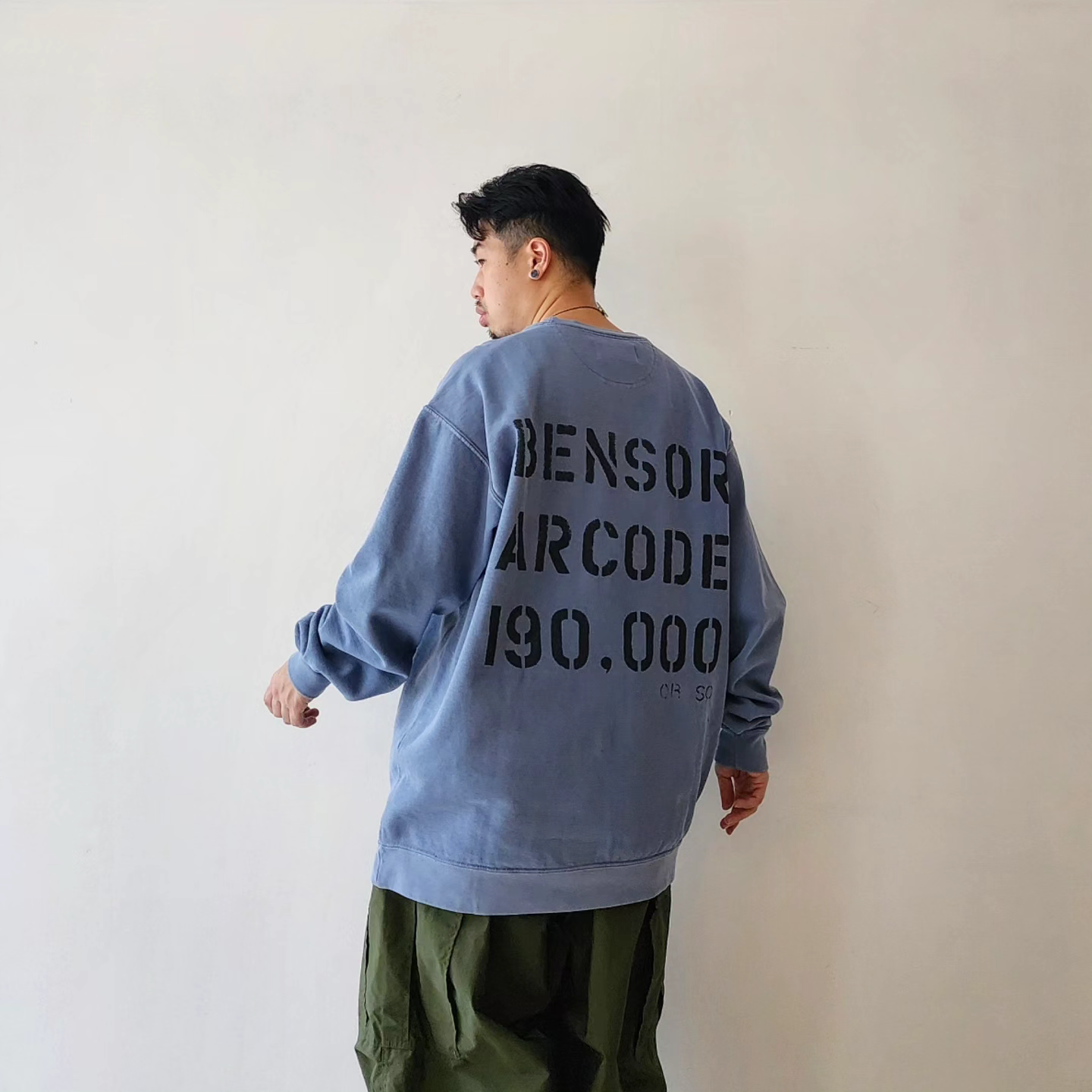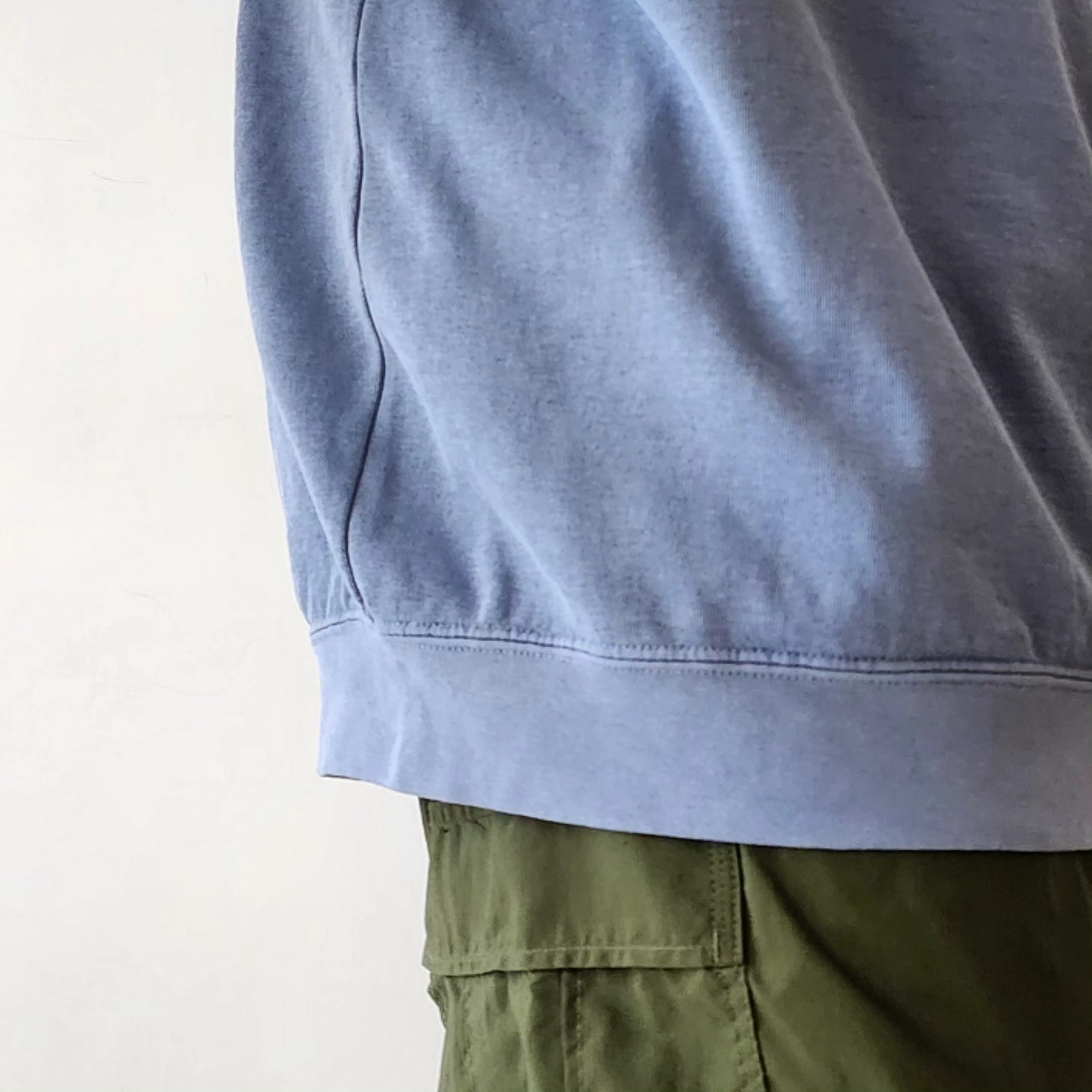 -ESSAY's new pigment sweatshirt. Pigment fleece sweatshirt with a dry feel. The product is dyed with pigments, which fades with each wash and creates a texture that becomes more appealing. It has a print. We refer to the graphics of vintage T-shirts to express graphics unique to second-hand clothing. With repeated washing, the print will blend into the body and transform into an old sweatshirt with a nice texture. Wide neckline and oversized silhouette. A unisex item with a one-size-fits-all BIG silhouette.