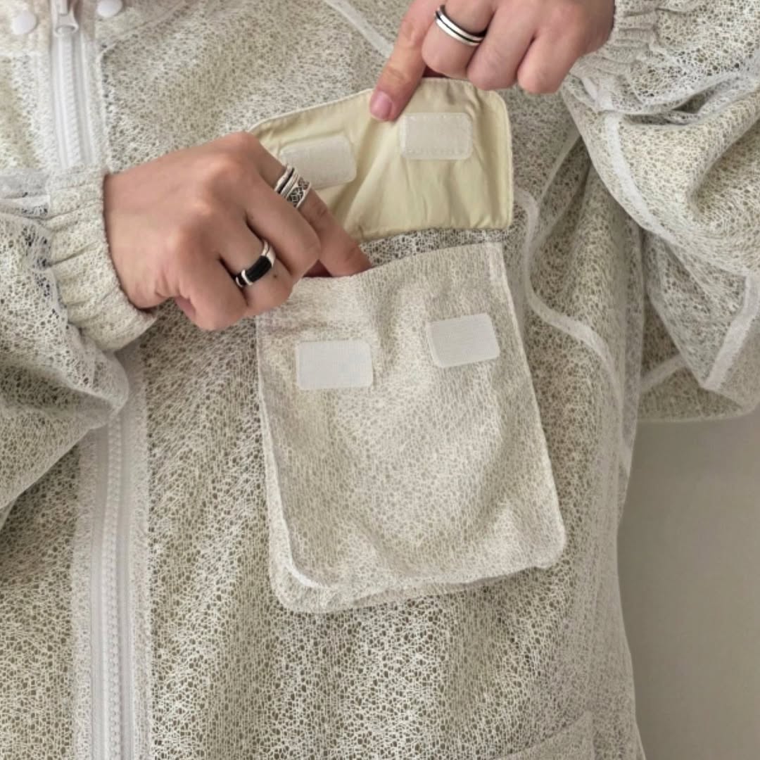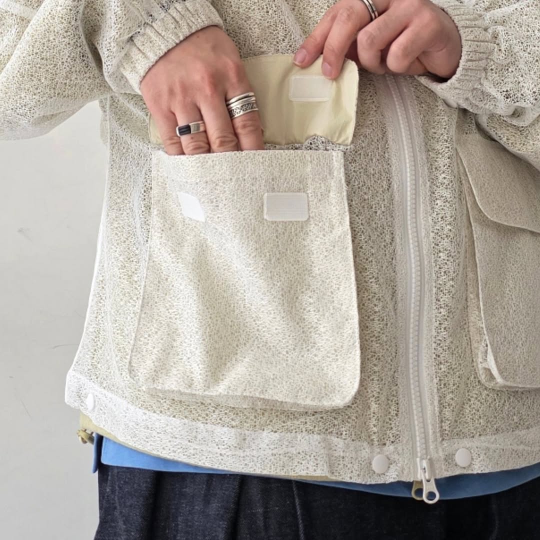 Made of fine cotton, Australian wool, acrylic, Tencel, and nylon, woven together into a fabric. The garment is treated to a strong shrinkage process to ensure it retains its shape well, even after multiple wash cycles. The outer mesh layer is a 100% Polyester mesh fabric, adjustable toggles and 3D gusseted pockets detail this layer, which can also be worn separatley.