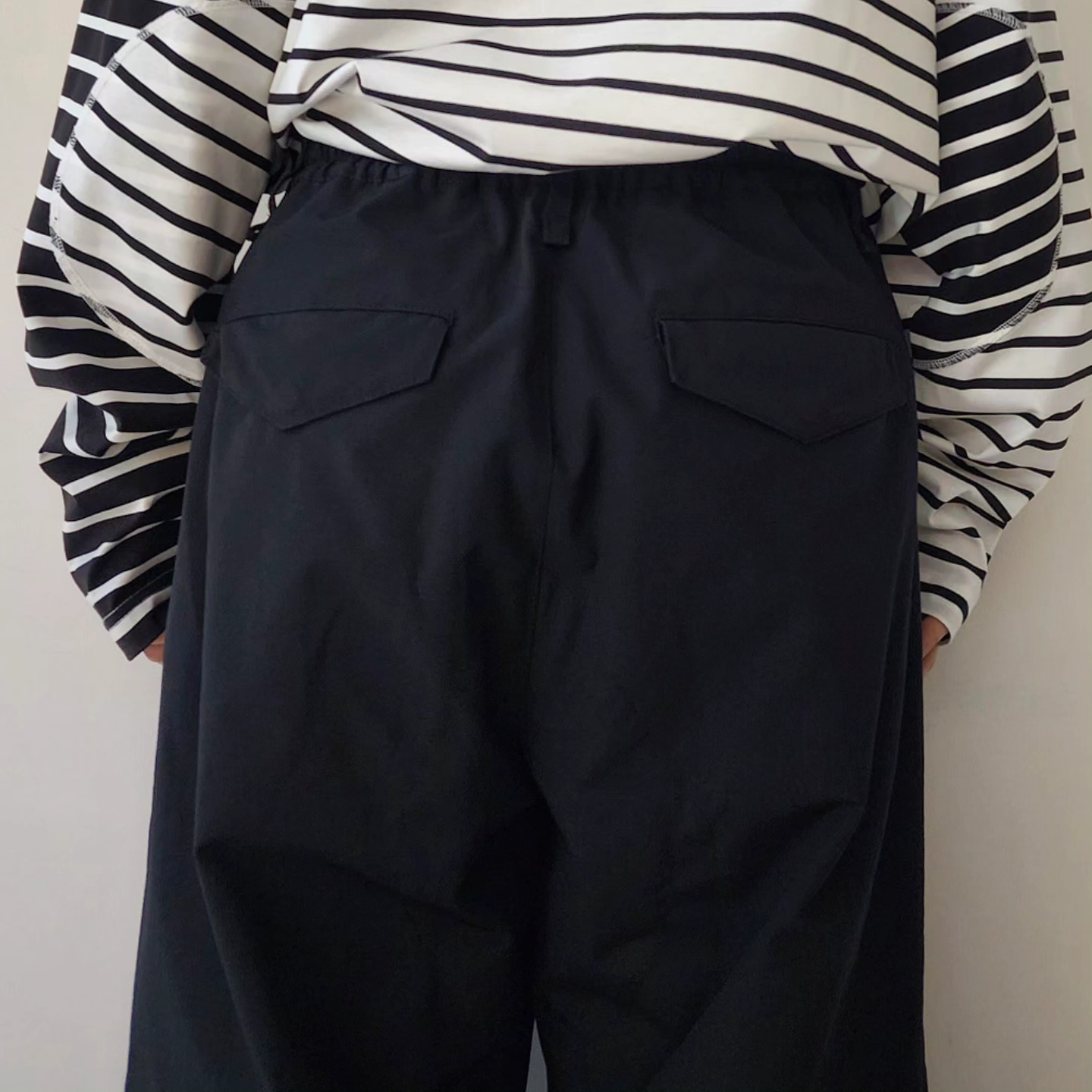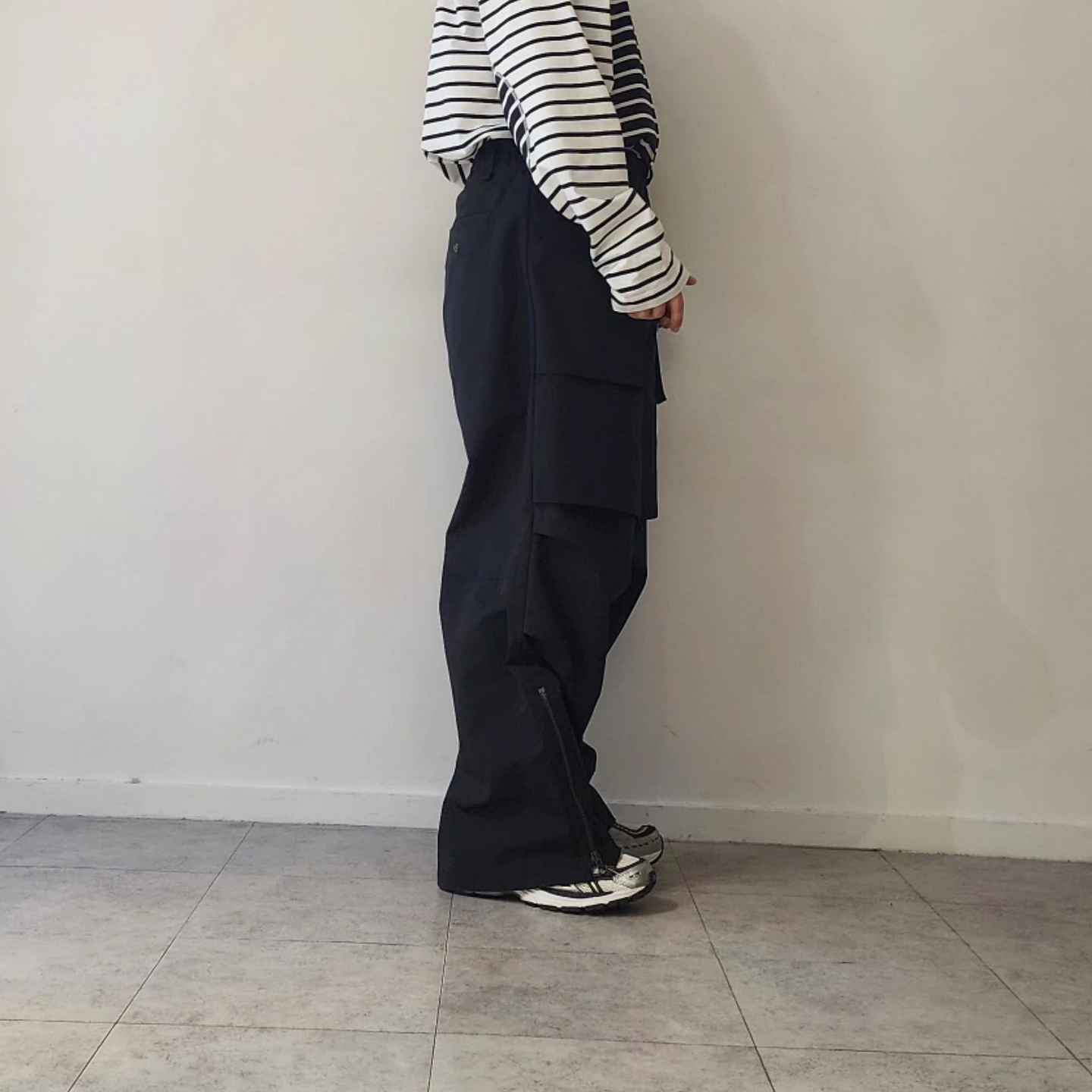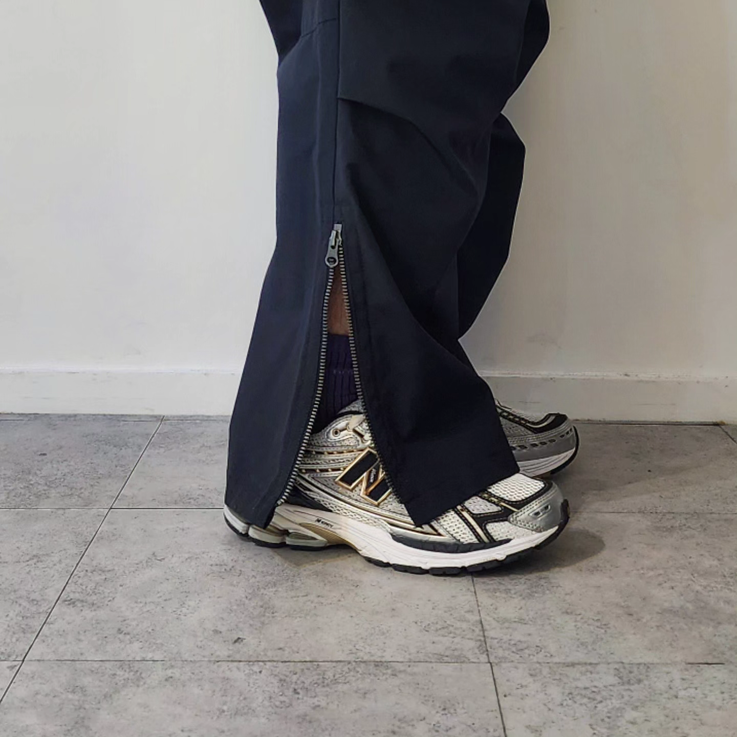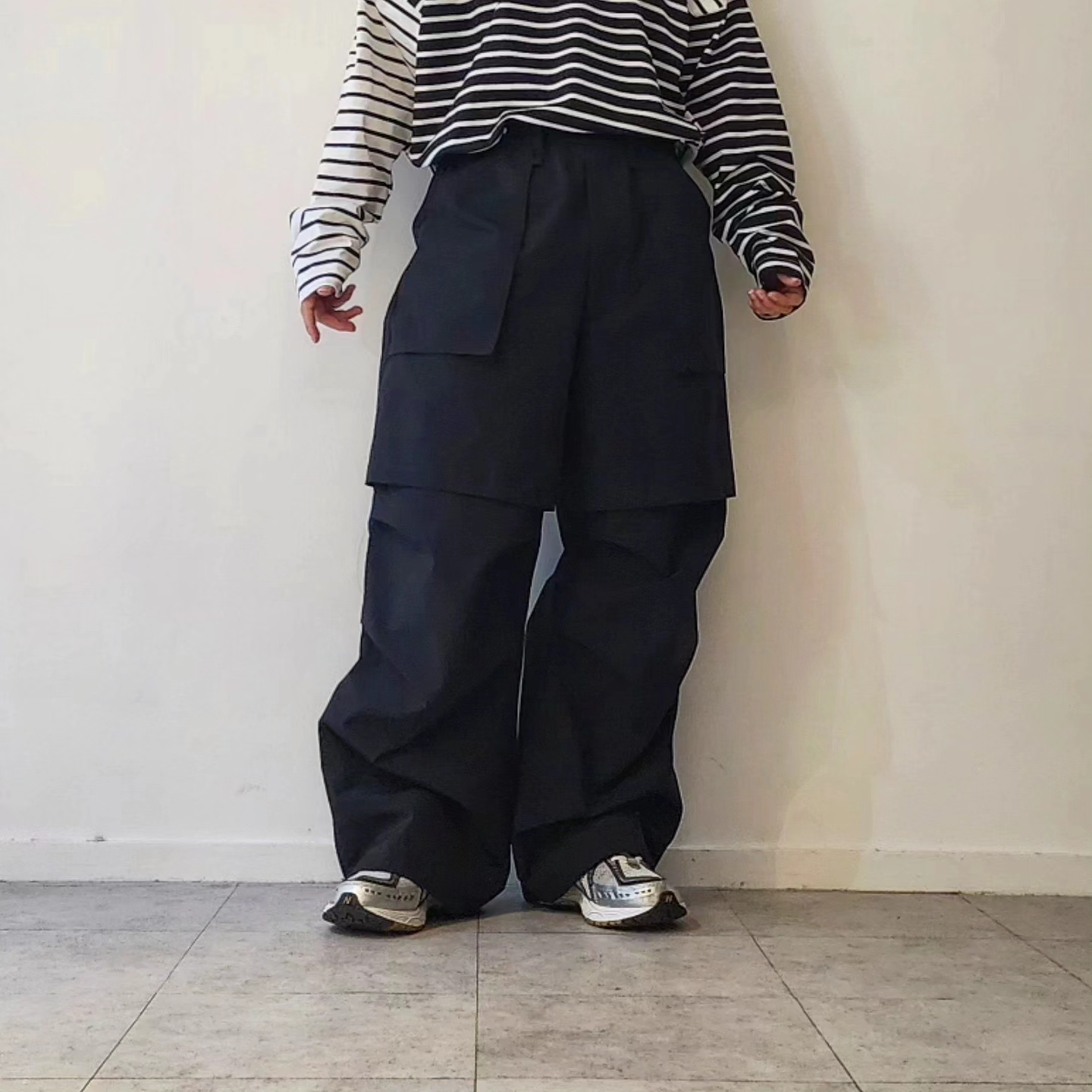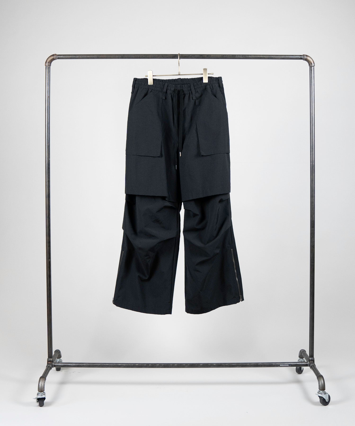 ■ Parachute pants with a layered gimmick on the front and a three-dimensional silhouette with knee tucks and side zips that are effective design points.