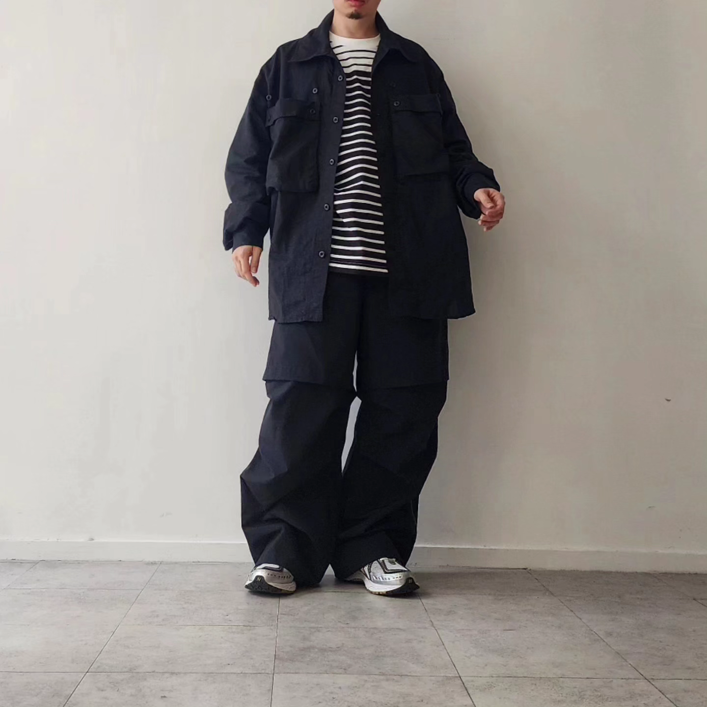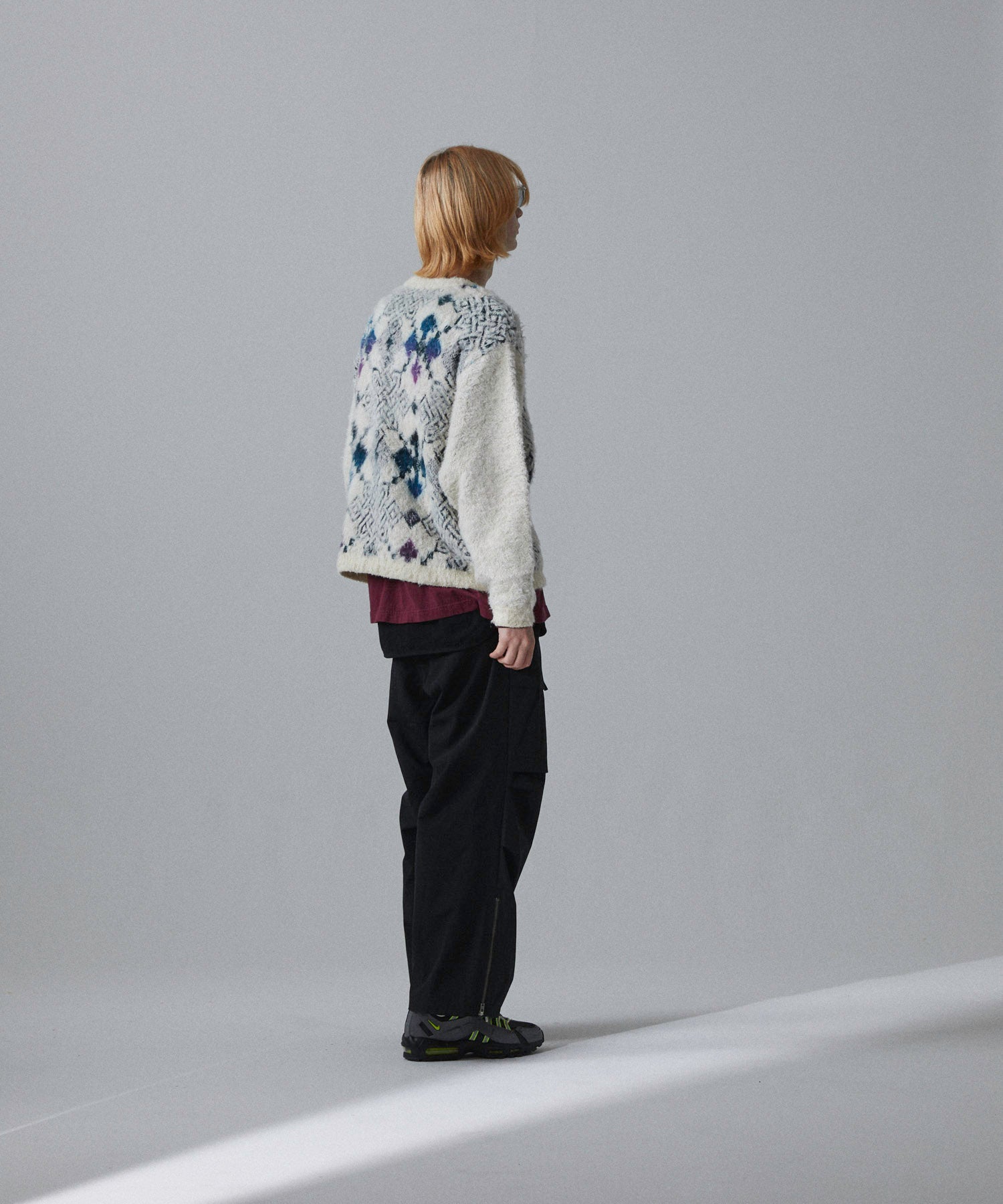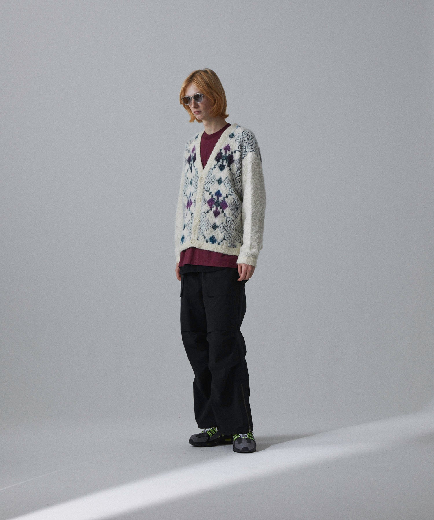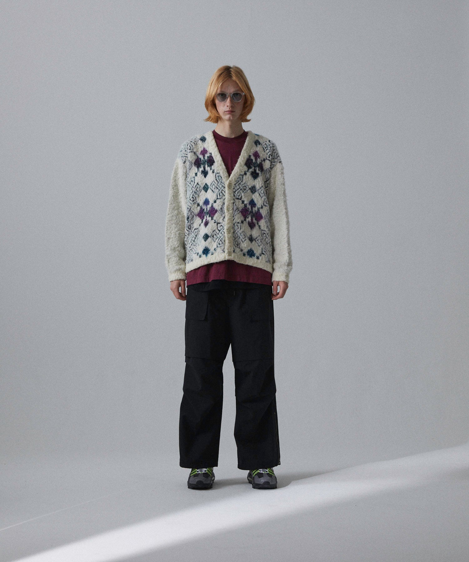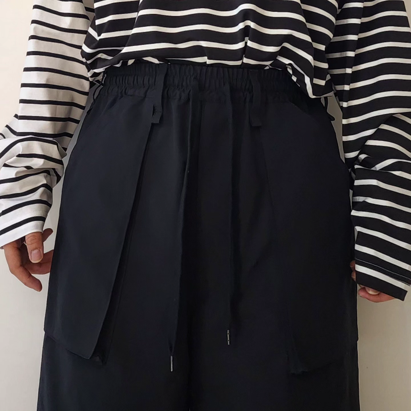 ■ Parachute pants with a layered gimmick on the front and a three-dimensional silhouette with knee tucks and side zips that are effective design points.