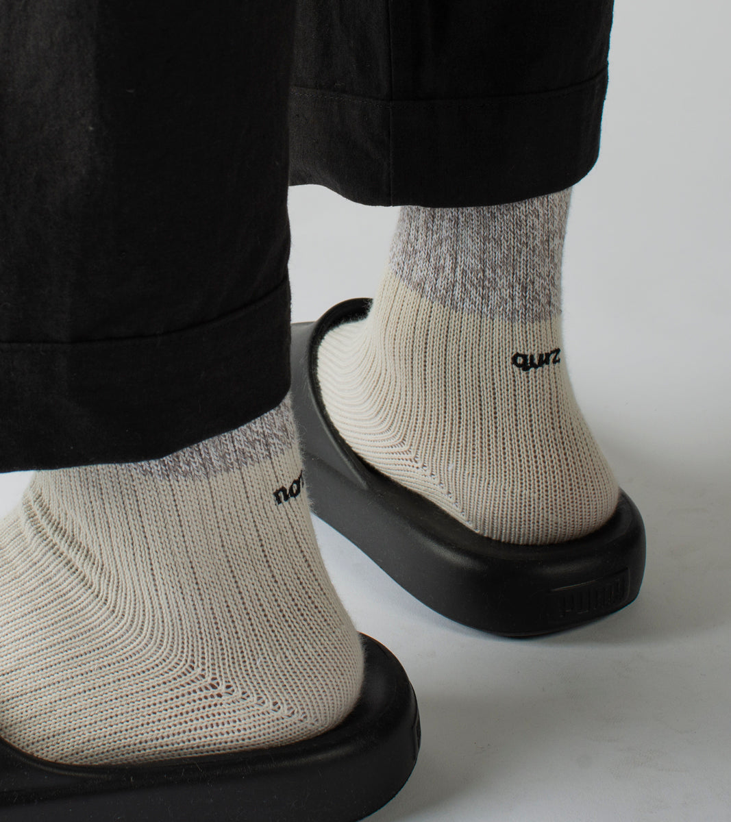 The simplistic texture and design positions the sock as an apparel item that can complement any outfit for the monochrome sock and mixed yarn structure to reveal itself in the small opening between shoes and pants.