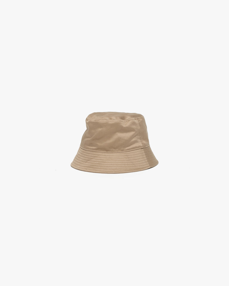 -Bucket hat with a minimal silhouette made at a fabric hat factory without widening the brim angle.