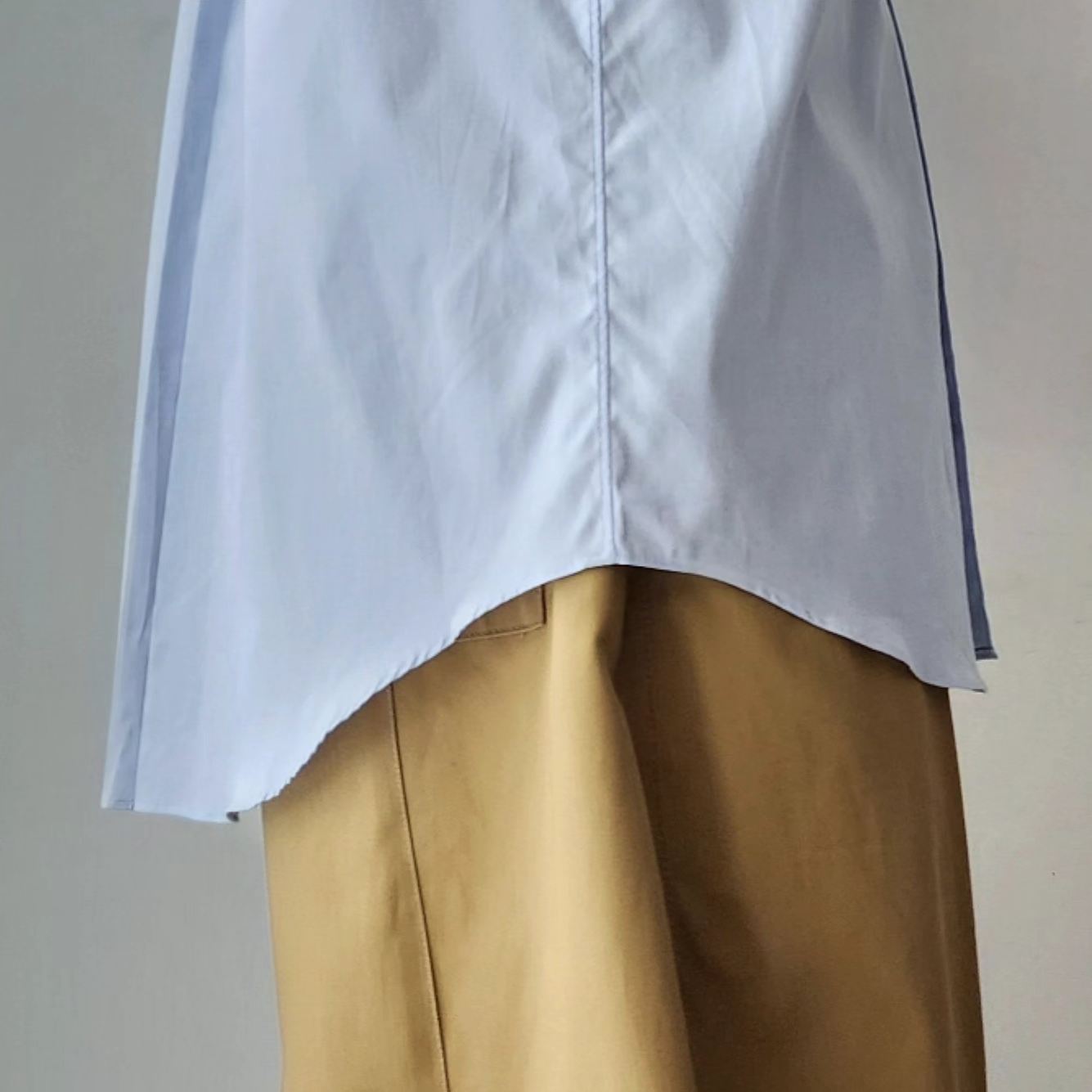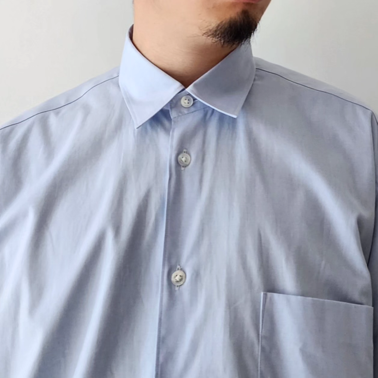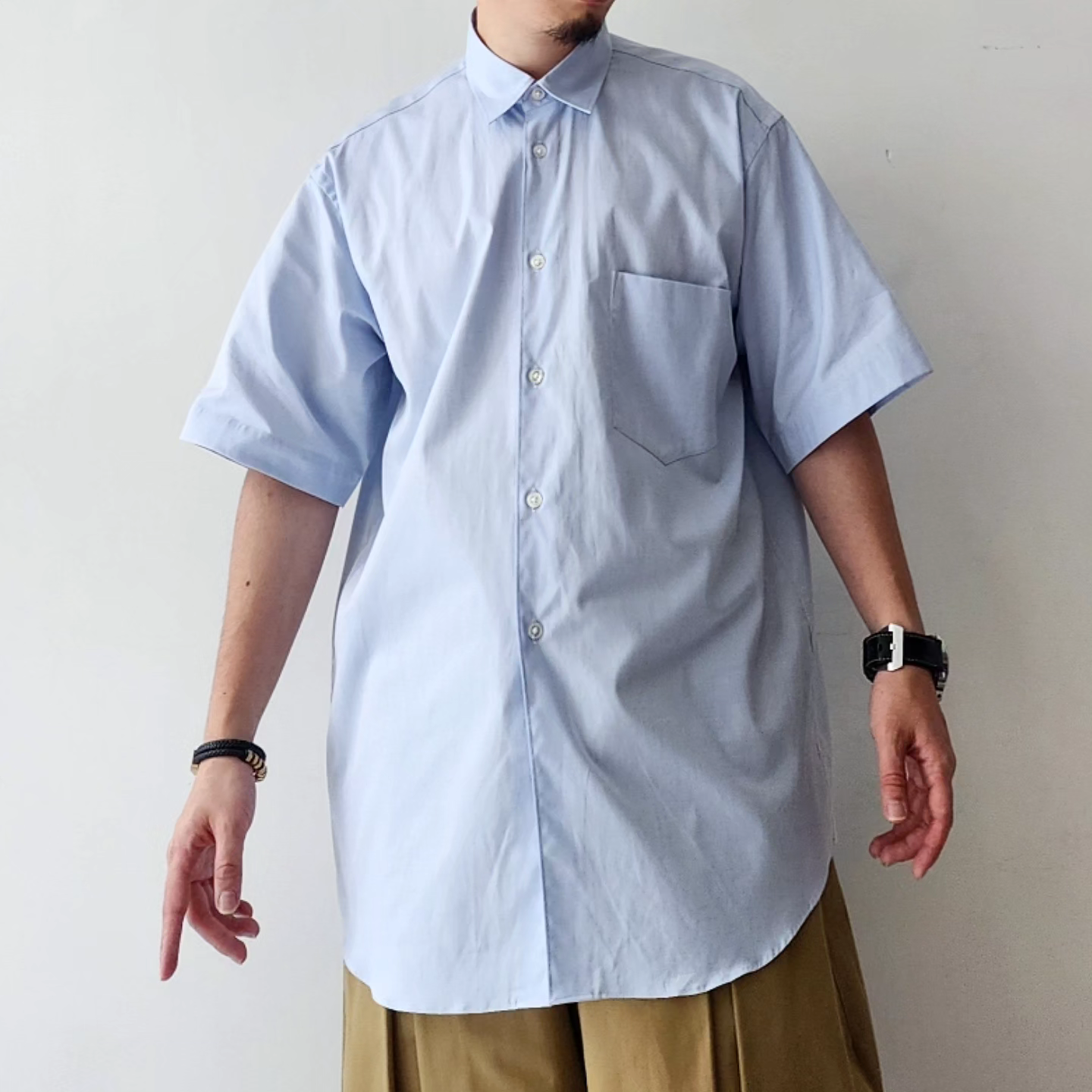 -A regular collar shirt inspired by a 1990s masterpiece by a French shirt label of a leading global fashion brand. A small collar is paired with a loose silhouette with a wide body, length and armholes. This short-sleeved version has a larger armhole than the long-sleeved version and uses thin mother-of-pearl buttons on the placket and cuffs. Sewing is done by a domestic factory that specializes in dress shirts.
