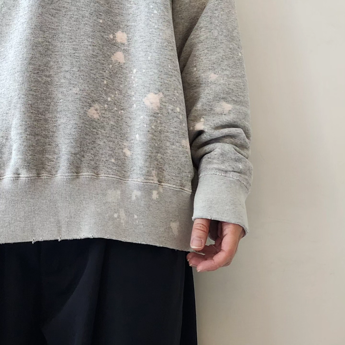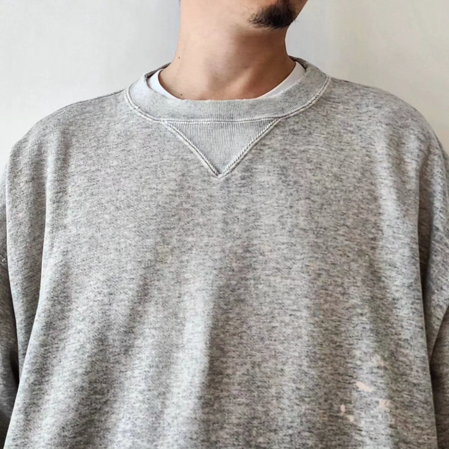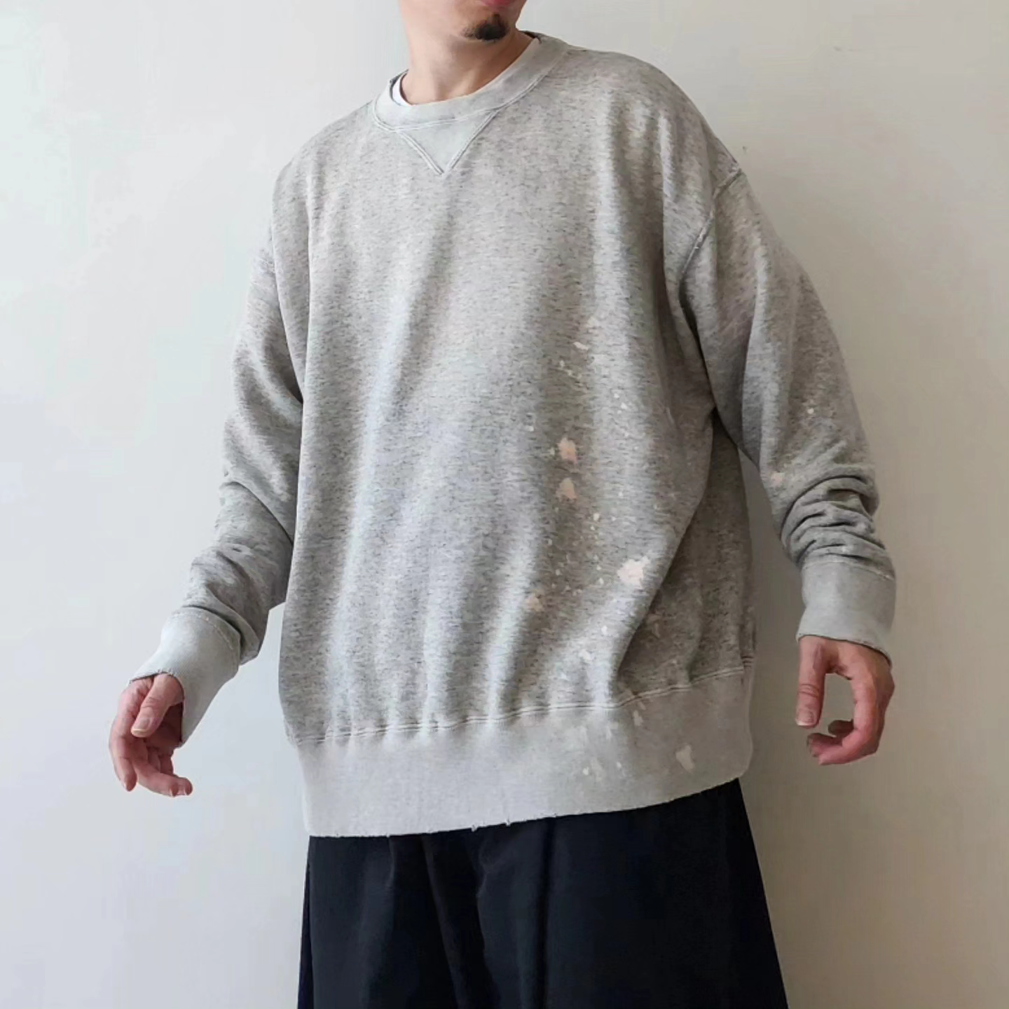 This double-V sweatshirt was inspired by the sweatshirts that physicist Albert Einstein liked to wear in his later years. The retro-style loop-knit fabric was knitted in Wakayama Prefecture, with a round body finish and original color, and then vintage-washed and processed. In addition to fading the color and adding small scratches to the entire body, a splash of bleach was added to the lower left corner, and a faded color reminiscent of sunburn was added to the back. The image is that it will change over time as if you were actually wearing it and working for many years. Can be worn with UNISEX. Due to the characteristics of the fabric, there may be differences in texture and size.